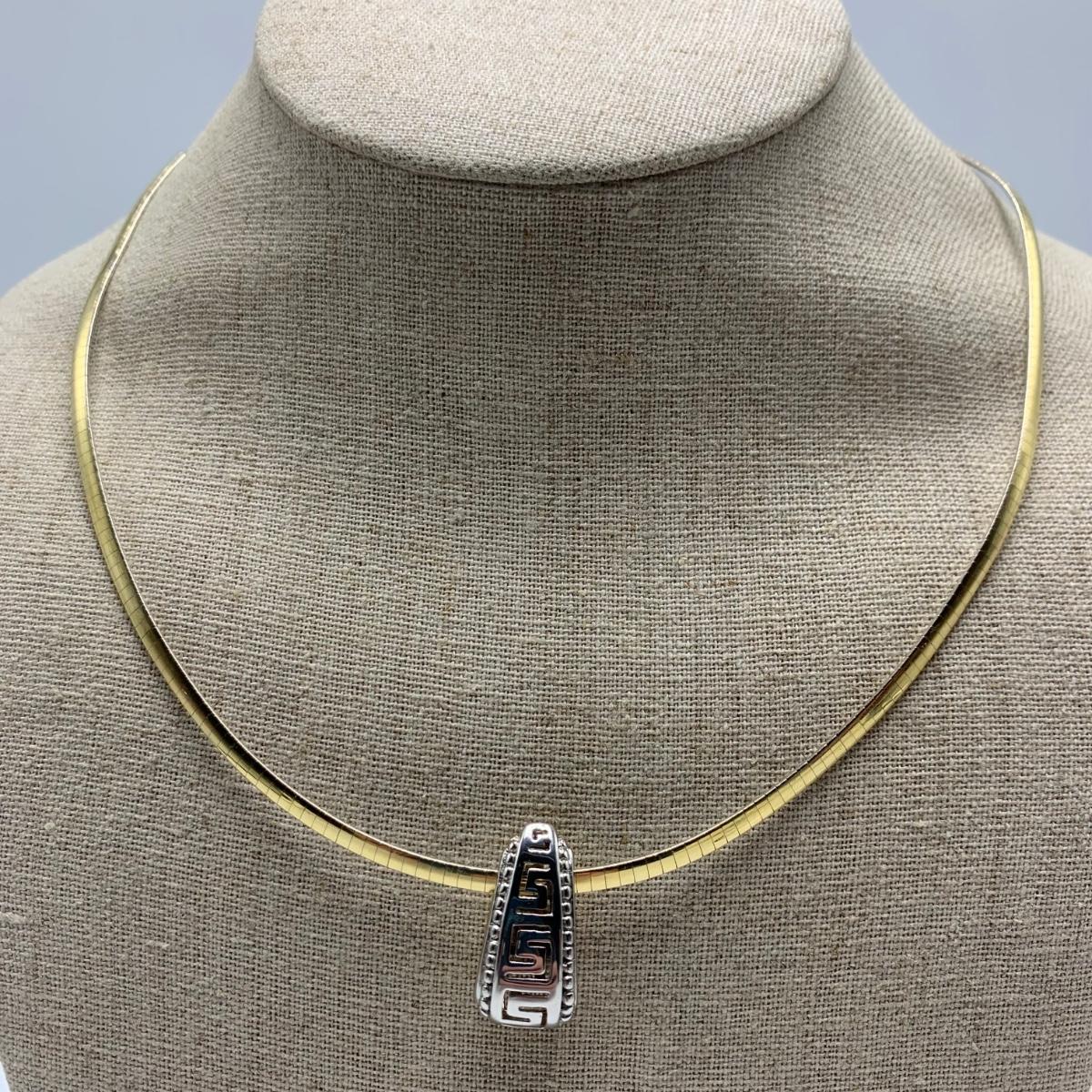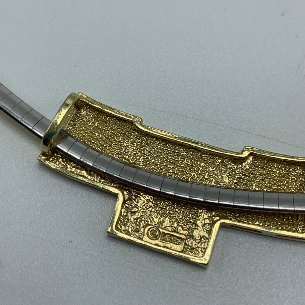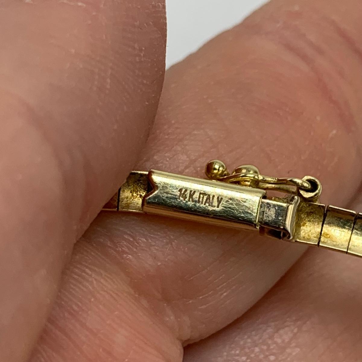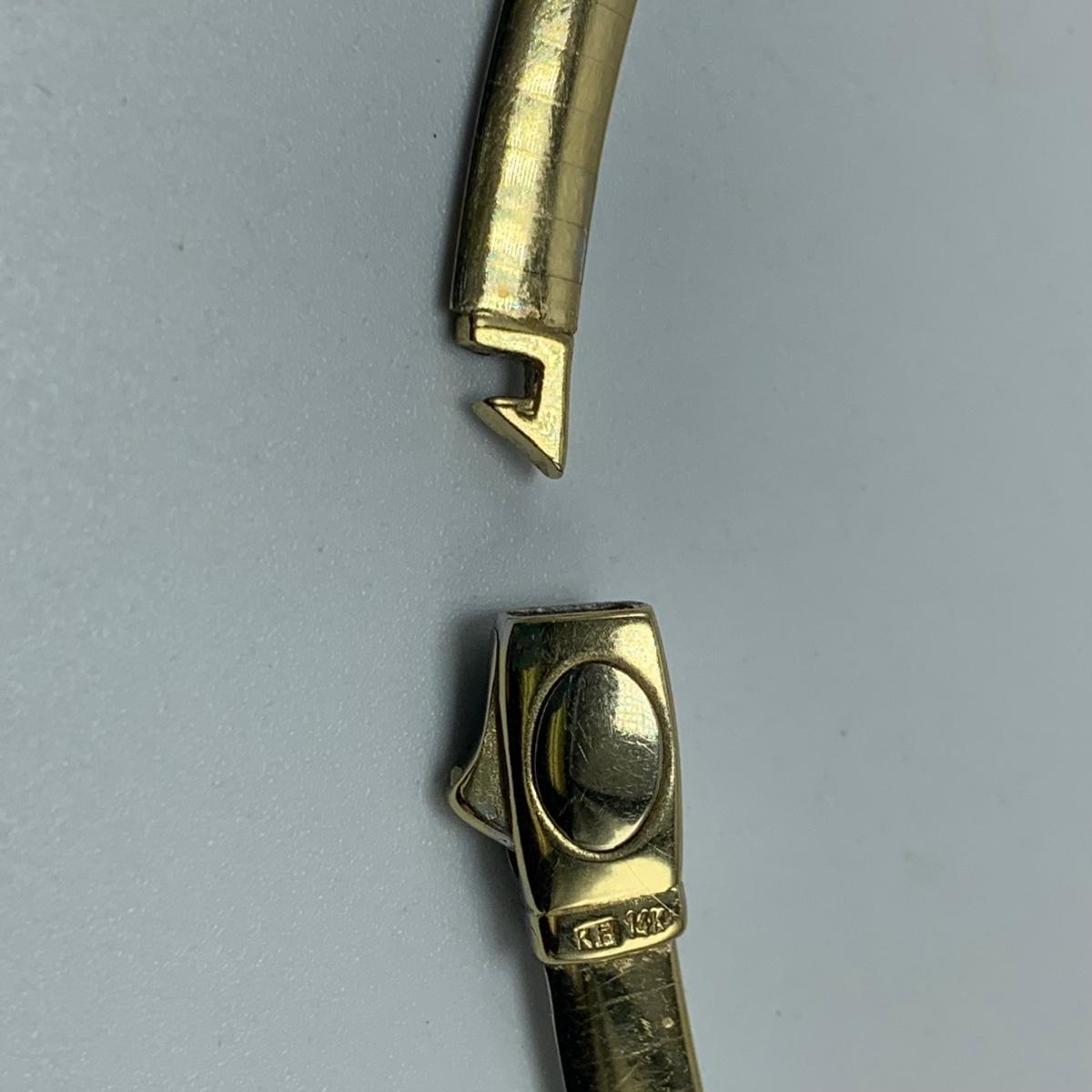 Three omega chain necklaces, each stamped “˜14K’. Two of the chains appear to have yellow gold on one side and white gold on the other. One pendant also appears to be yellow gold on one side and white gold on the other. It is stamped “˜14K’, as is the other pendant. The necklaces are about 6” in diameter. The thickest chain is 5mm thick. The necklace that currently holds the two pendants has some bends and small gaps in the chain. All could benefit from a cleaning.