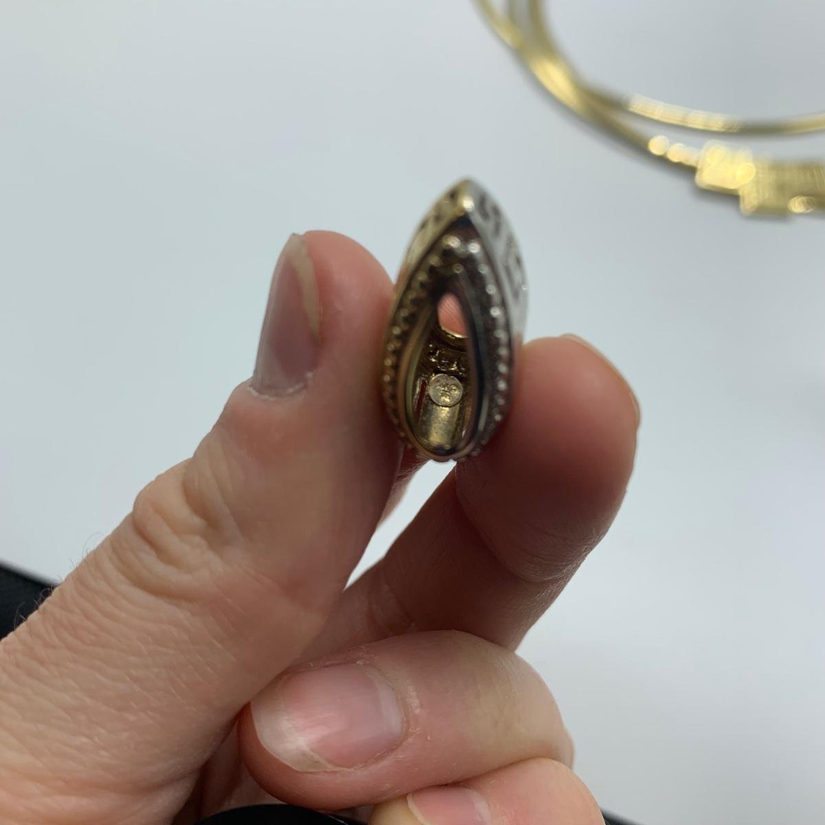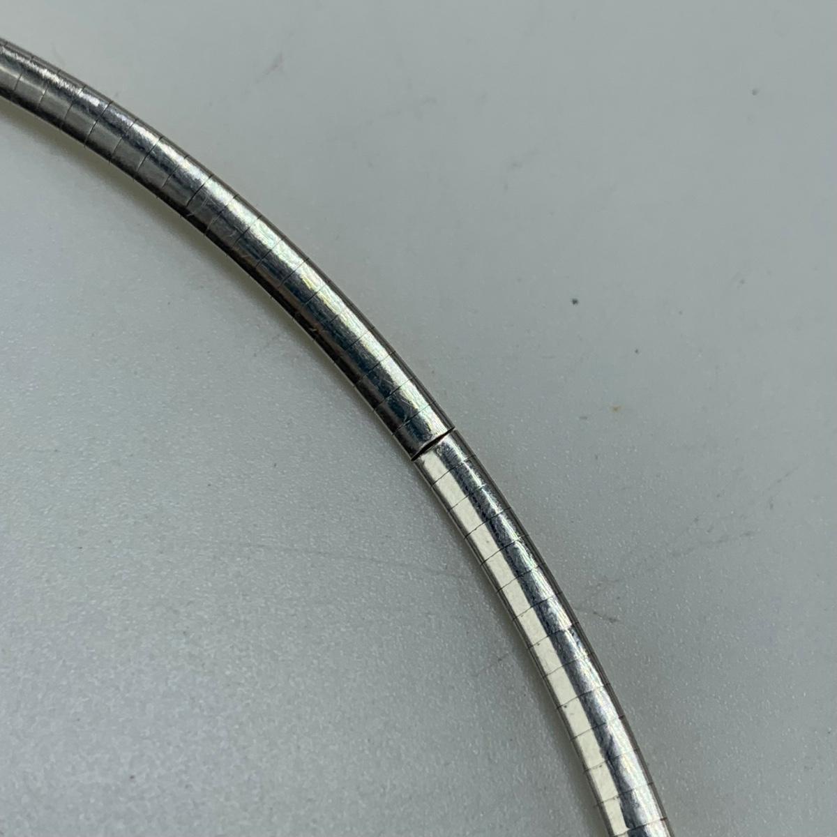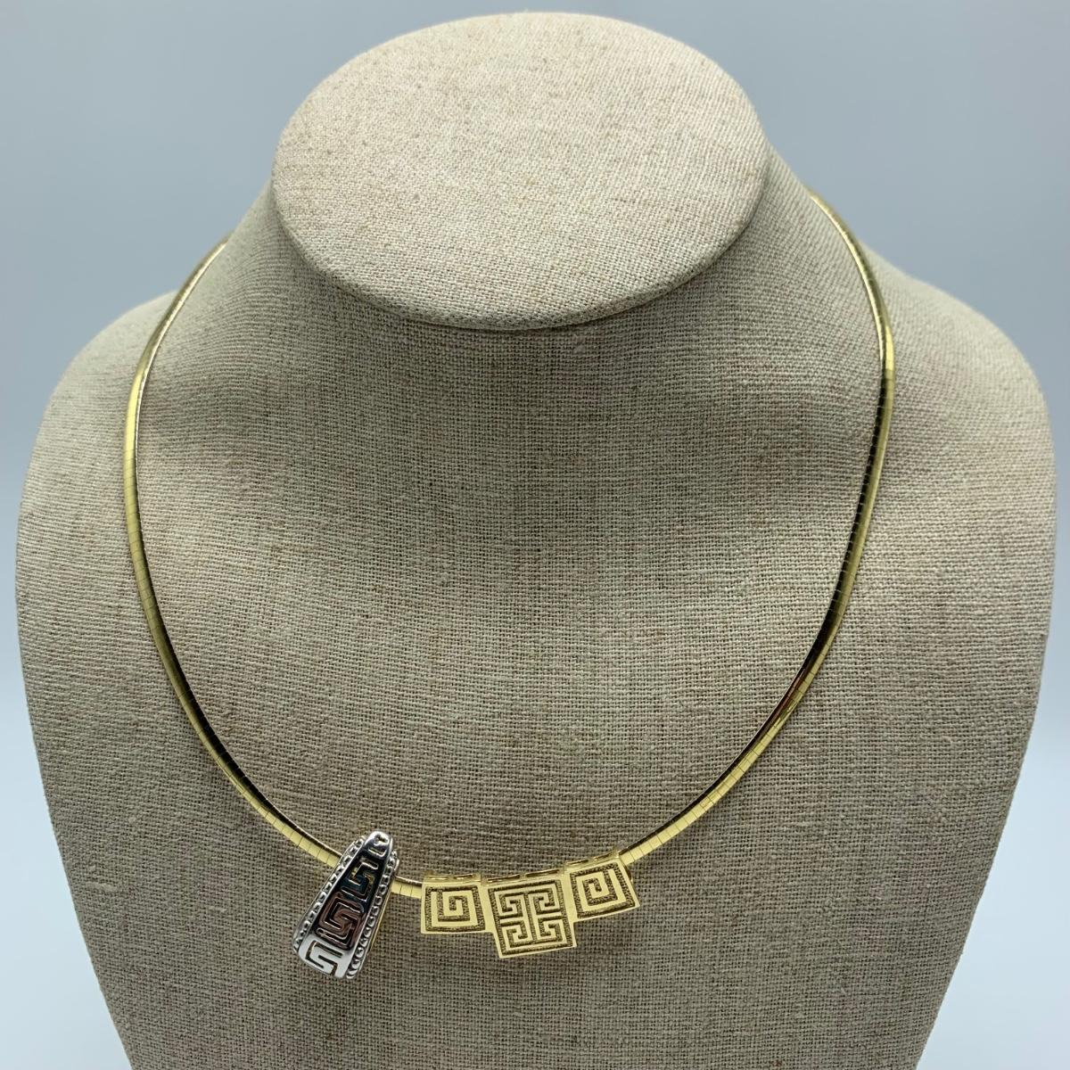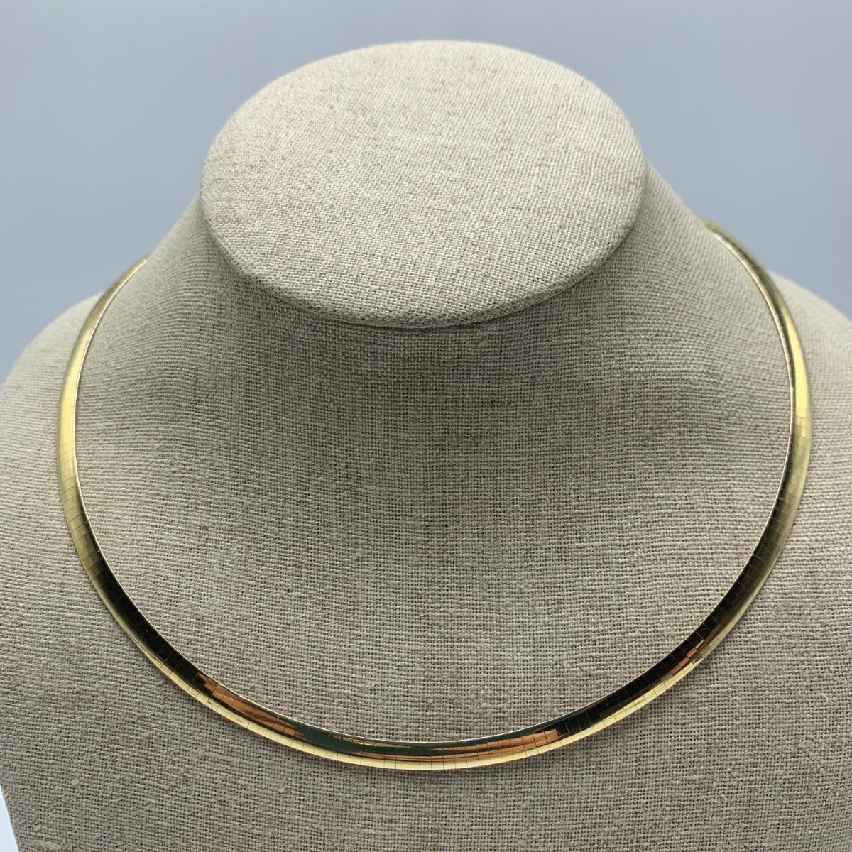Three omega chain necklaces, each stamped “˜14K’. Two of the chains appear to have yellow gold on one side and white gold on the other. One pendant also appears to be yellow gold on one side and white gold on the other. It is stamped “˜14K’, as is the other pendant. The necklaces are about 6” in diameter. The thickest chain is 5mm thick. The necklace that currently holds the two pendants has some bends and small gaps in the chain. All could benefit from a cleaning.