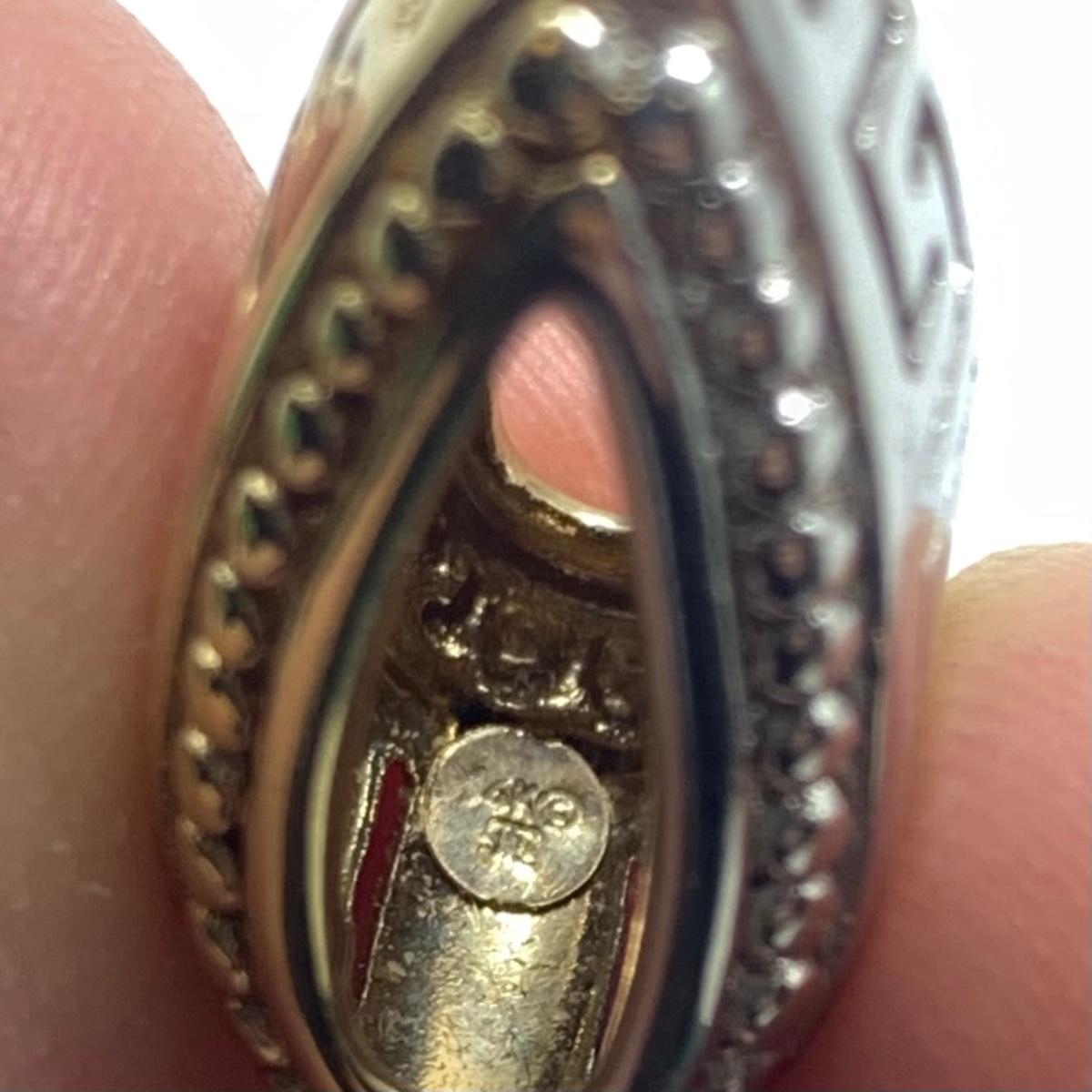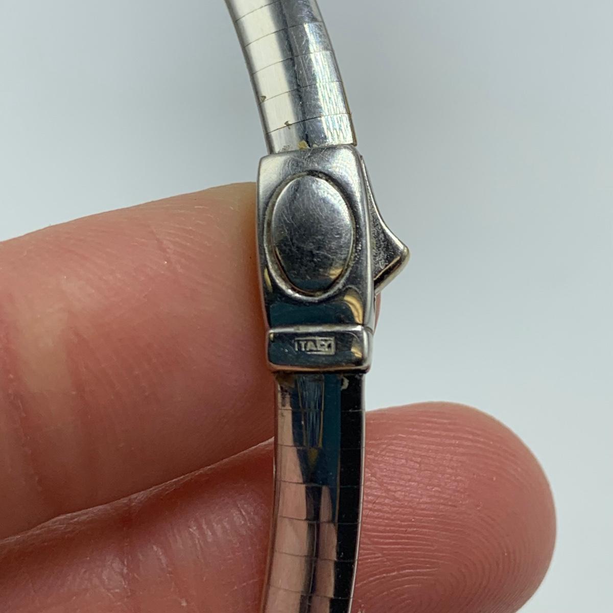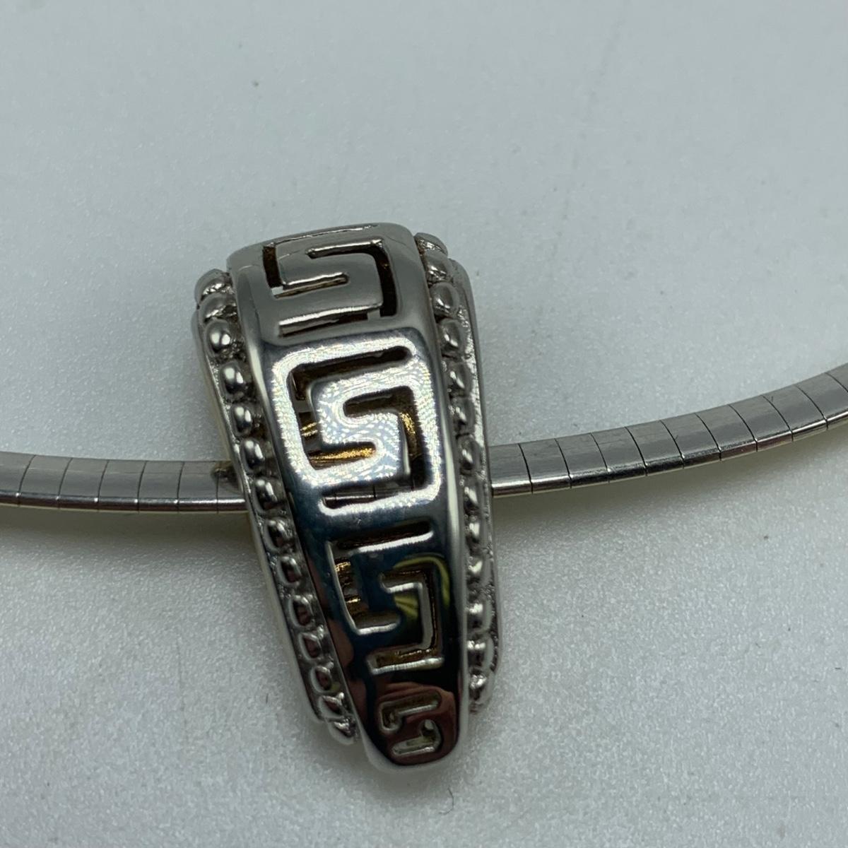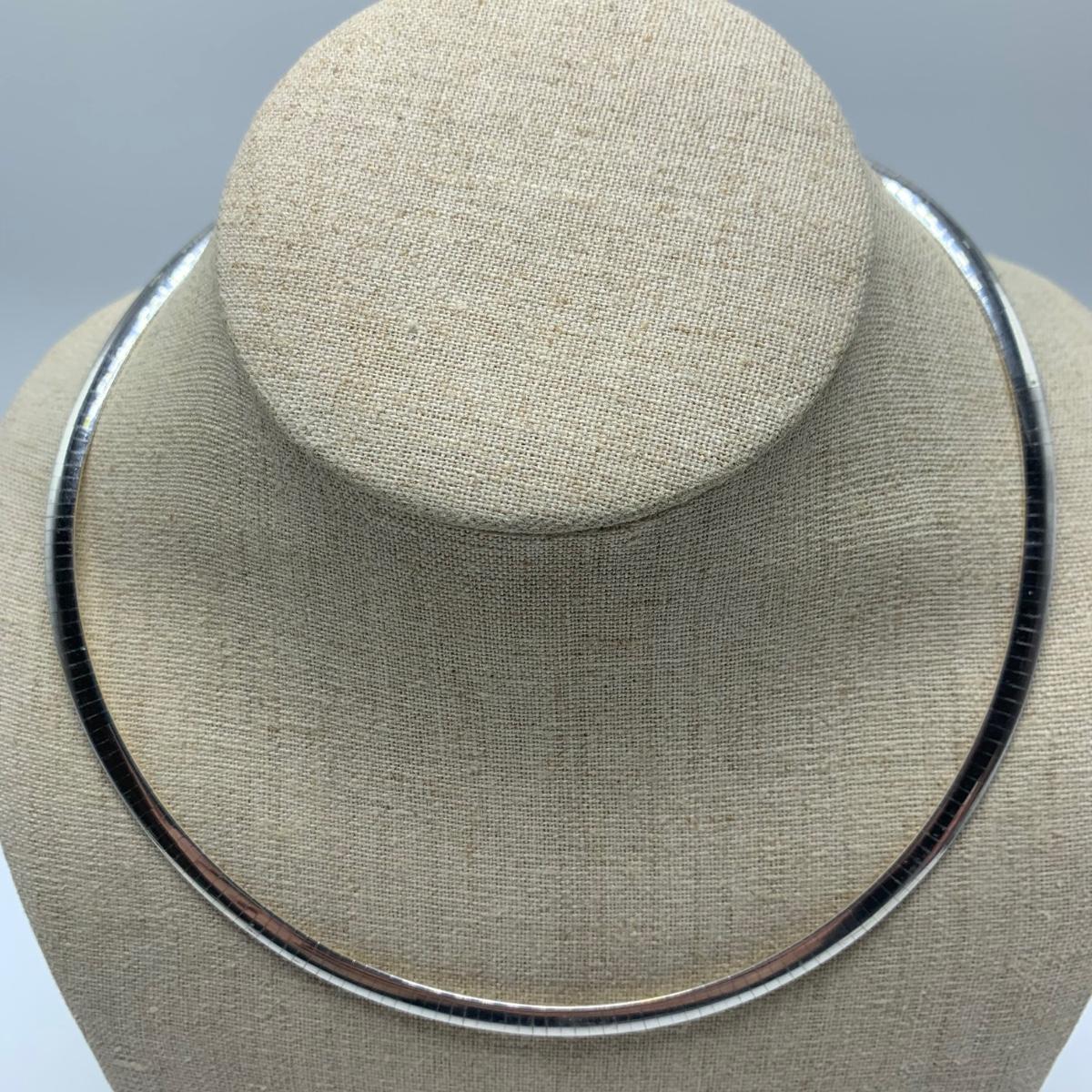 Three omega chain necklaces, each stamped “˜14K’. Two of the chains appear to have yellow gold on one side and white gold on the other. One pendant also appears to be yellow gold on one side and white gold on the other. It is stamped “˜14K’, as is the other pendant. The necklaces are about 6” in diameter. The thickest chain is 5mm thick. The necklace that currently holds the two pendants has some bends and small gaps in the chain. All could benefit from a cleaning.