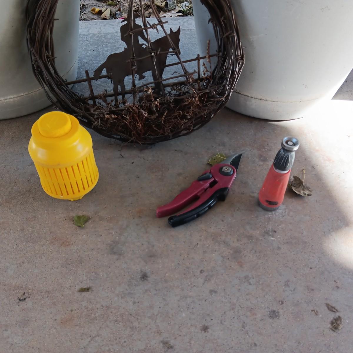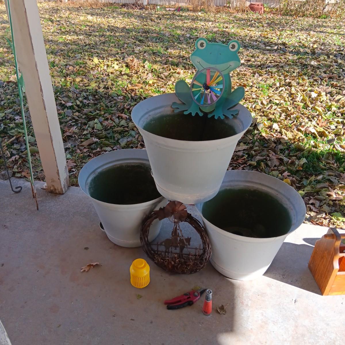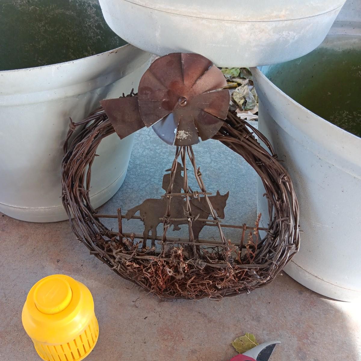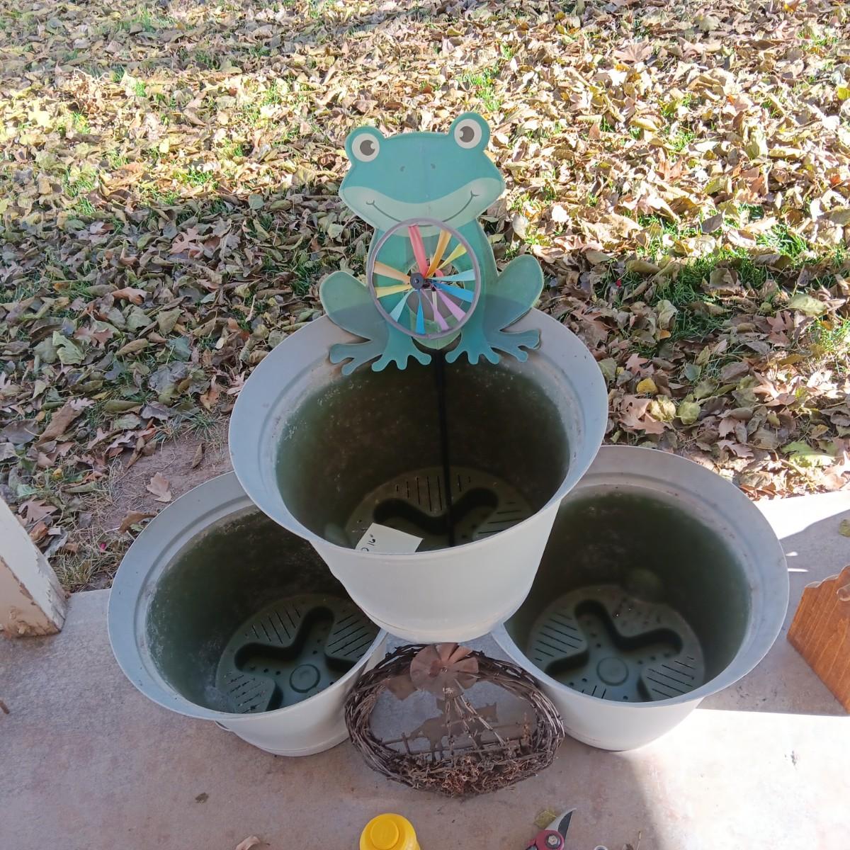 THREE 16" FLOWER POTS, BARBED WIRE COWBOY WALL HANGING AND A FROG