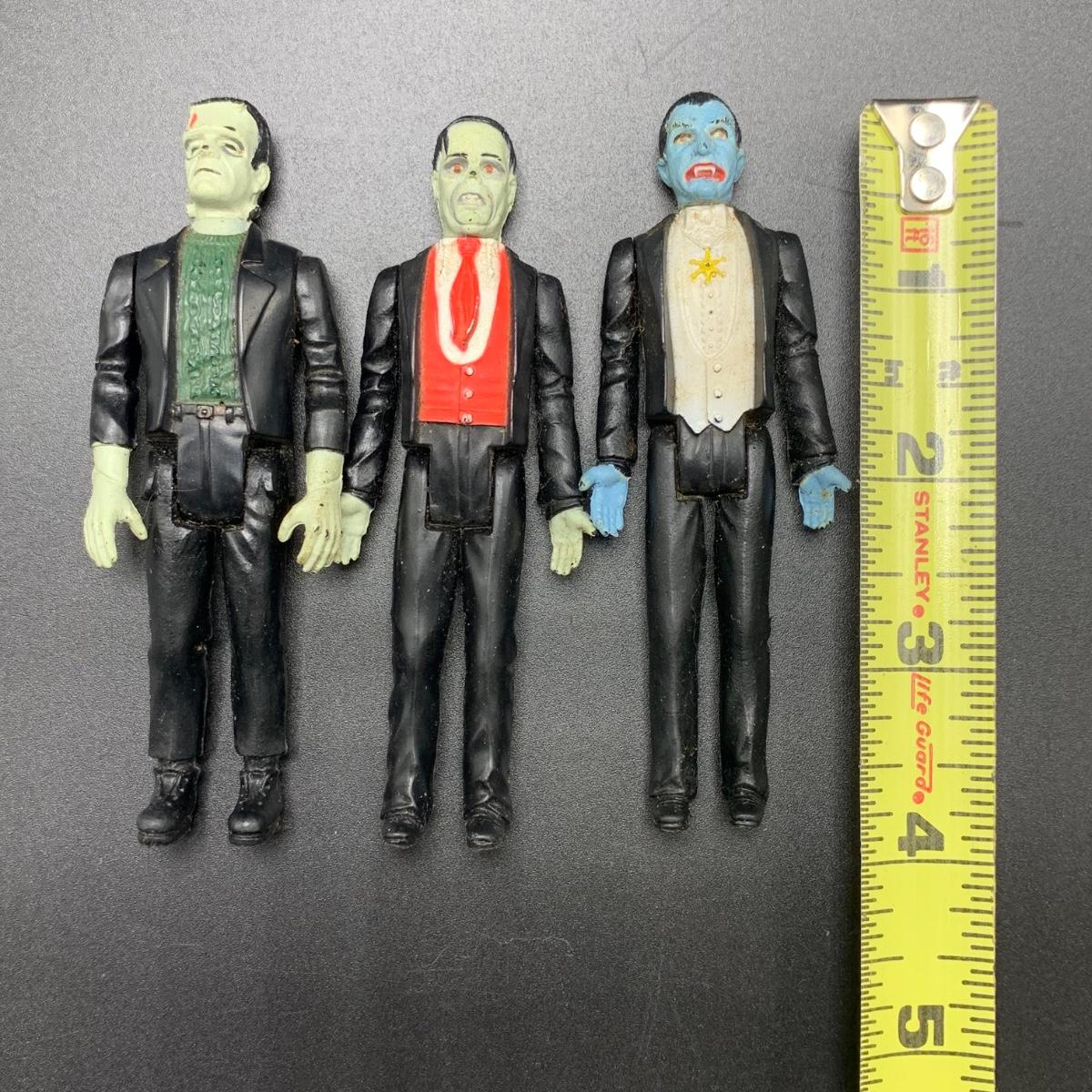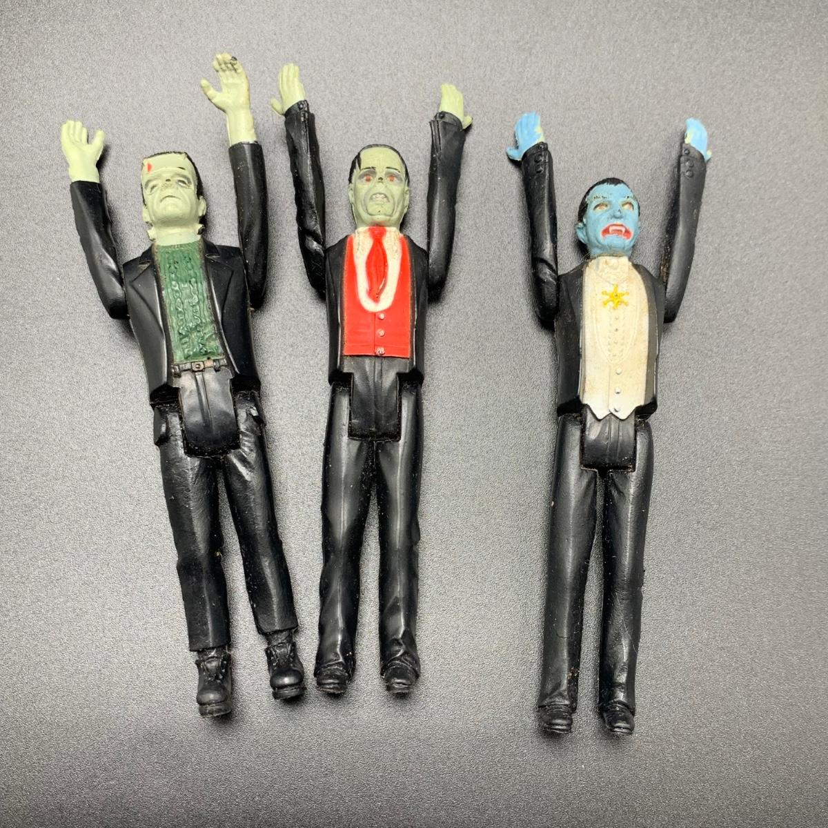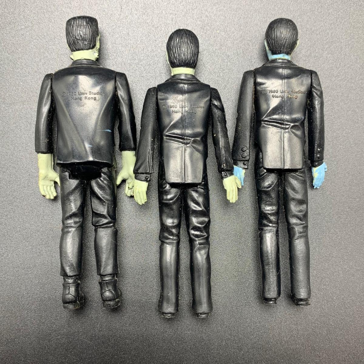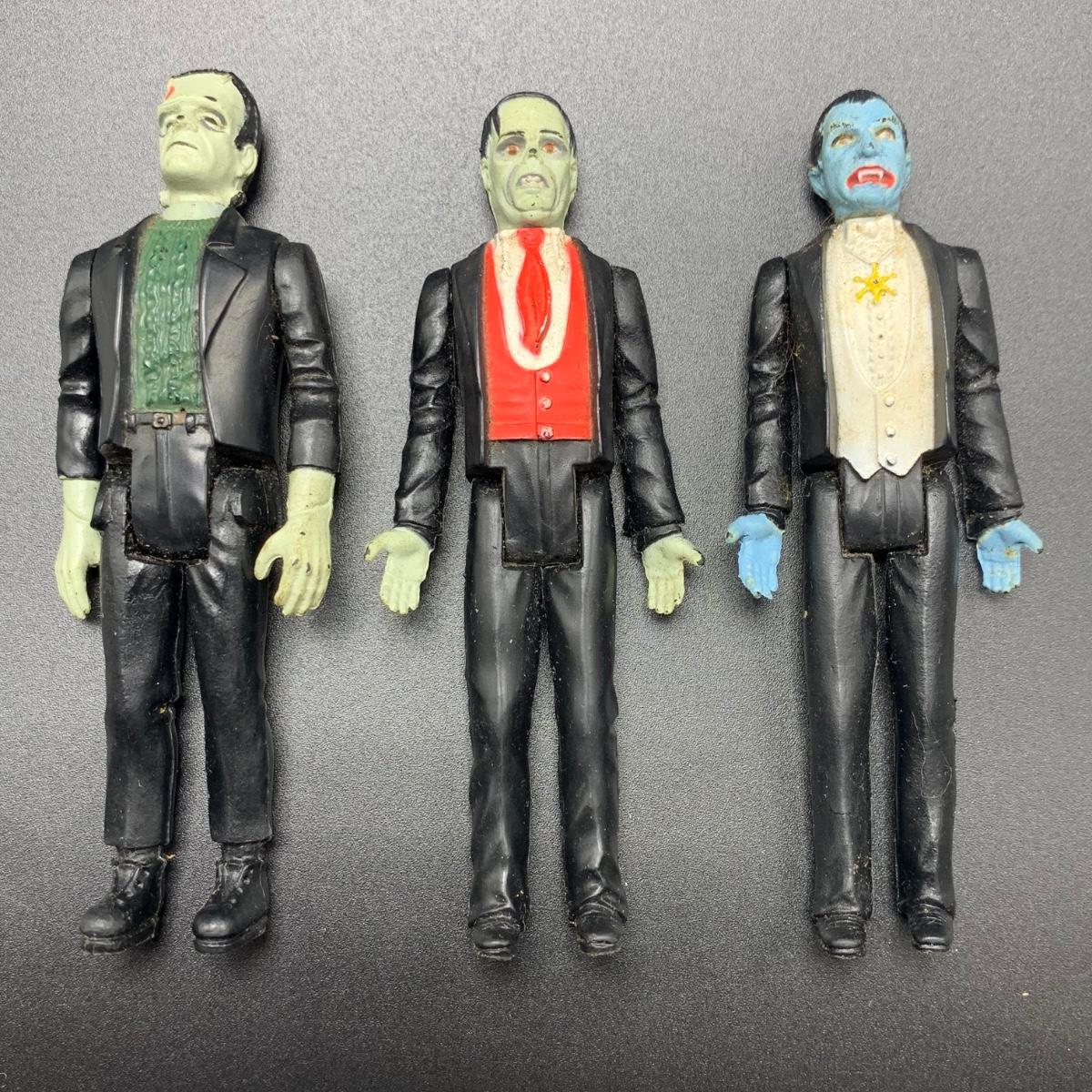 Three 1980 Universal Studios Mini Monsters, including Frankenstein, Dracula, and the Phantom of the Opera. They are plastic and are each about 4” tall and all have moveable limbs. They could use a good cleaning.