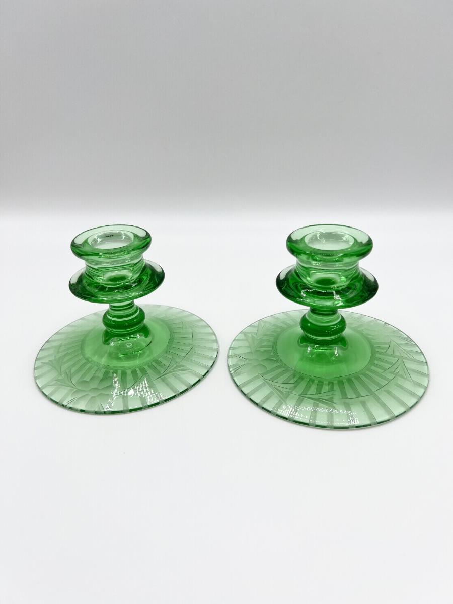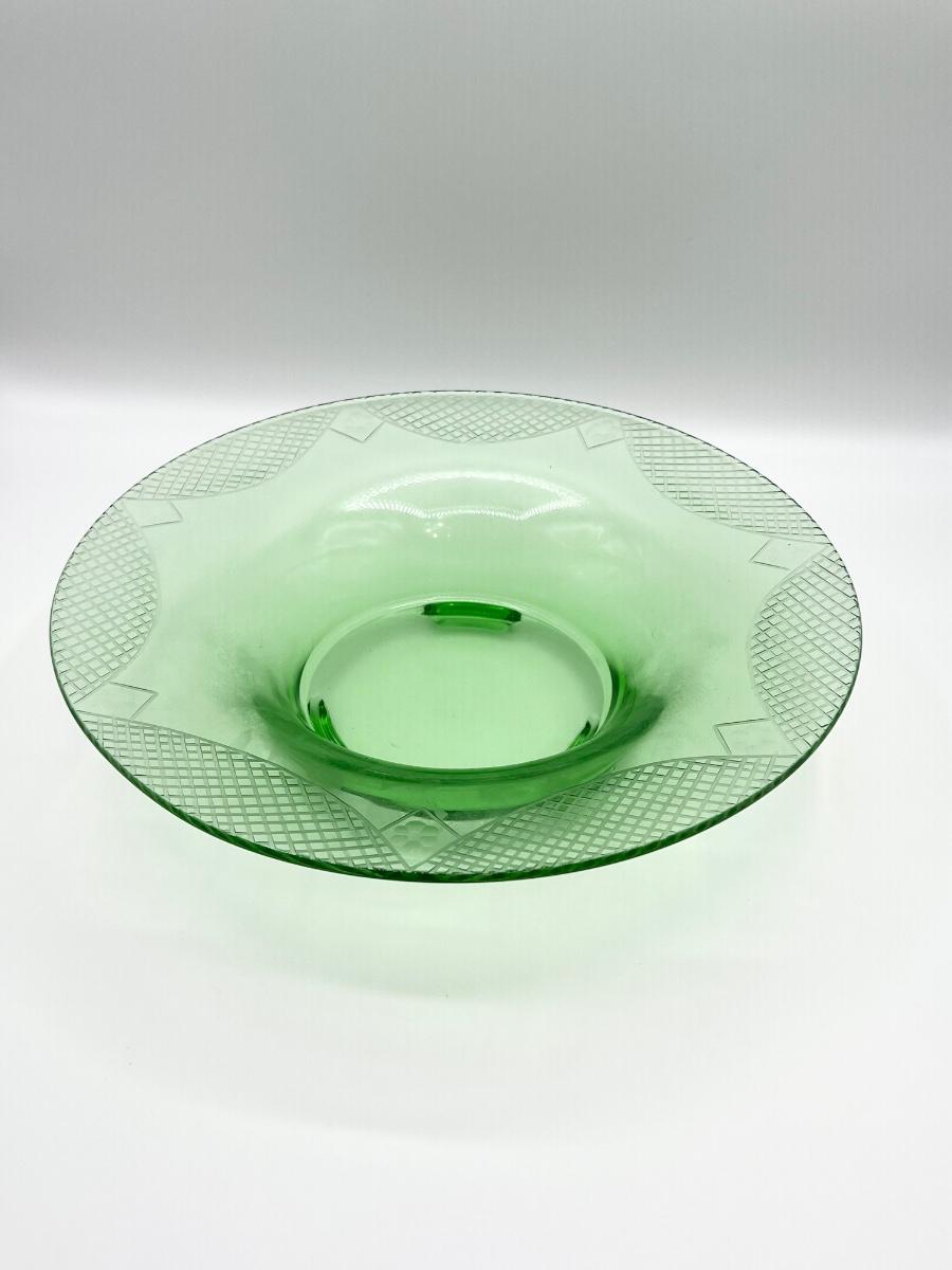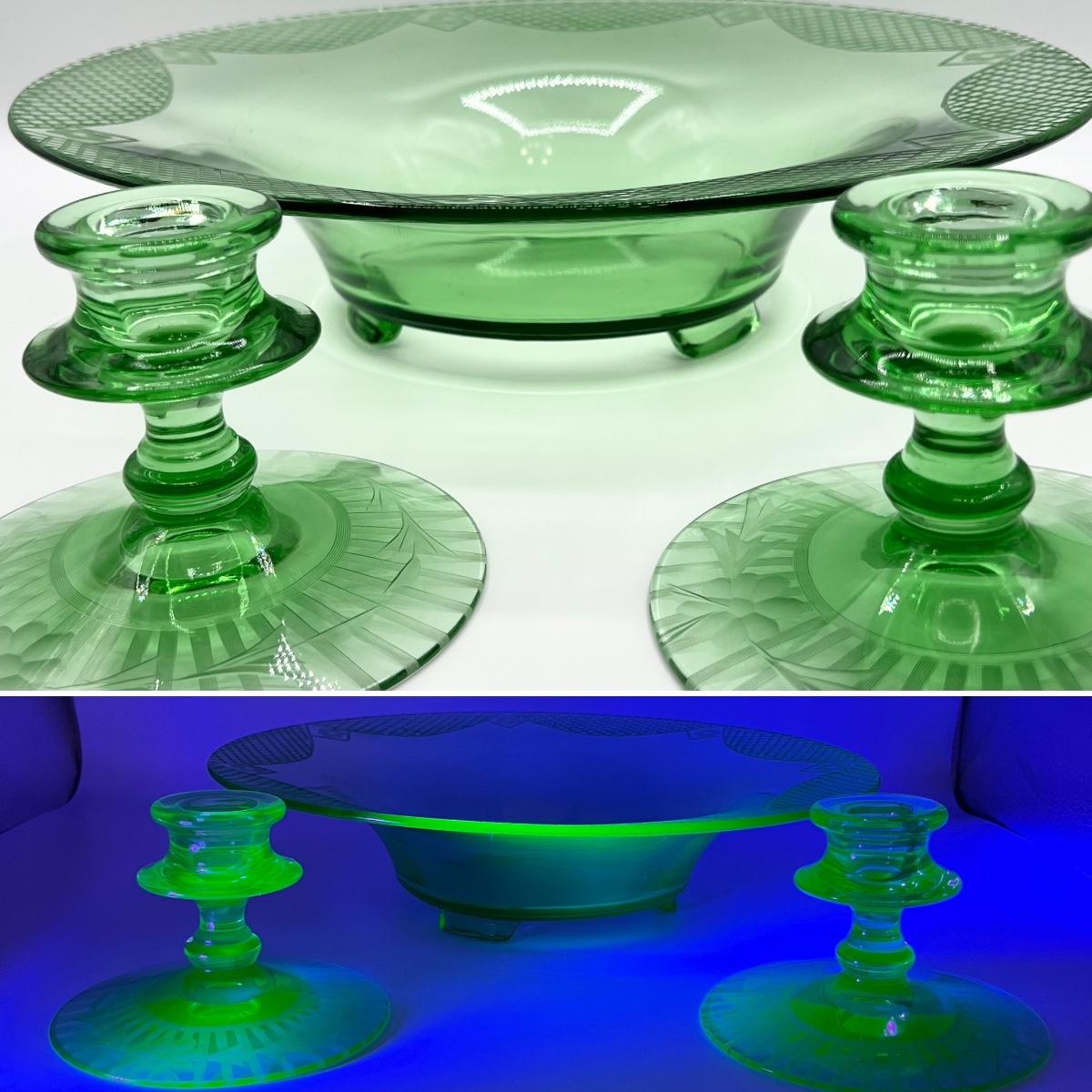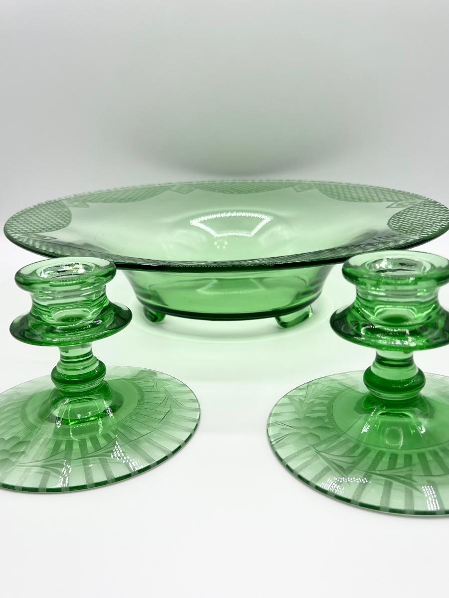 Includes: 1 Footed bowl & 2 candle stick holders ~ Bowl has minor surface scratches from use ~ Footed bowl = 3” H x 12.25” Round ~ Candle stick holders = 3.25” H x 4.5” Round