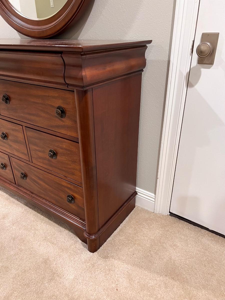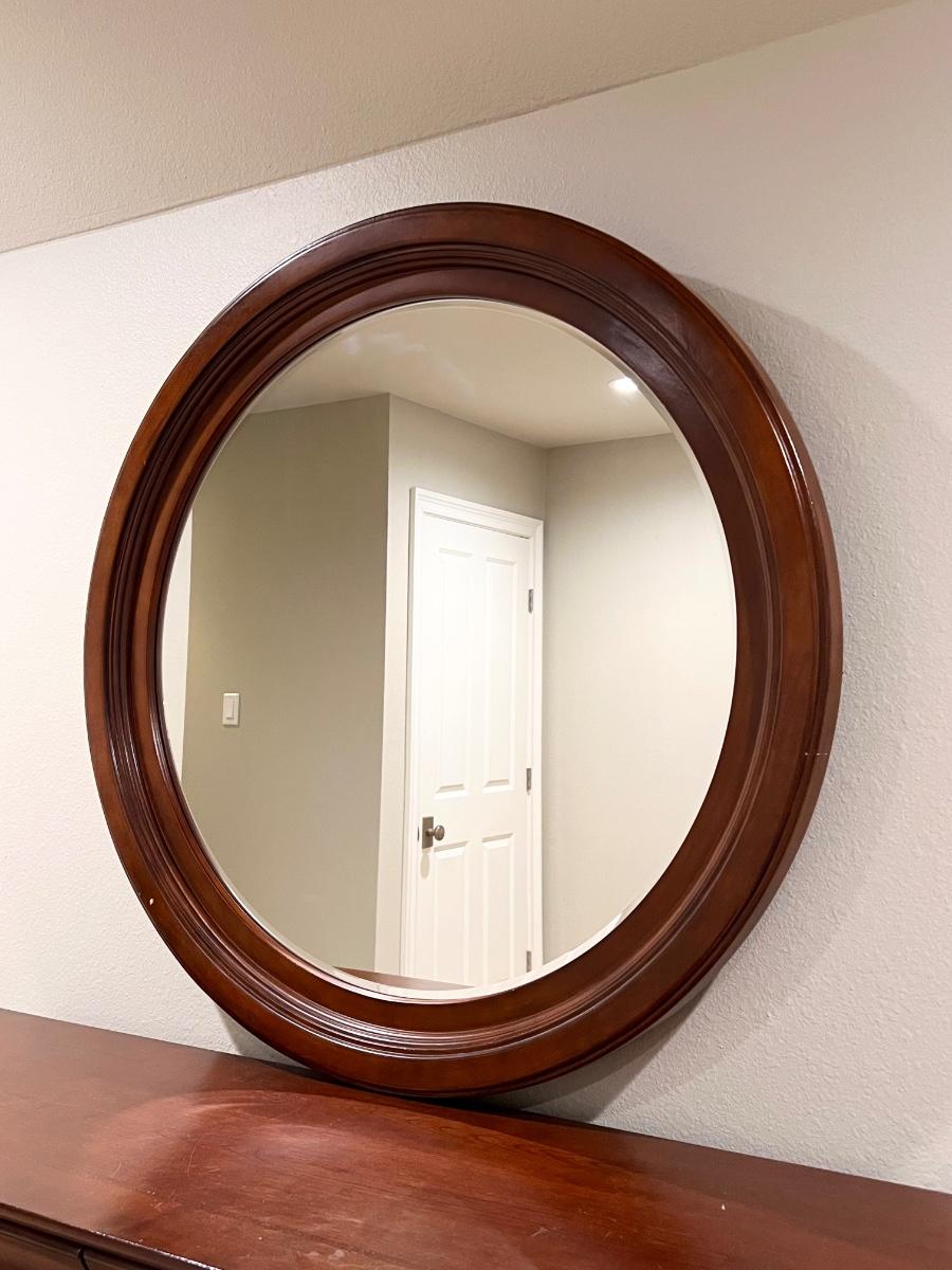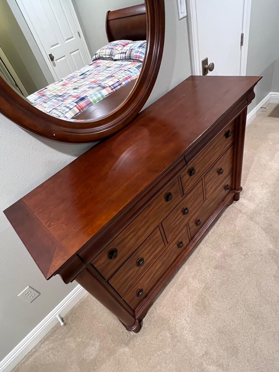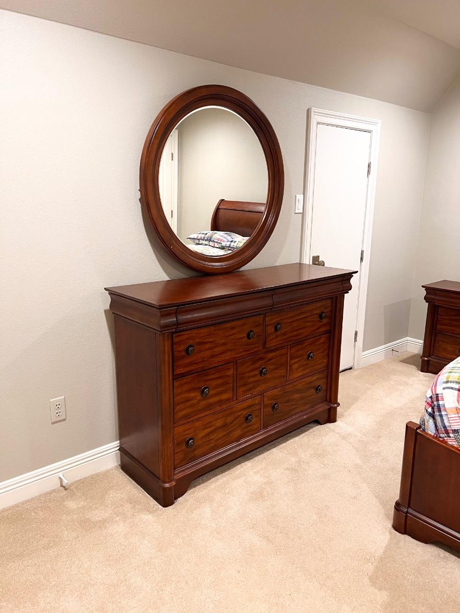 Top drawers in dresser & night stand are felt lined ~ All drawers slide easy ~ Boys room approved, has minor wear & tear, a few knicks and scratches from use ~ Mattress, boxspring & bedding not included ~ No brand ~ Headboard = 49” H ~ Dresser = 38” H x 54” W x 18” D ~ Round Beveled Mirror = 38” Round ~ Nightstand = 28” H x 26” W x 16” D