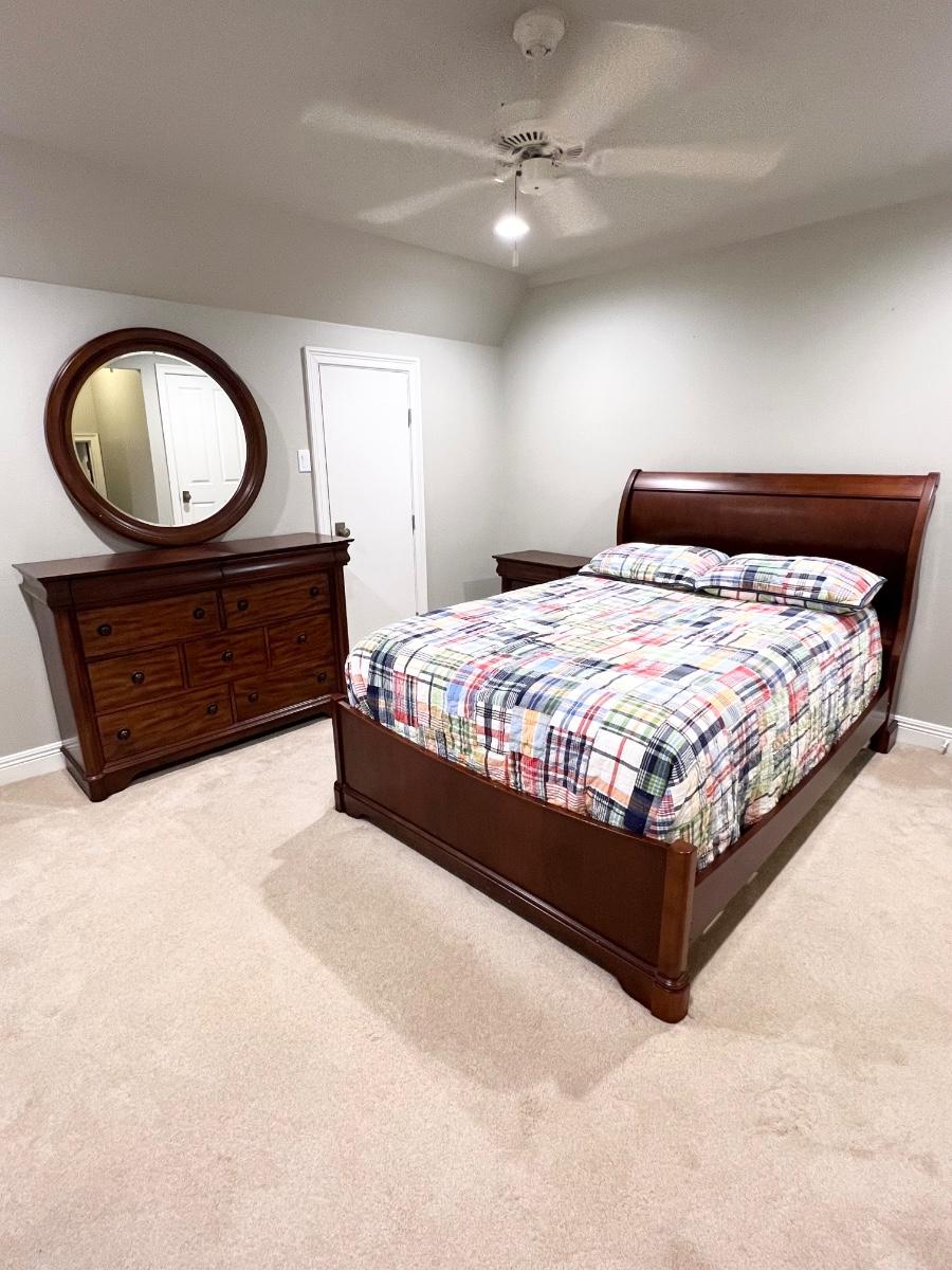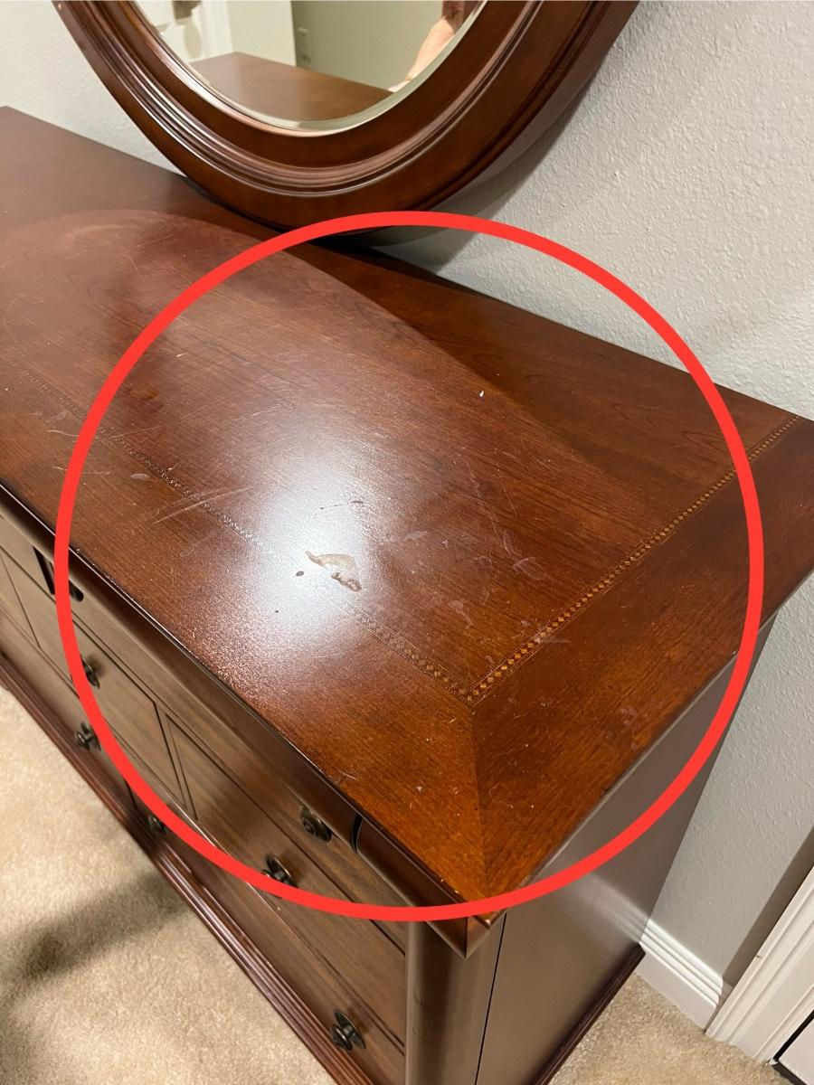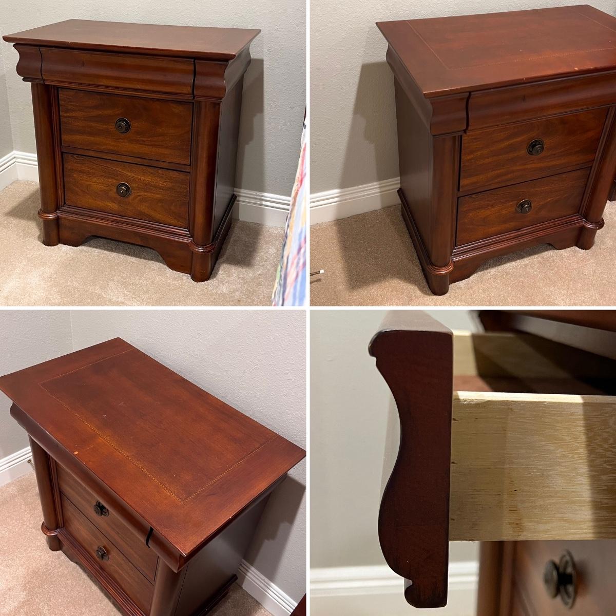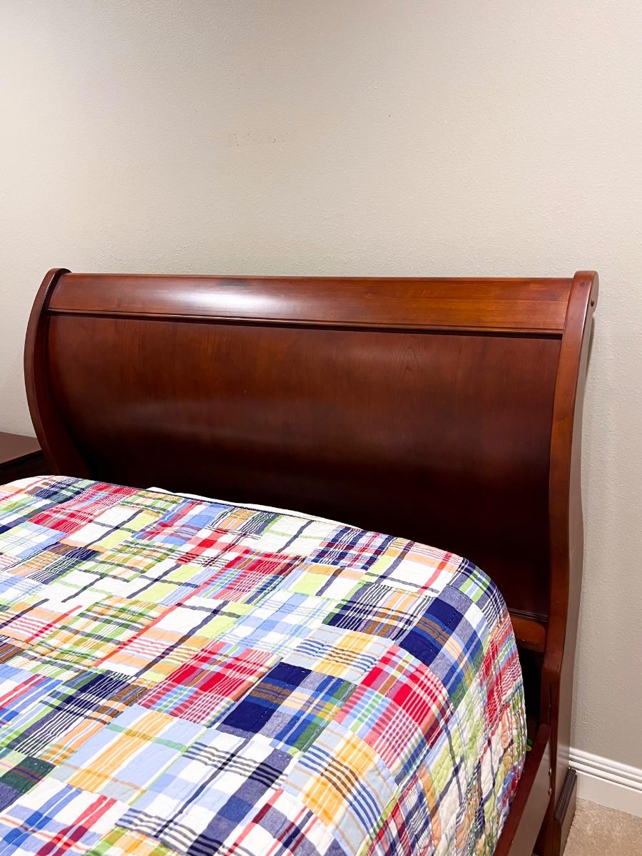 Top drawers in dresser & night stand are felt lined ~ All drawers slide easy ~ Boys room approved, has minor wear & tear, a few knicks and scratches from use ~ Mattress, boxspring & bedding not included ~ No brand ~ Headboard = 49” H ~ Dresser = 38” H x 54” W x 18” D ~ Round Beveled Mirror = 38” Round ~ Nightstand = 28” H x 26” W x 16” D