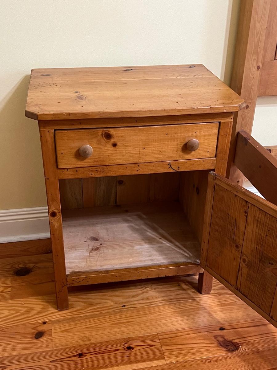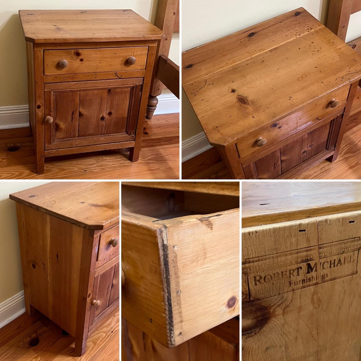 All drawers slide easy ~ No name brand stamped on bed, but purchased from Hurwitz Mintz ~ 1 night stand is ROBERT MICHAEL ~ Other night stand is no brand ~ Headboard = 58” H ~ Nightstands = 28.5” H x 24” W x 18.5” D