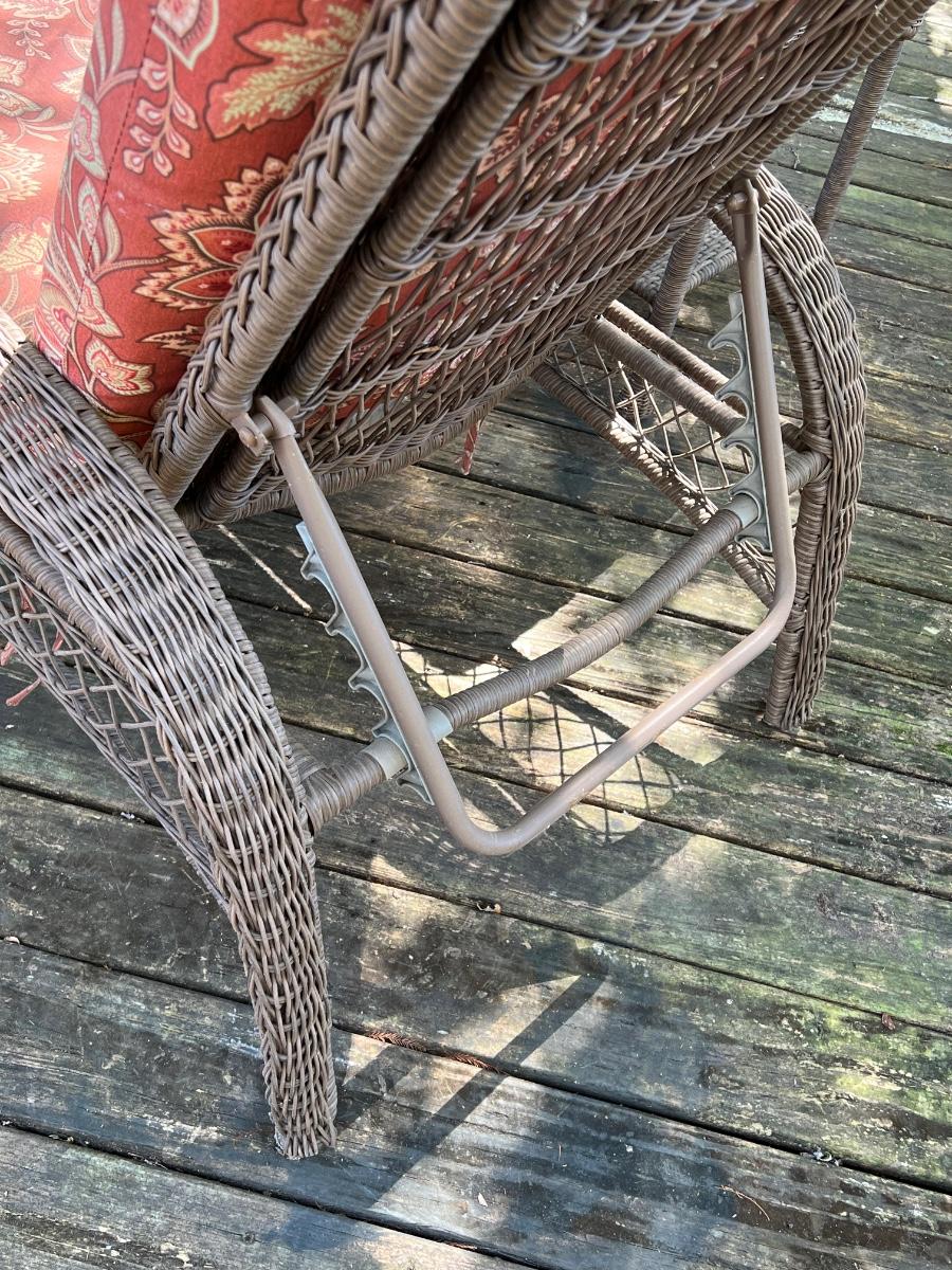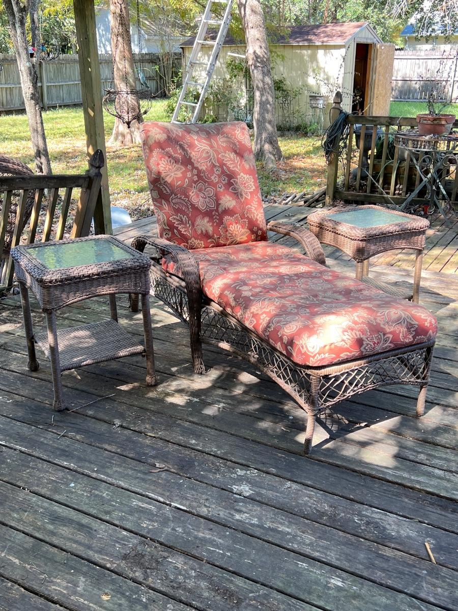 Set comes with adjustable lounge & 2 18” square side tables. Porch Kept ~ No major damage ~ Minor surface rust ~ all cushions will need to be replaced due to pet hair and wear.