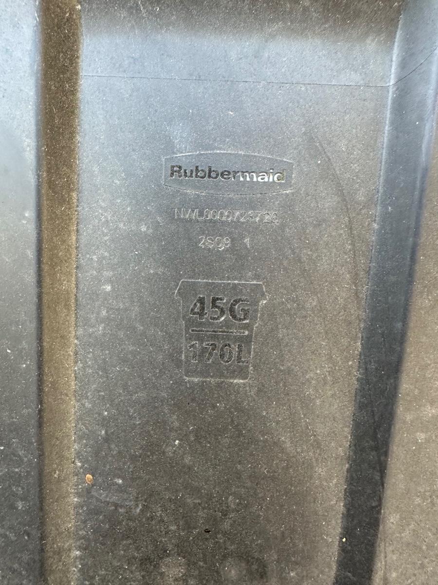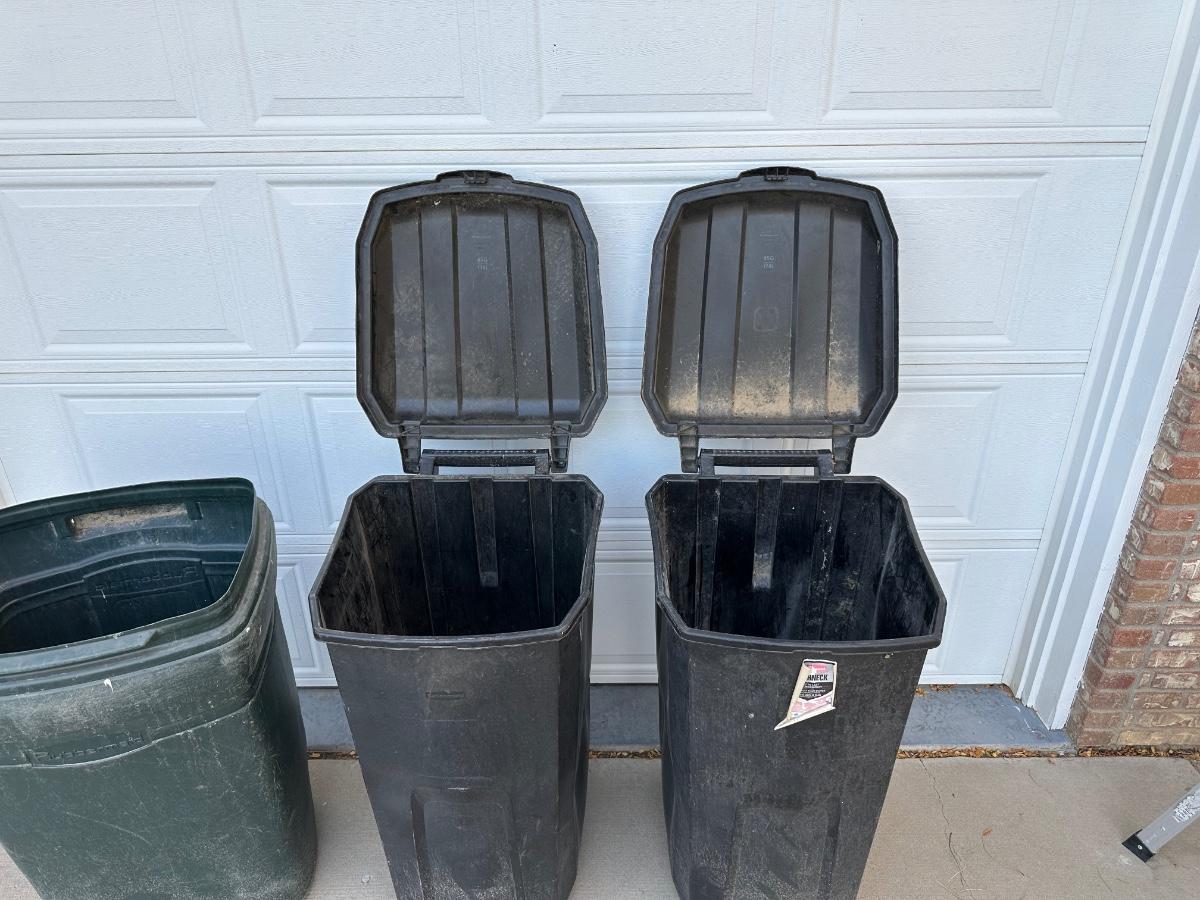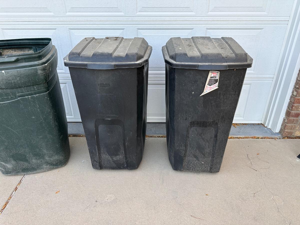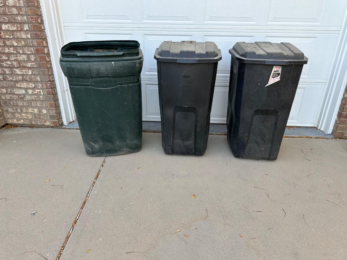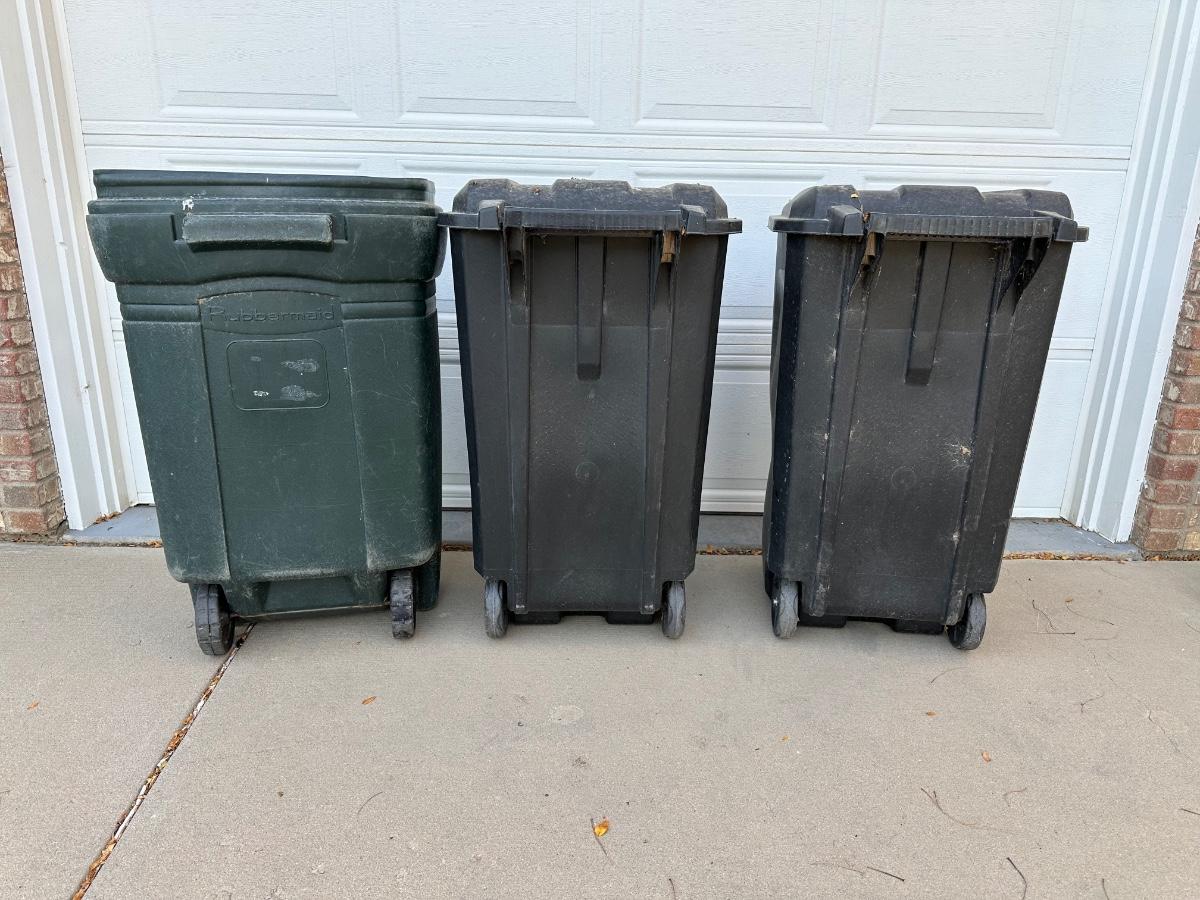THREE 45 GALLON TRASH CANS ON WHEELS