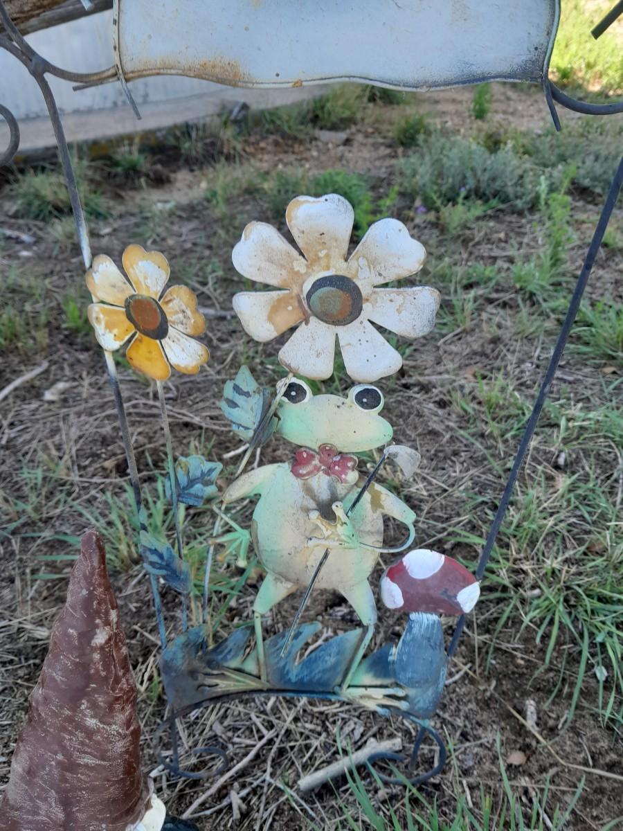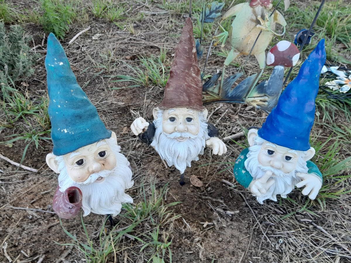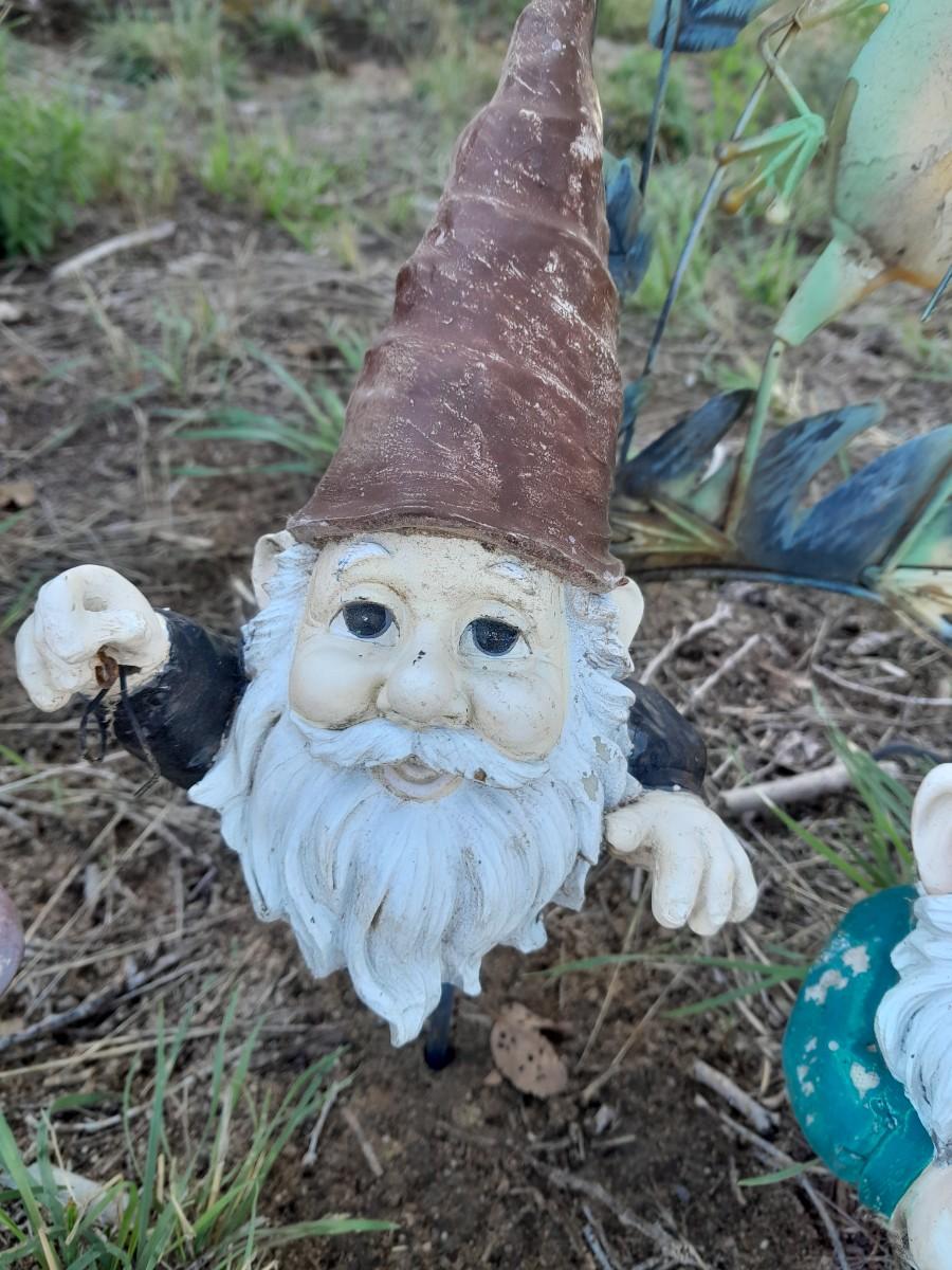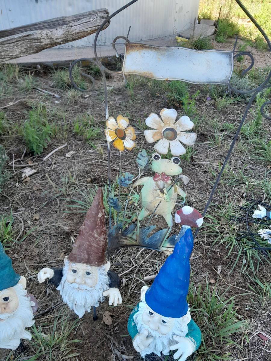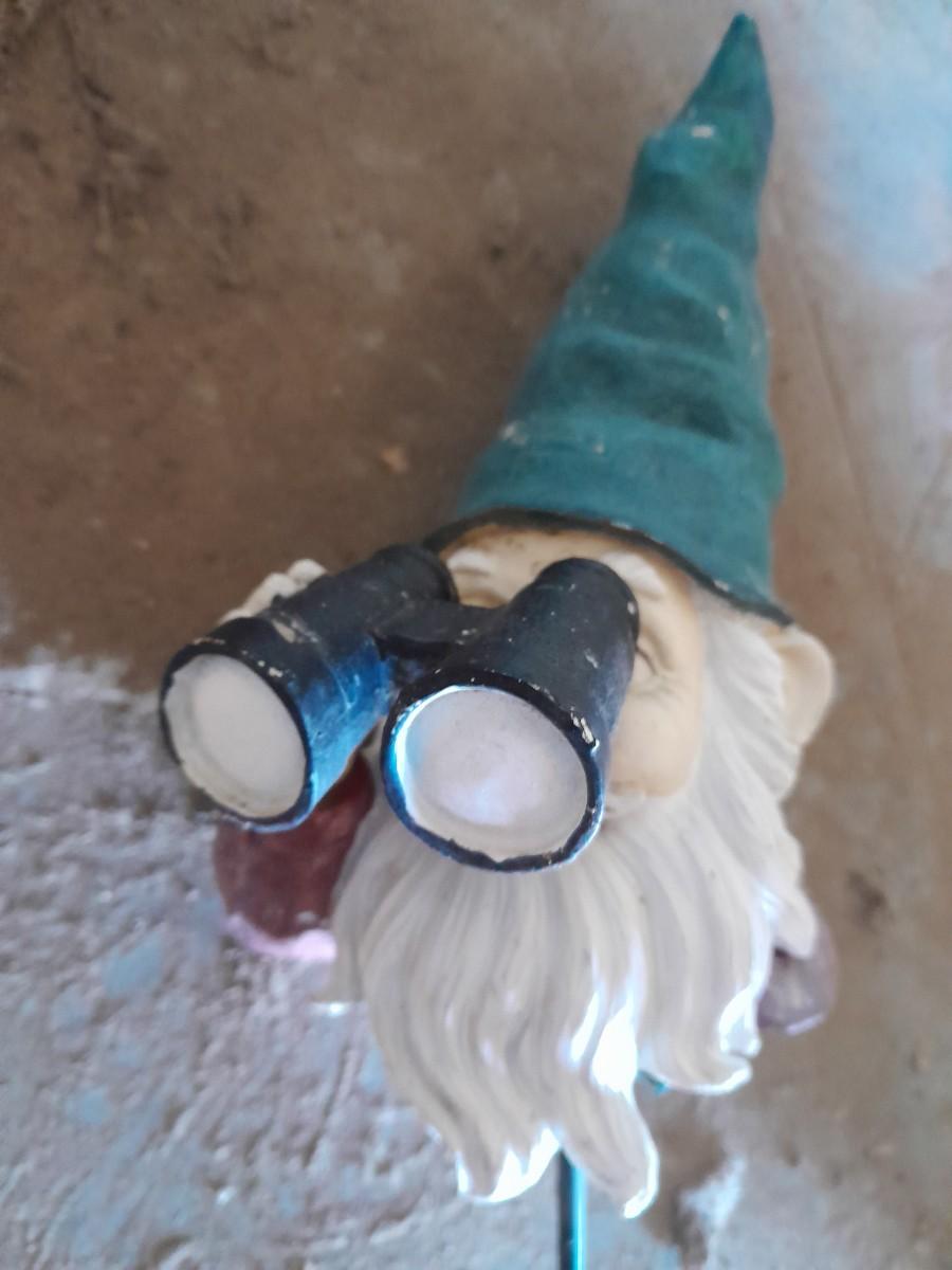 THREE 9" GNOME STAKES ONE HOLDS REMOVABLE BINOCULARS, COMES WITH SMALL DECORATIVE TRELLIS PIECE WITH FROG.