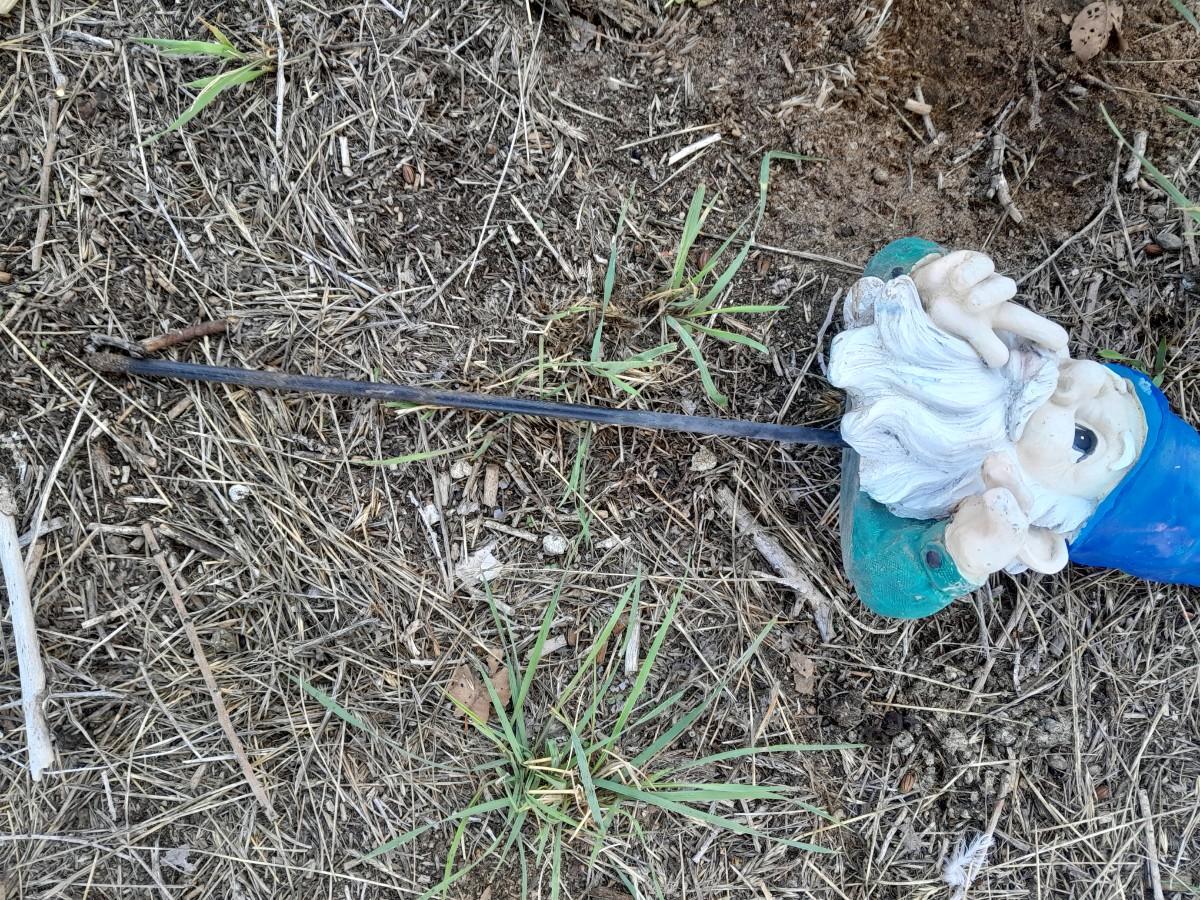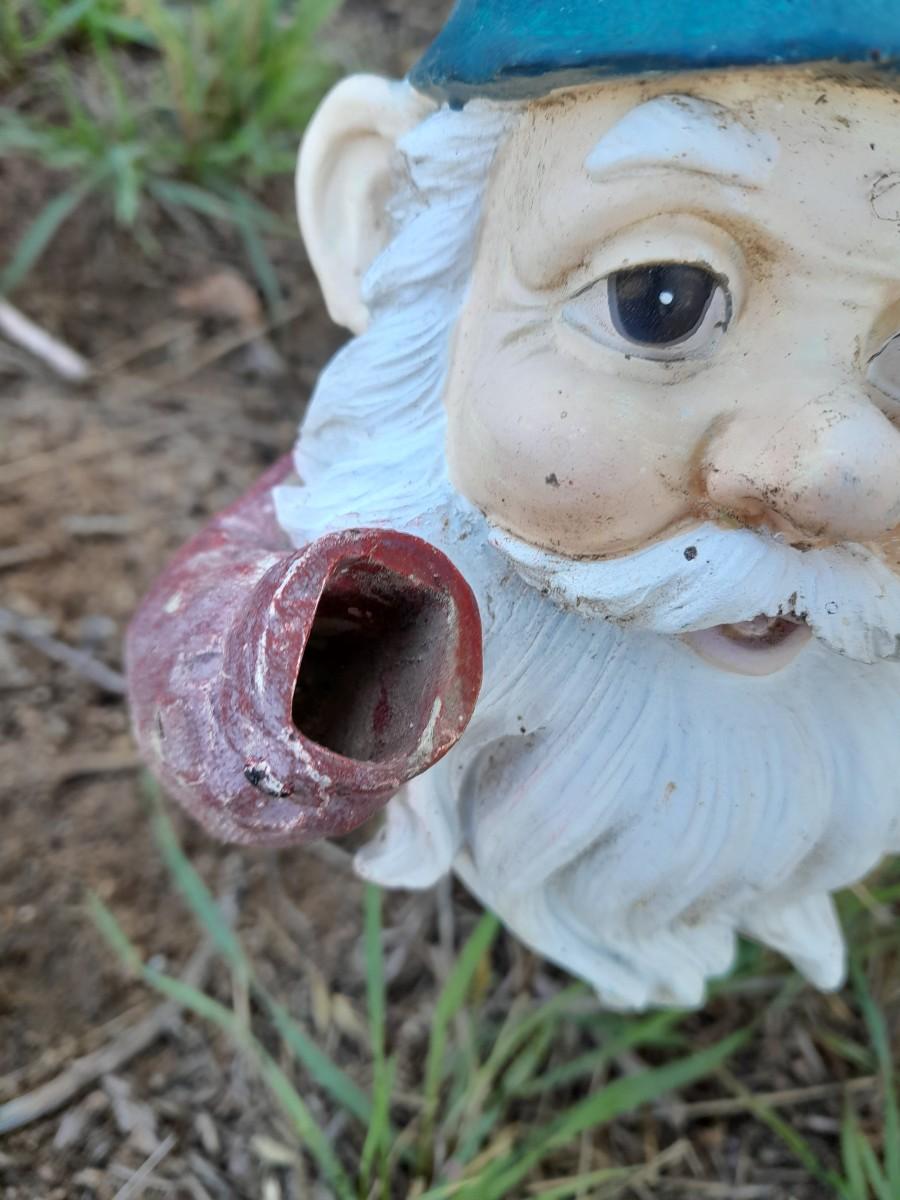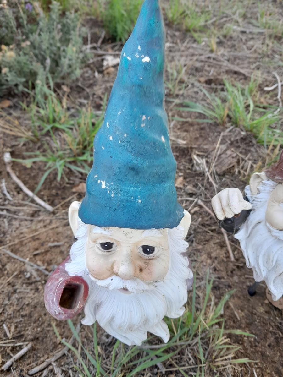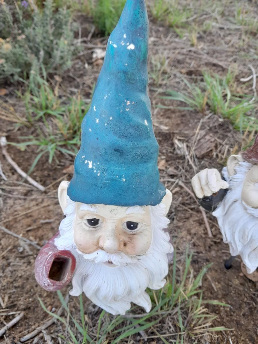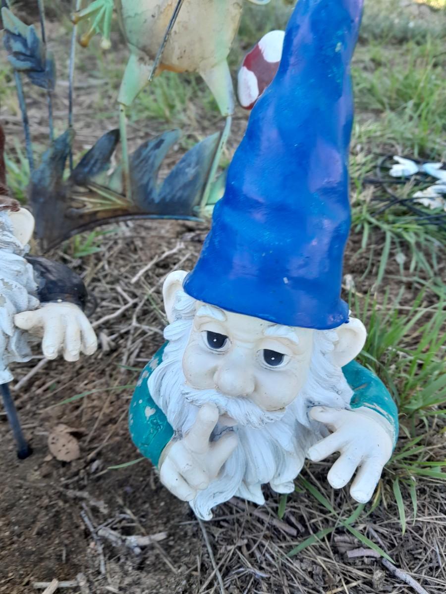 THREE 9" GNOME STAKES ONE HOLDS REMOVABLE BINOCULARS, COMES WITH SMALL DECORATIVE TRELLIS PIECE WITH FROG.