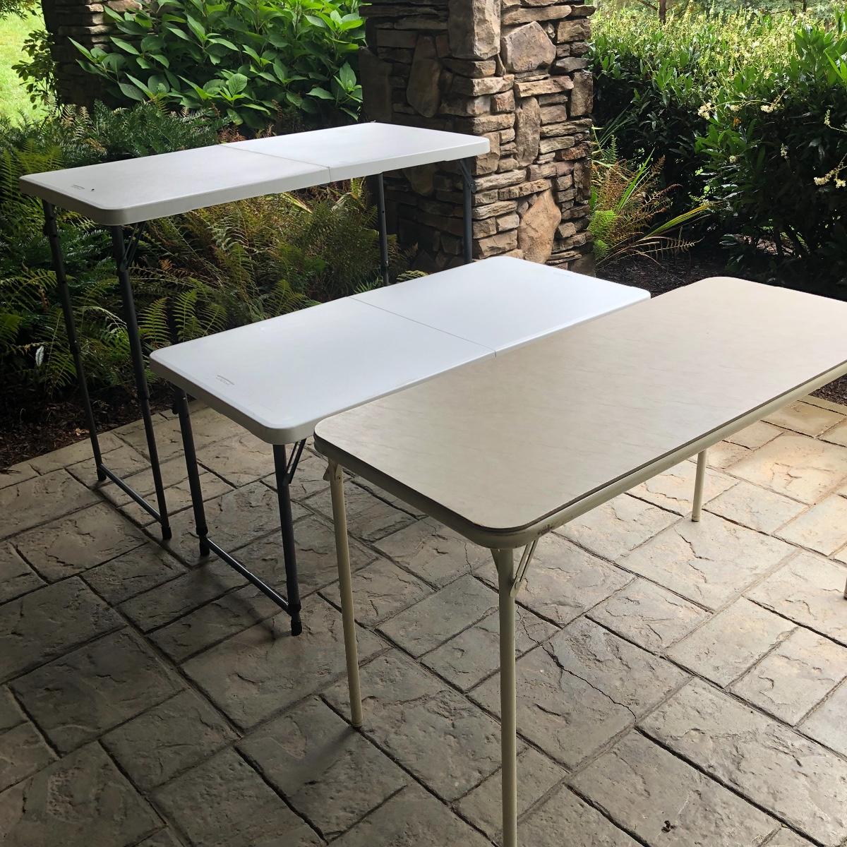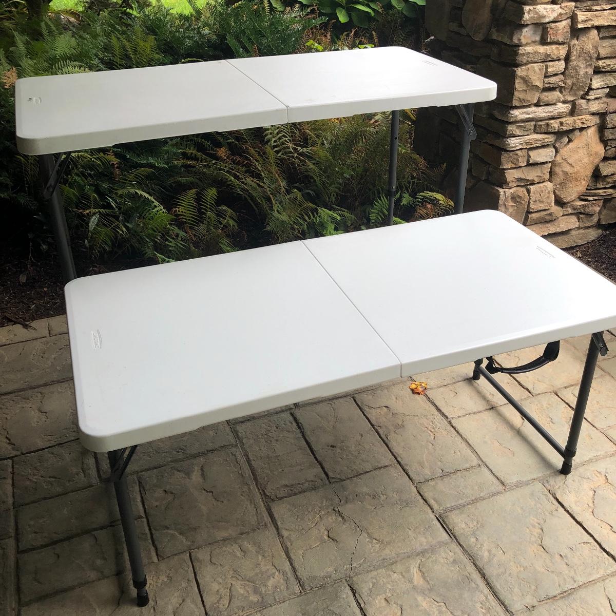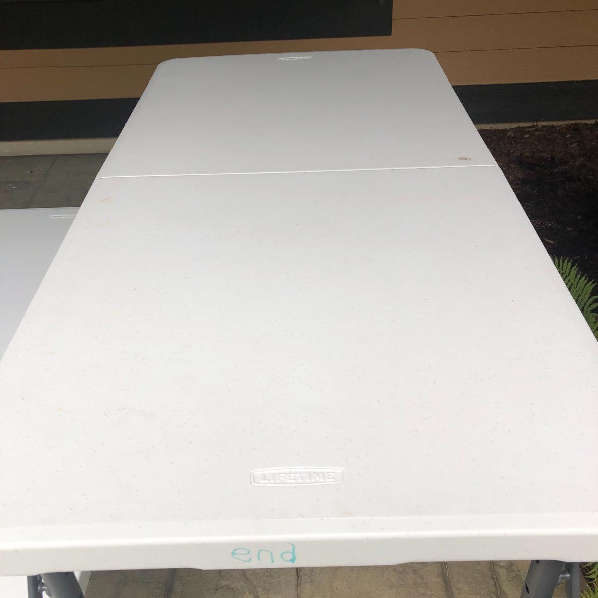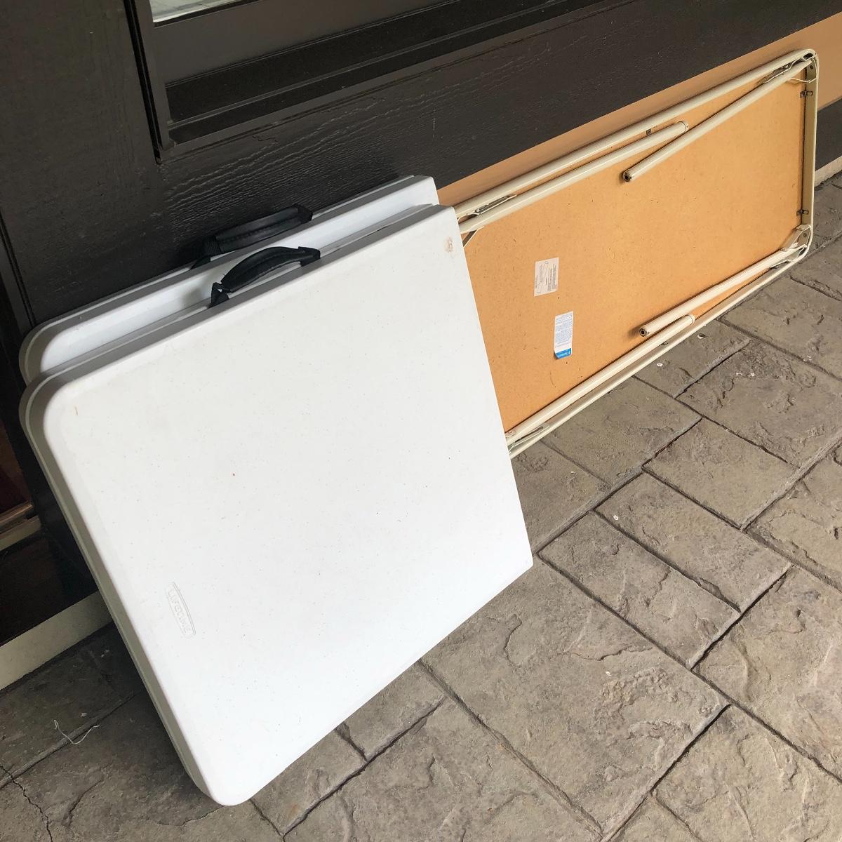 This lot contains three tables. The two Lifetime tables have plastic tops and folds in half for easy storage. They lock in place when folded. Their legs are also adjustable to adjust the height. The third table has a cardboard like top and only the legs fold in. Dimensions of the plastic tables are 48” x 24”. The cardboard table measures 47” x 19”. Local pick up only.