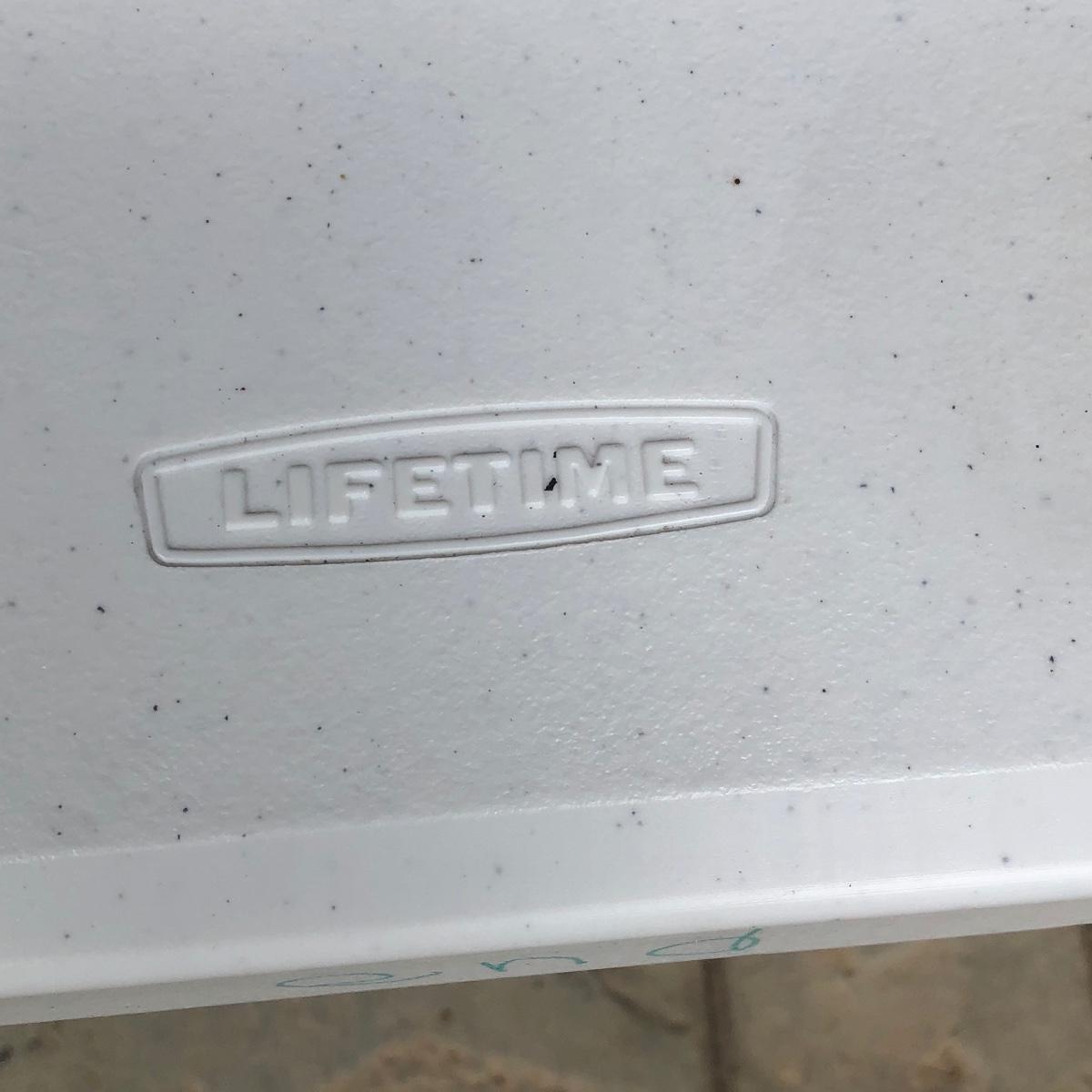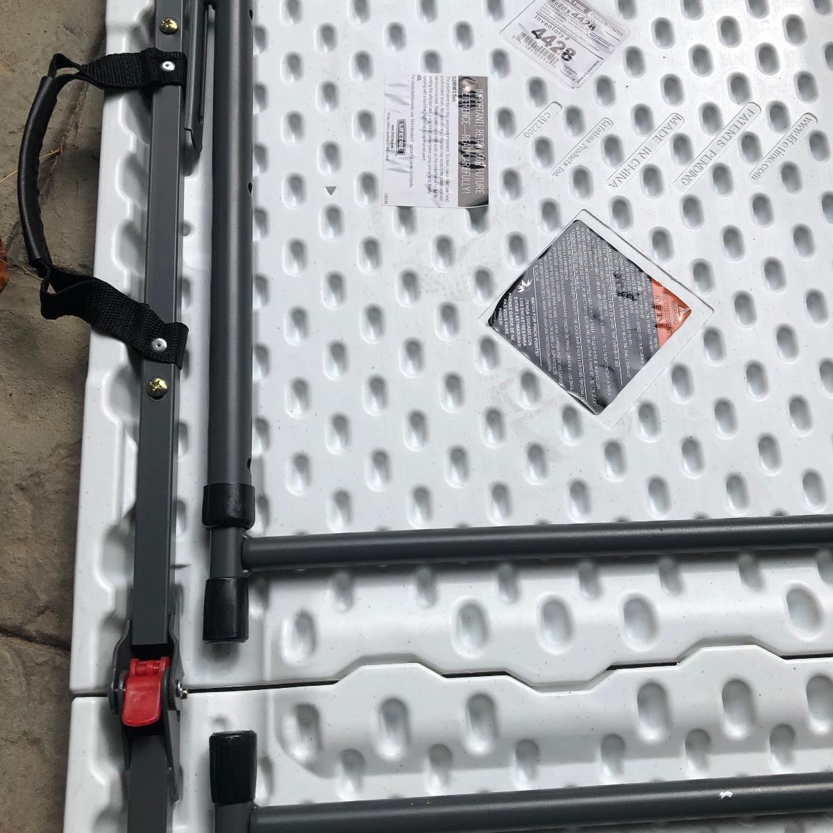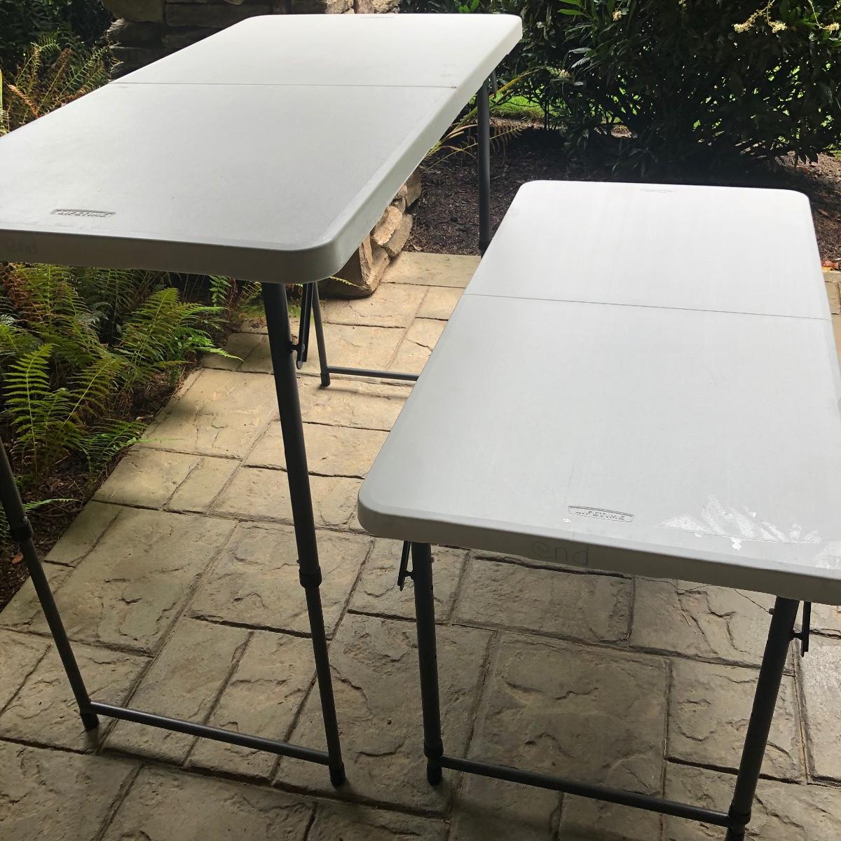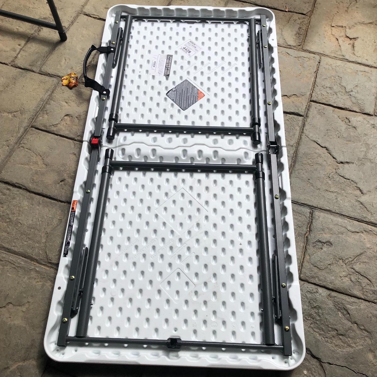 This lot contains three tables. The two Lifetime tables have plastic tops and folds in half for easy storage. They lock in place when folded. Their legs are also adjustable to adjust the height. The third table has a cardboard like top and only the legs fold in. Dimensions of the plastic tables are 48” x 24”. The cardboard table measures 47” x 19”. Local pick up only.