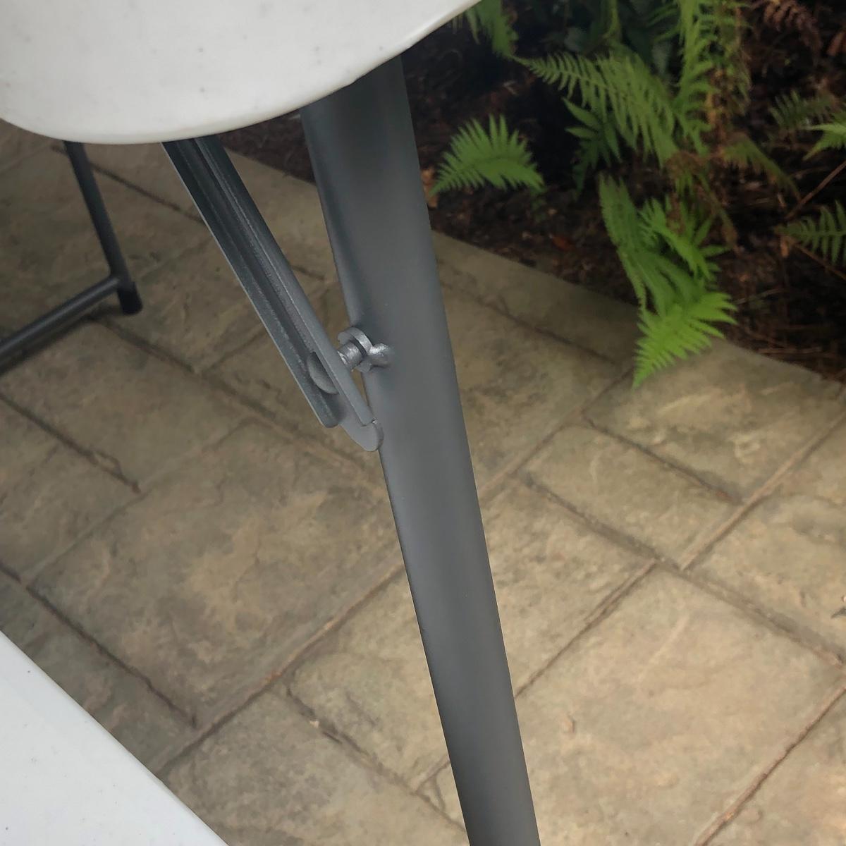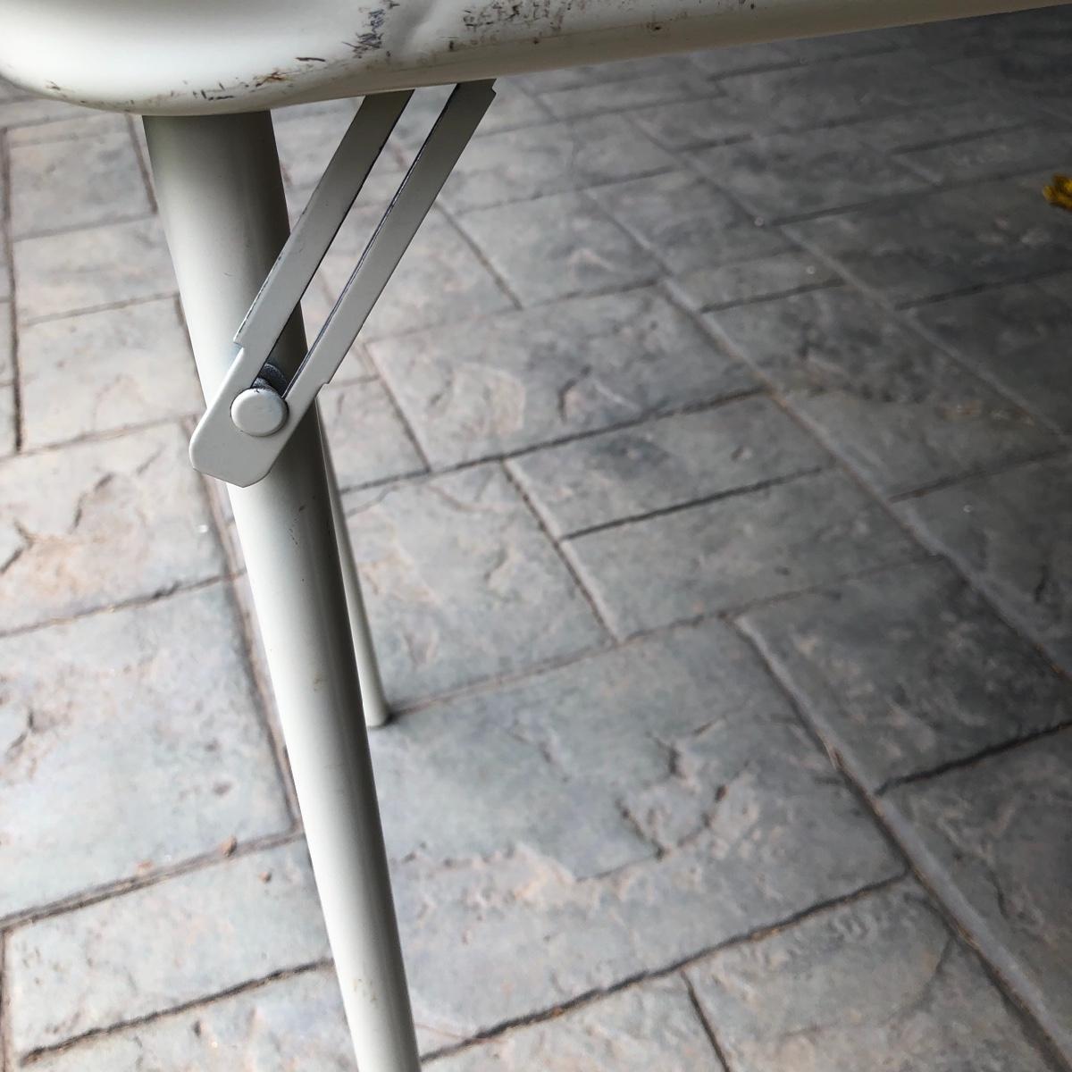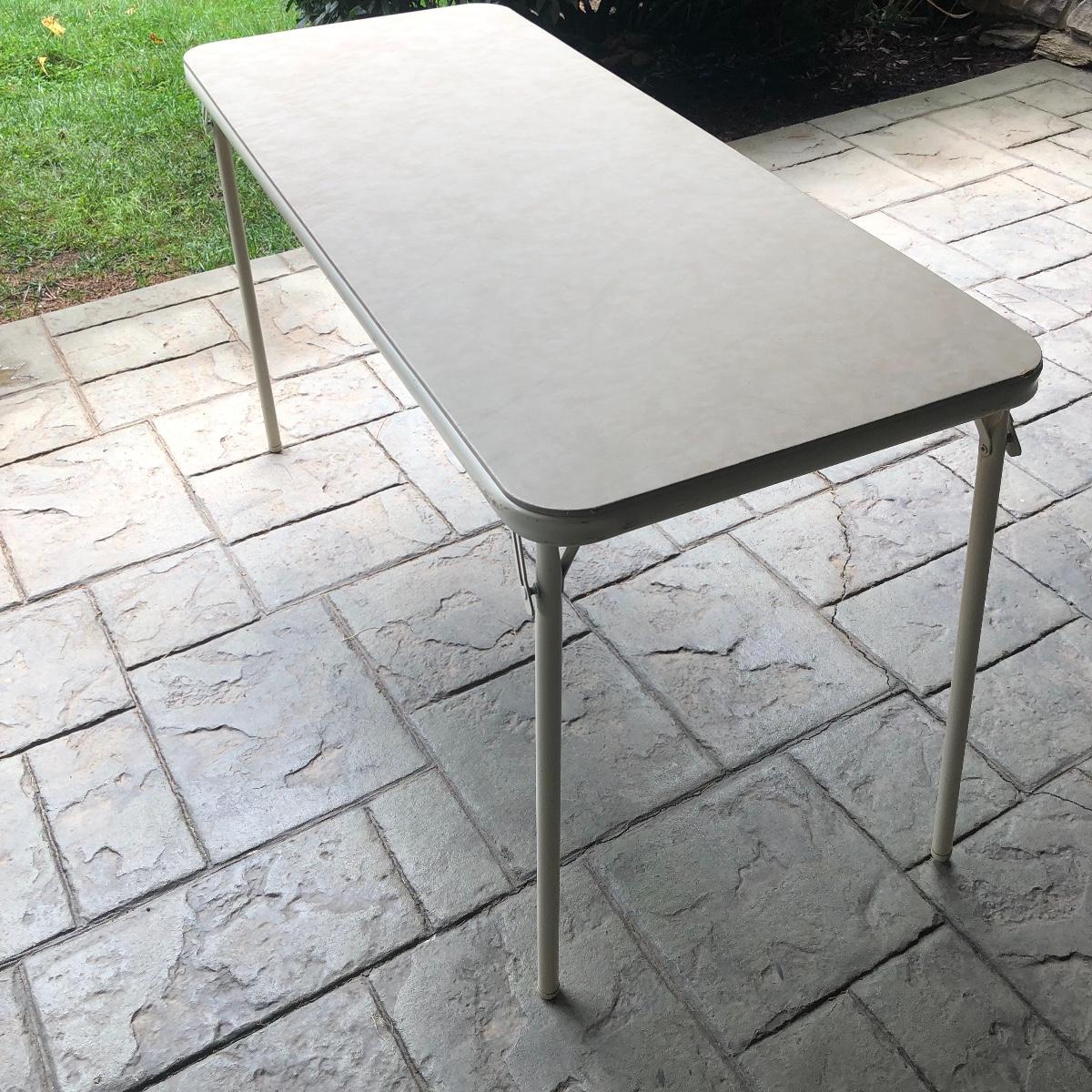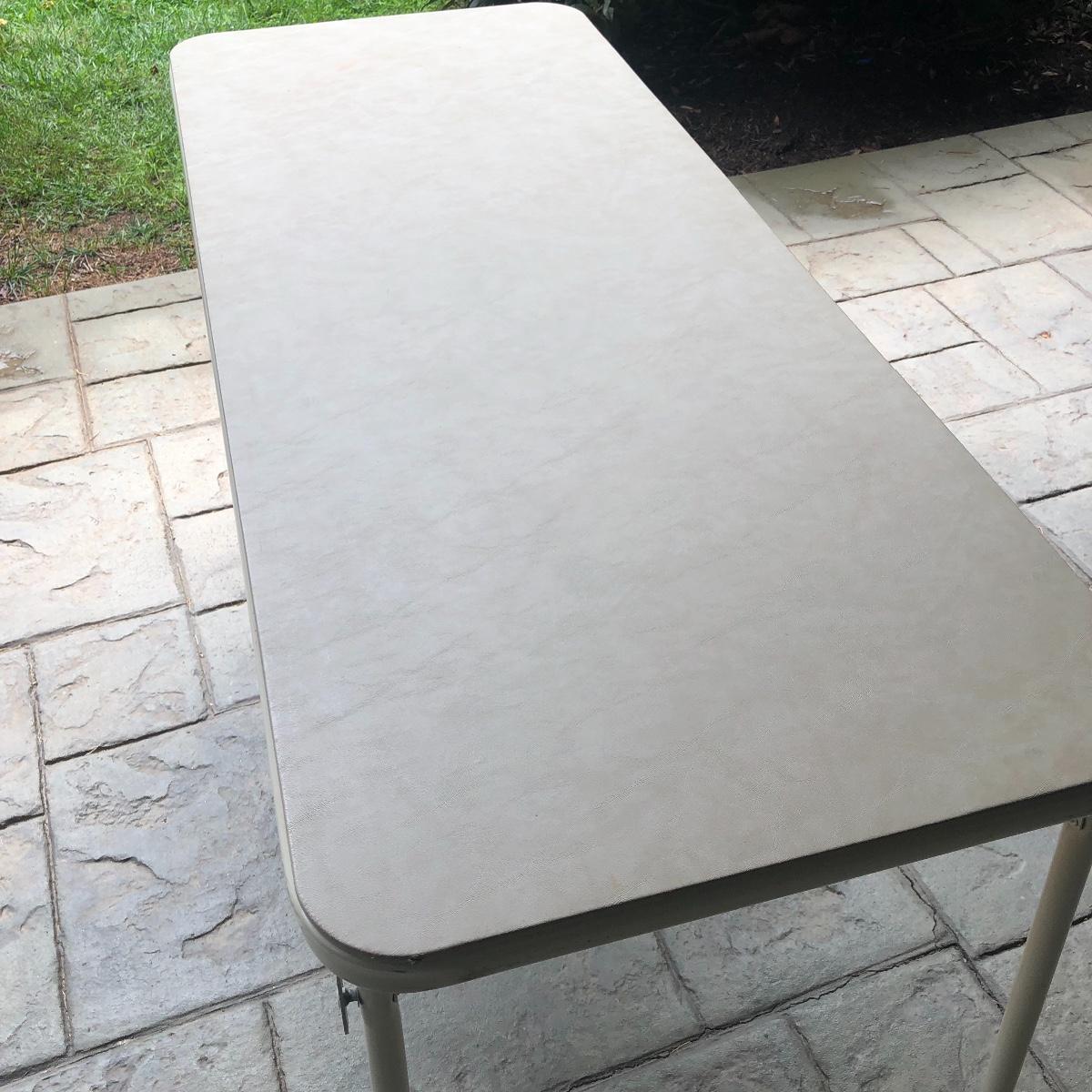 This lot contains three tables. The two Lifetime tables have plastic tops and folds in half for easy storage. They lock in place when folded. Their legs are also adjustable to adjust the height. The third table has a cardboard like top and only the legs fold in. Dimensions of the plastic tables are 48” x 24”. The cardboard table measures 47” x 19”. Local pick up only.