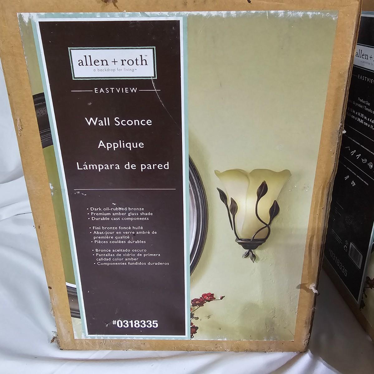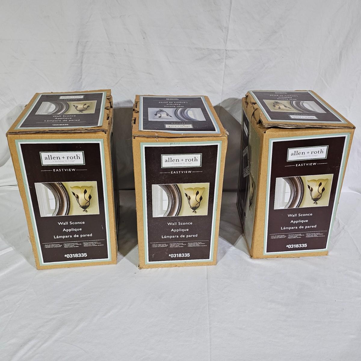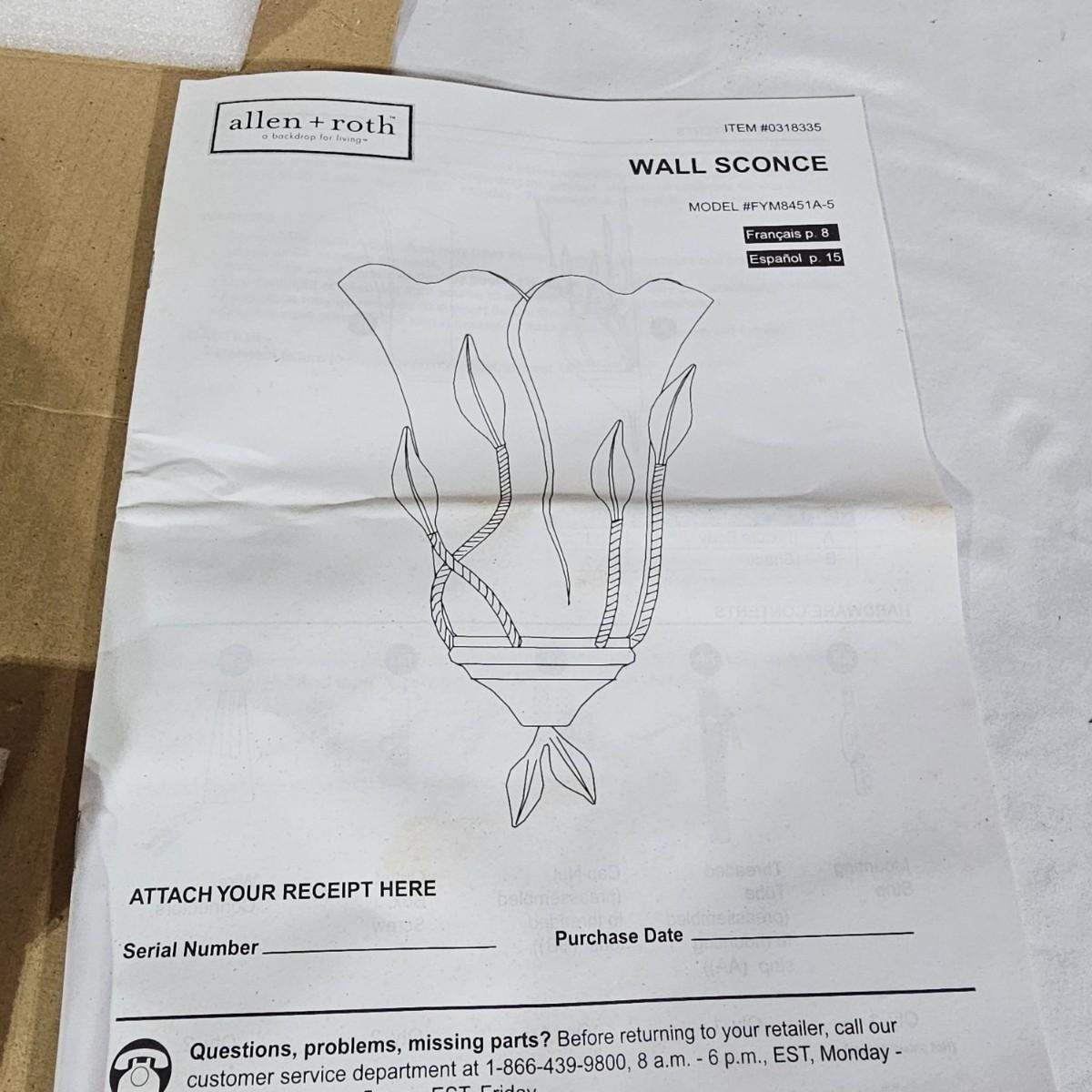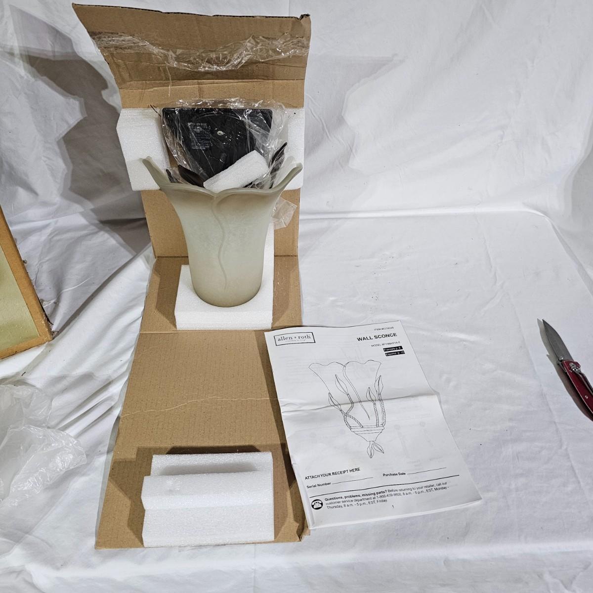 A trio of NIB electric wall sconces by Allen & Roth. Lights have tulip shaped frosted glass shade and petal-like metal base support. Designed to be hard-wired in location. Sconces measure 8" x 4.5" x 11.75"H. See photos for details. Untested. Shipping available.