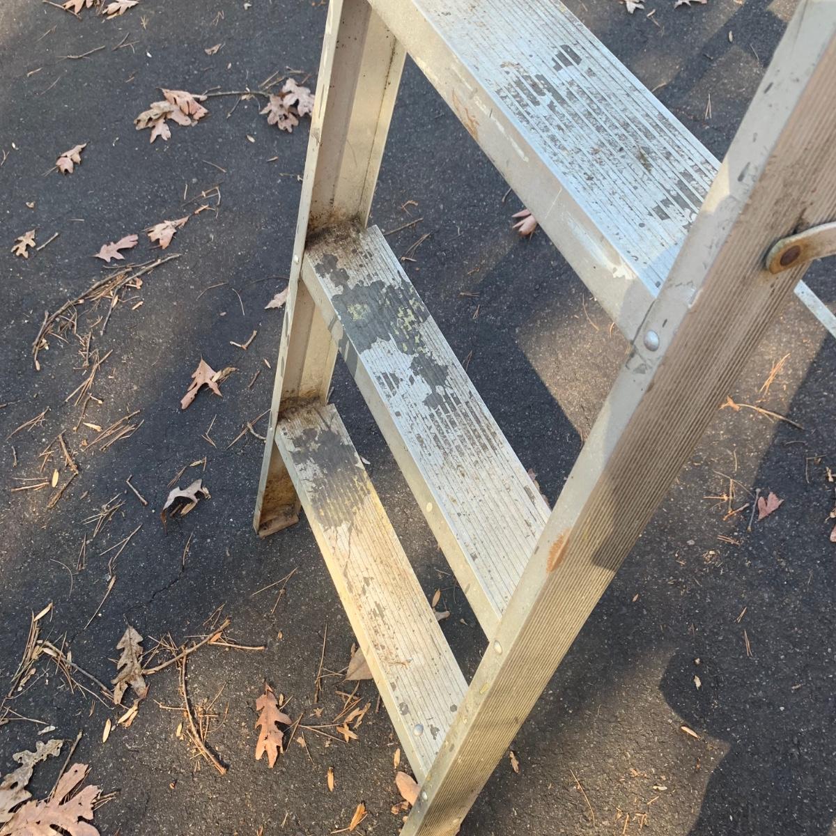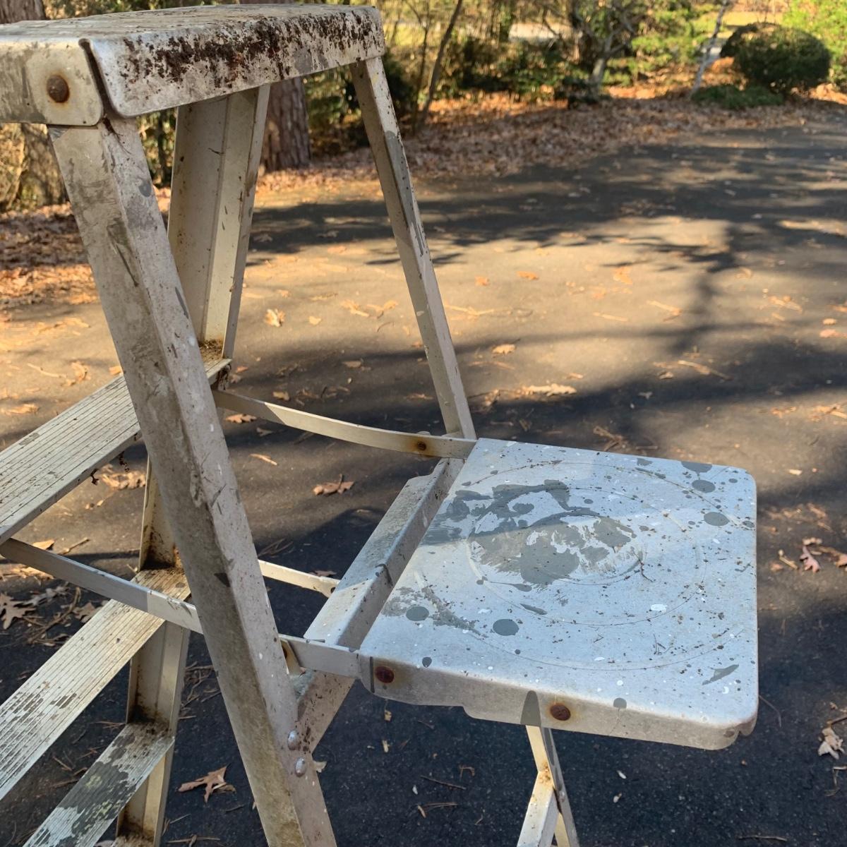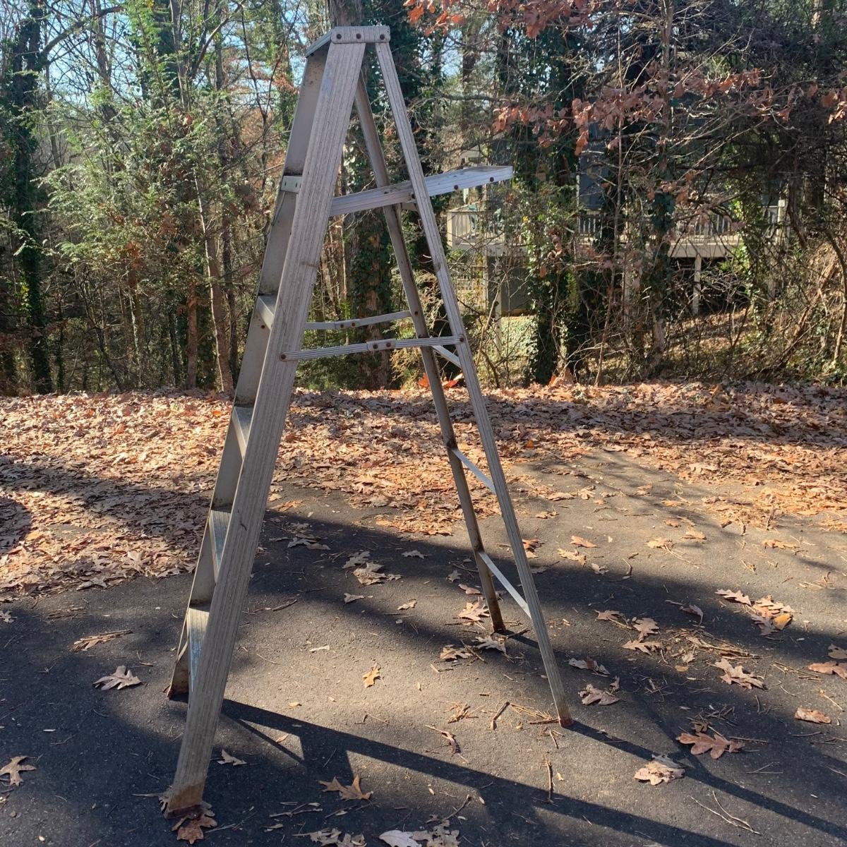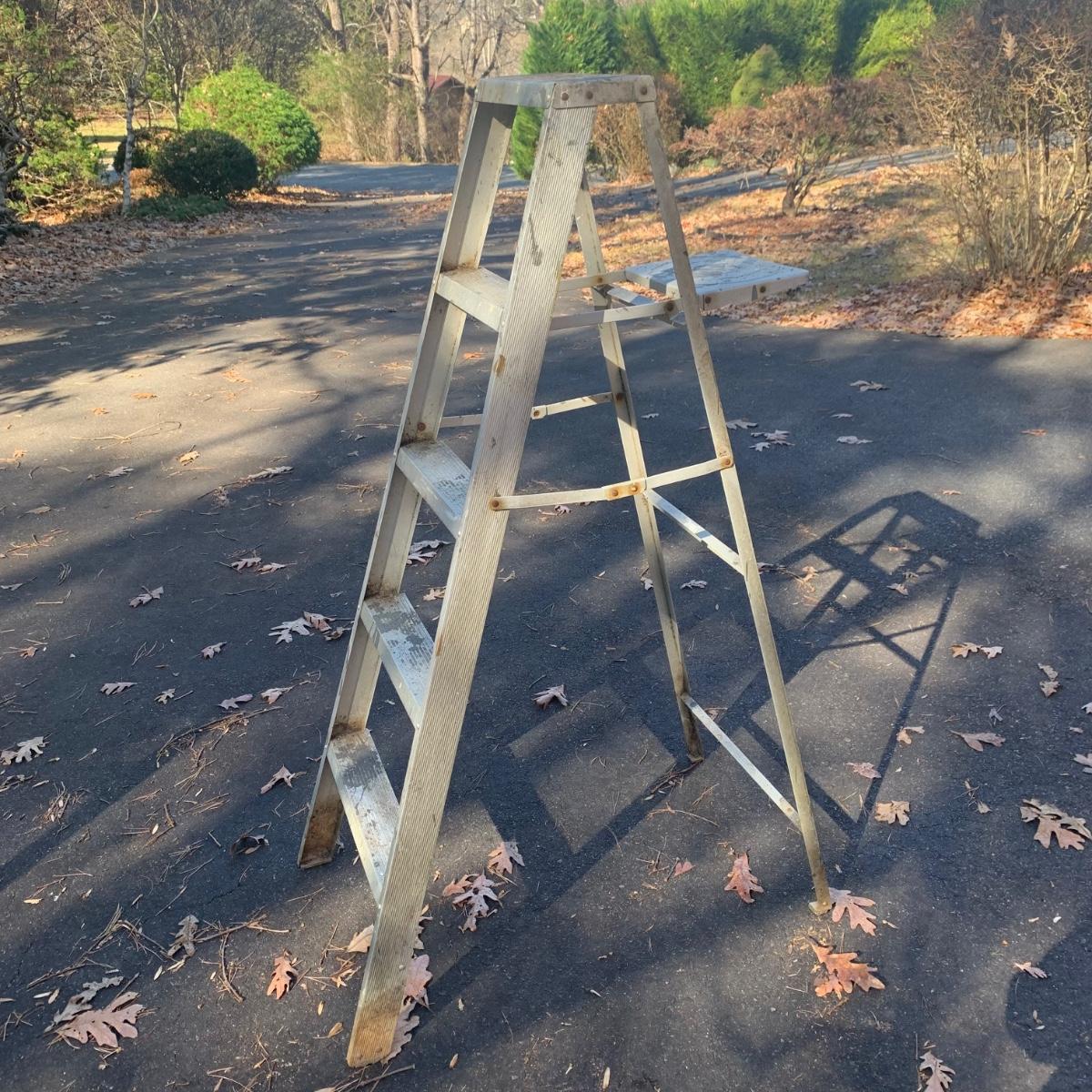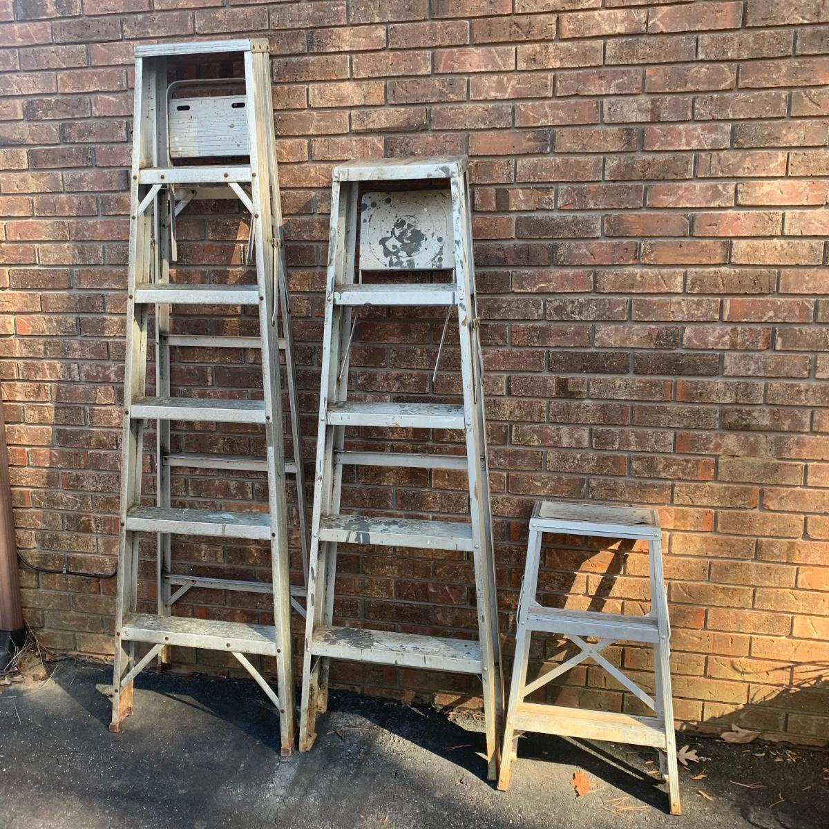 Three aluminum stepladders. The tallest is 6’, then 5’, and the smallest is 26”H. They have been used and are dusty and have some paint splatters.