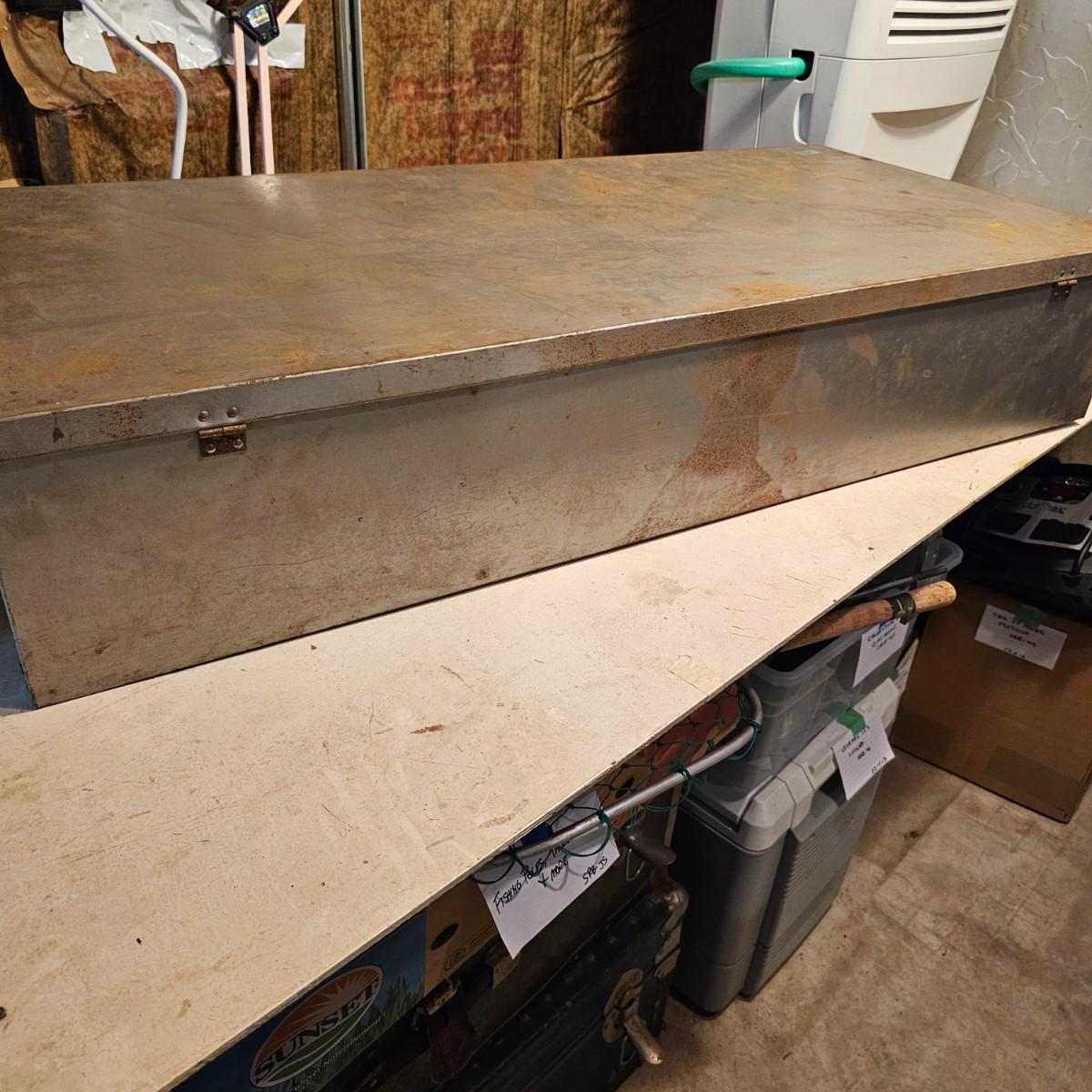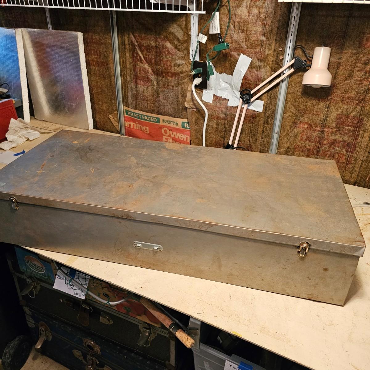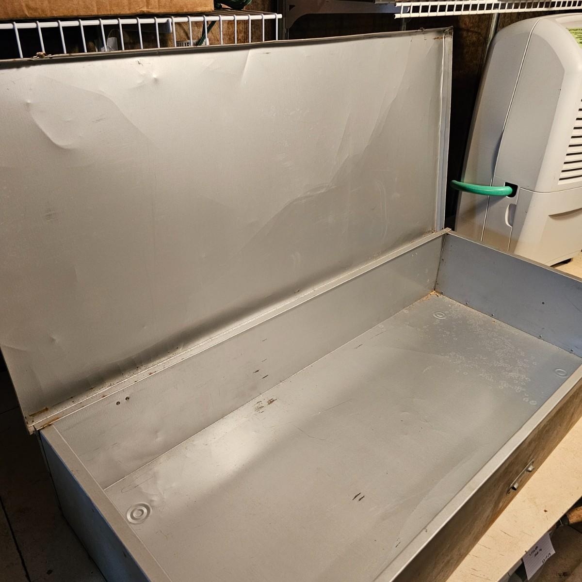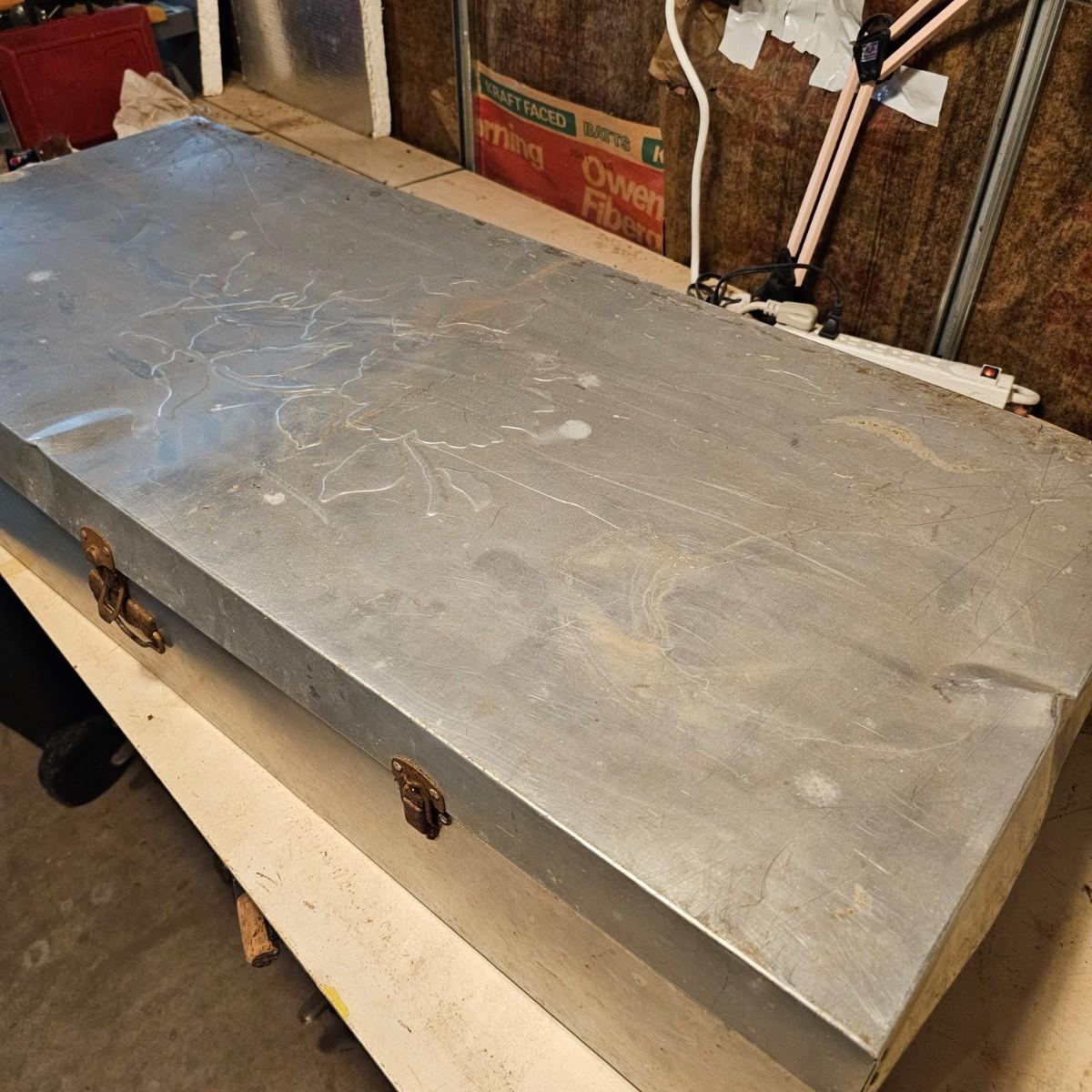 Three lightweight aluminum and metal storage boxes. Boxes have seen some wear and have dings here and there. Smallest item measures 40" x 11" x 5.5"H, has handle and latches. Middle size piece is 40" x 18" x 8"H, is missing handle on front. Large box is 42" xc18" x 8"H, has rusty hardware on front. See photos for details. Local pickup only.