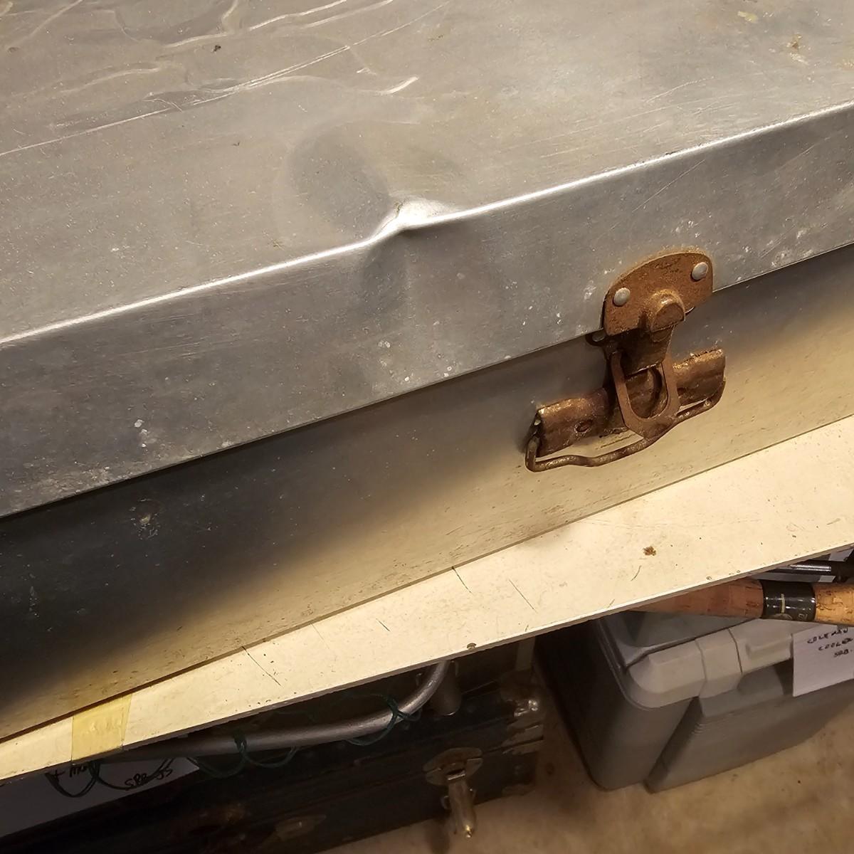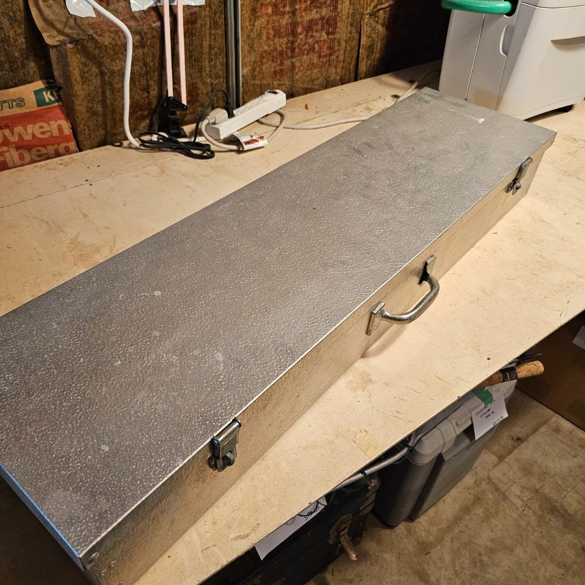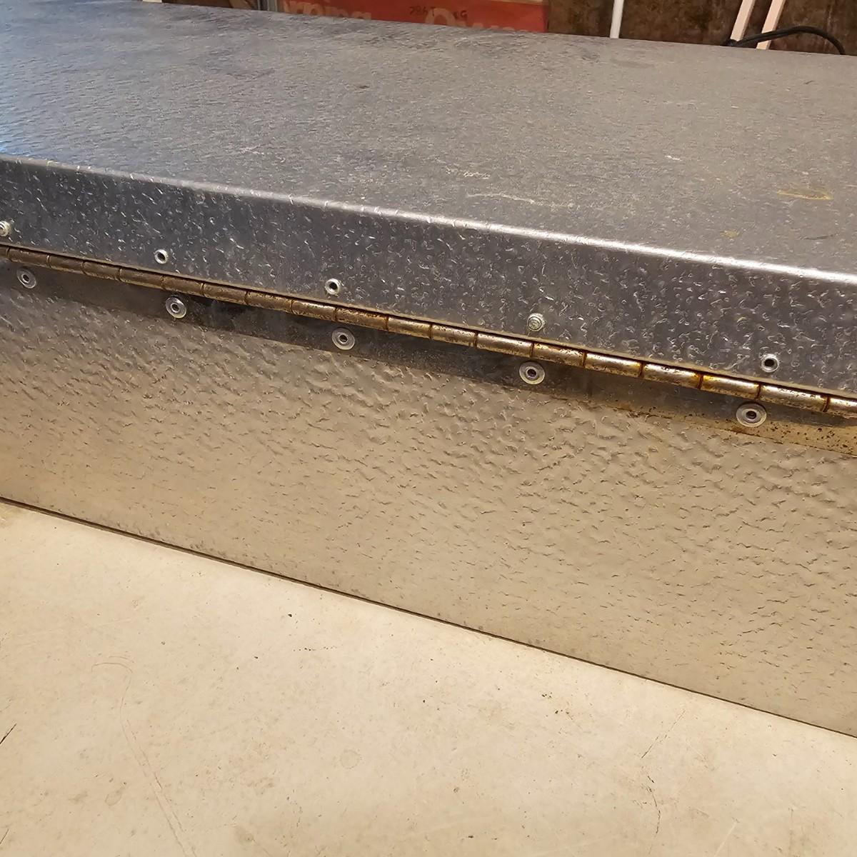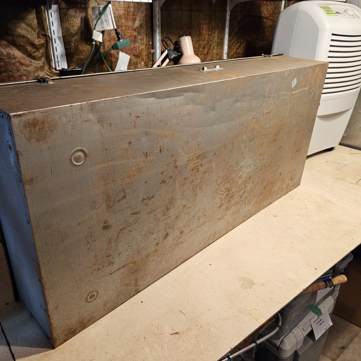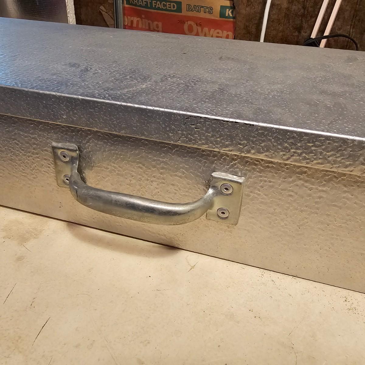 Three lightweight aluminum and metal storage boxes. Boxes have seen some wear and have dings here and there. Smallest item measures 40" x 11" x 5.5"H, has handle and latches. Middle size piece is 40" x 18" x 8"H, is missing handle on front. Large box is 42" xc18" x 8"H, has rusty hardware on front. See photos for details. Local pickup only.