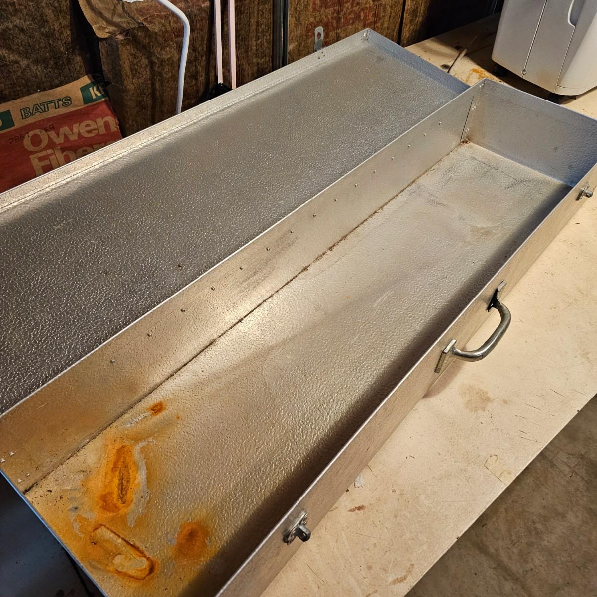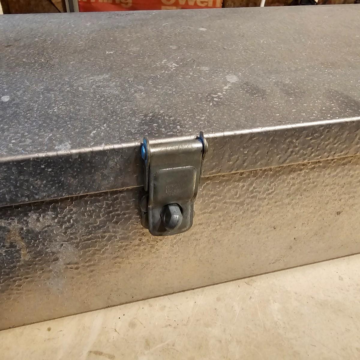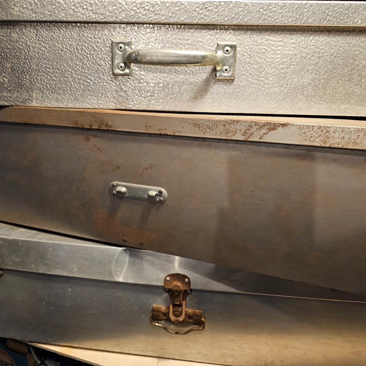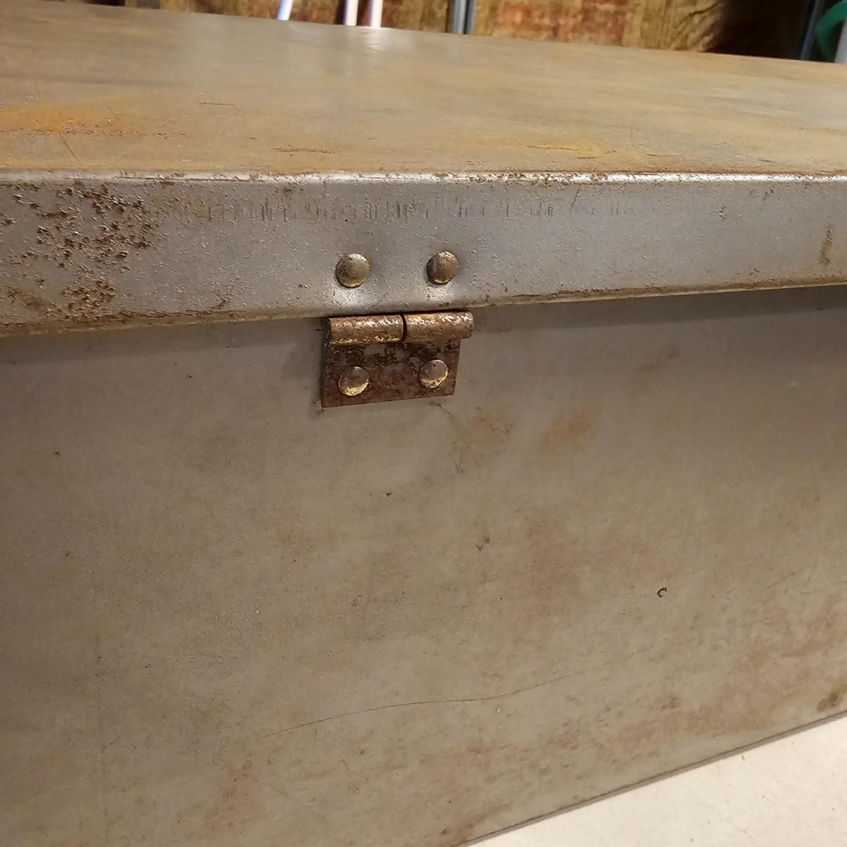 Three lightweight aluminum and metal storage boxes. Boxes have seen some wear and have dings here and there. Smallest item measures 40" x 11" x 5.5"H, has handle and latches. Middle size piece is 40" x 18" x 8"H, is missing handle on front. Large box is 42" xc18" x 8"H, has rusty hardware on front. See photos for details. Local pickup only.