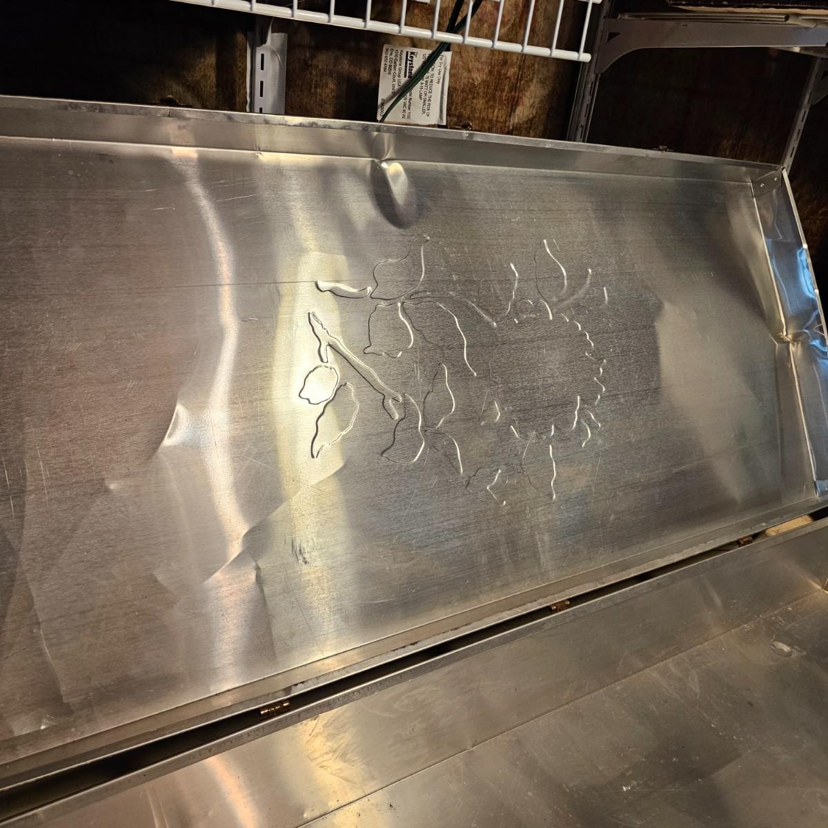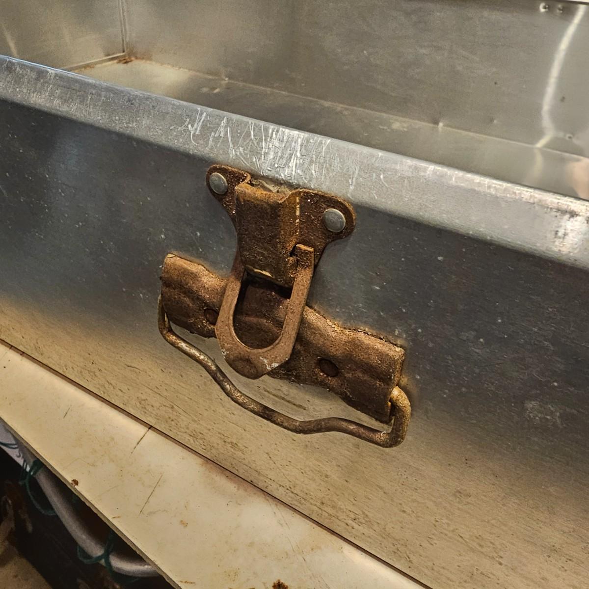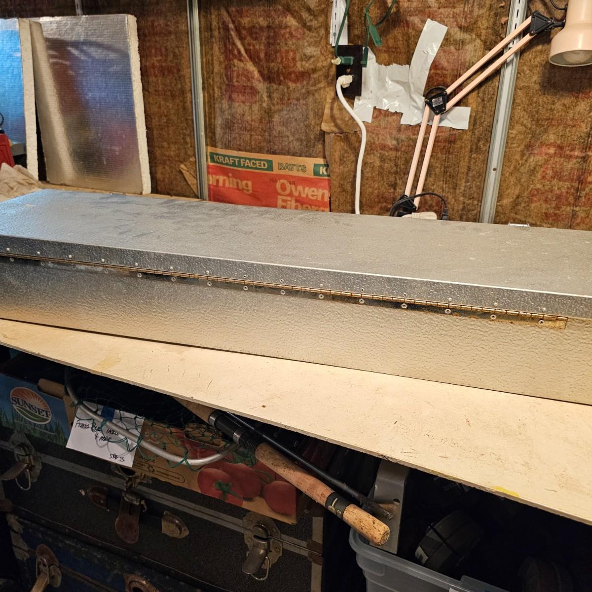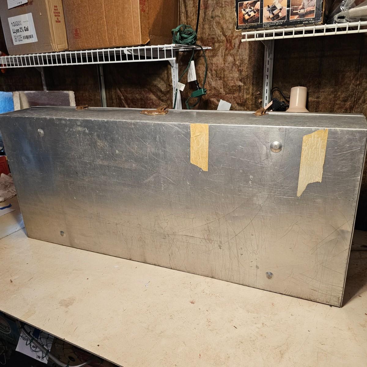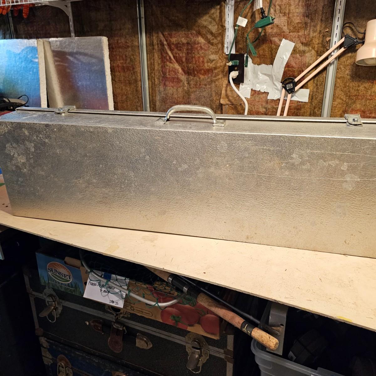 Three lightweight aluminum and metal storage boxes. Boxes have seen some wear and have dings here and there. Smallest item measures 40" x 11" x 5.5"H, has handle and latches. Middle size piece is 40" x 18" x 8"H, is missing handle on front. Large box is 42" xc18" x 8"H, has rusty hardware on front. See photos for details. Local pickup only.