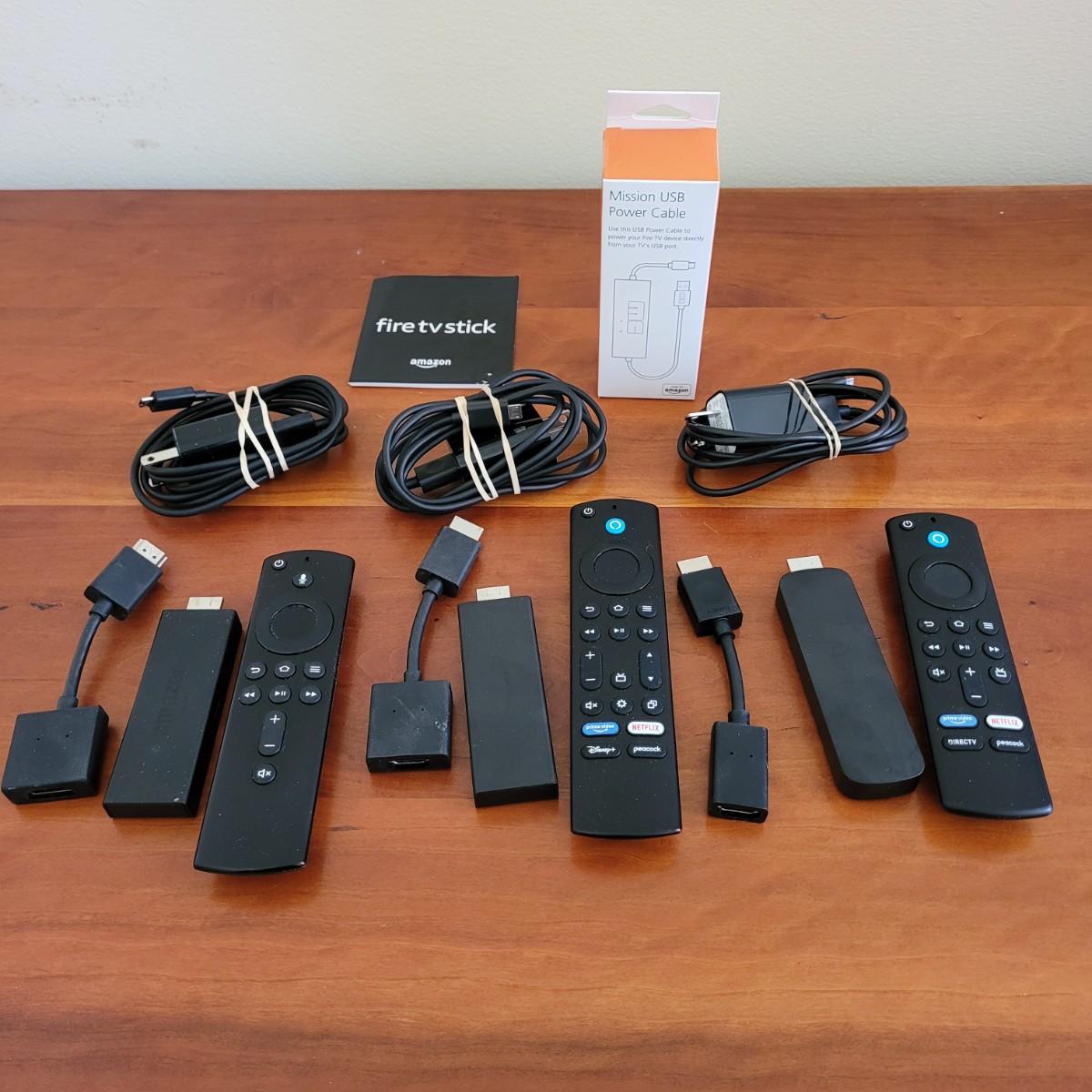 This lot includes three Amazon Fire TV Sticks. Each firestick includes power cord, HDMI extender, and remote. Also included is one USB adapter to allow the firestick to be powered from the USB port on your TV as opposed to a wall outlet. All firesticks were working when removed from their previous setup.