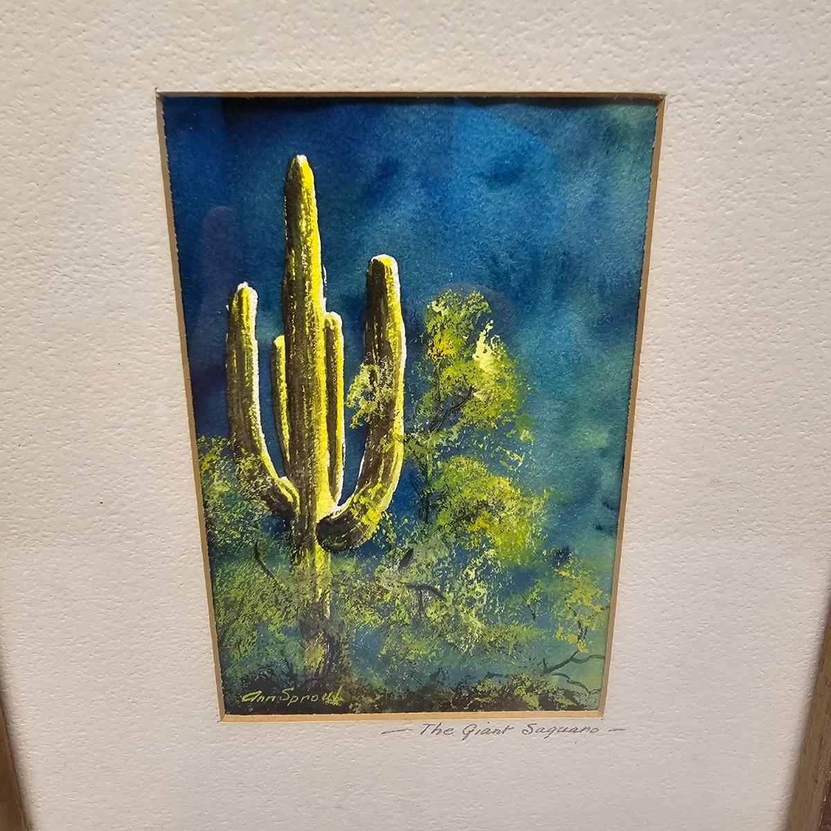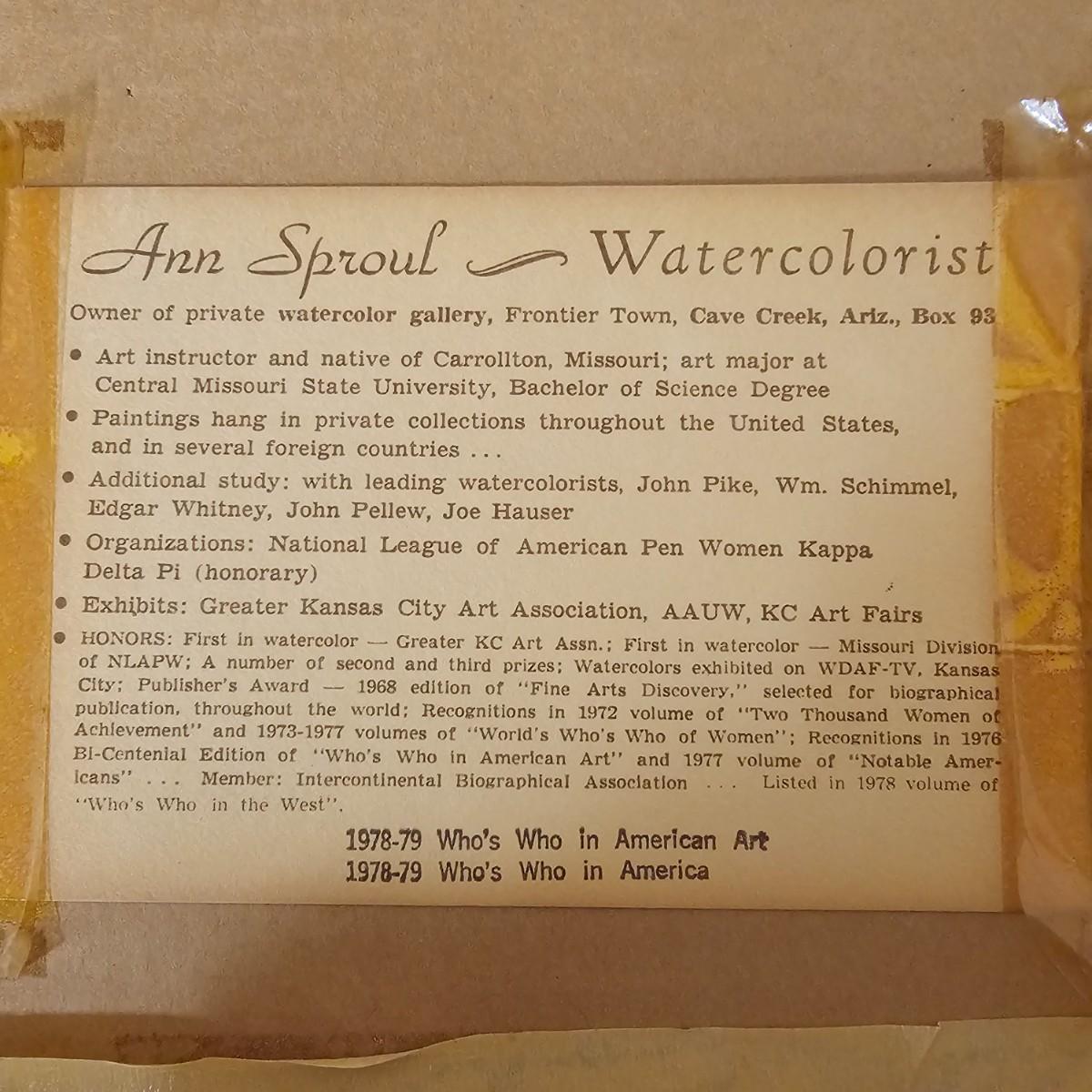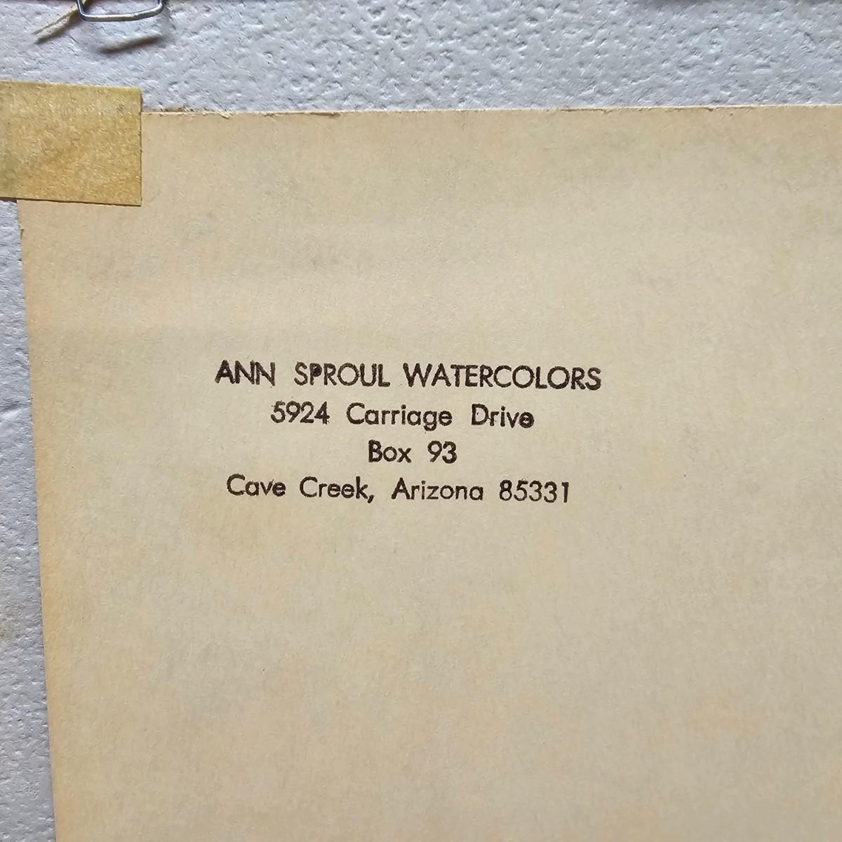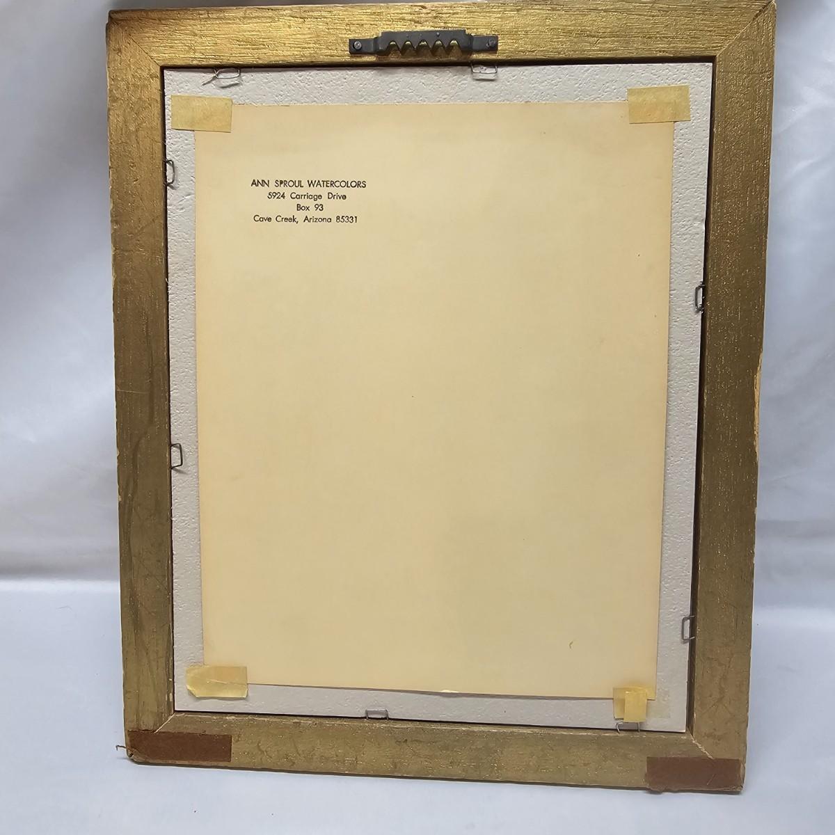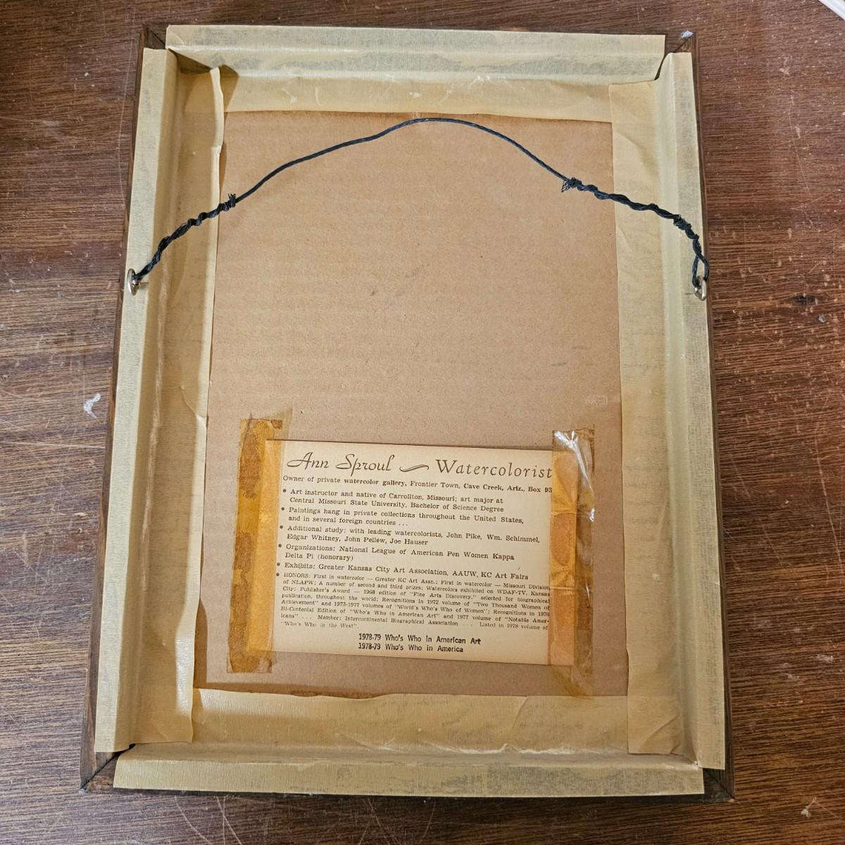 Three Southwestern style images by Ann Sproul in her classic watercolor style. All three paintings are original, have her signature on them and the titles are hand pencil signed. Large image is 10.5" x 13.5"H, two smaller are 10" x 12"H. Wood frames and under glass for all. See photos for details. Shipping available. Shipping can be costly. We suggest contacting our preferred local shipping provider, Postage Express, with dimensions and getting an estimate before bidding: (828) 255-9250 or shipping@postageexpressnc.com.