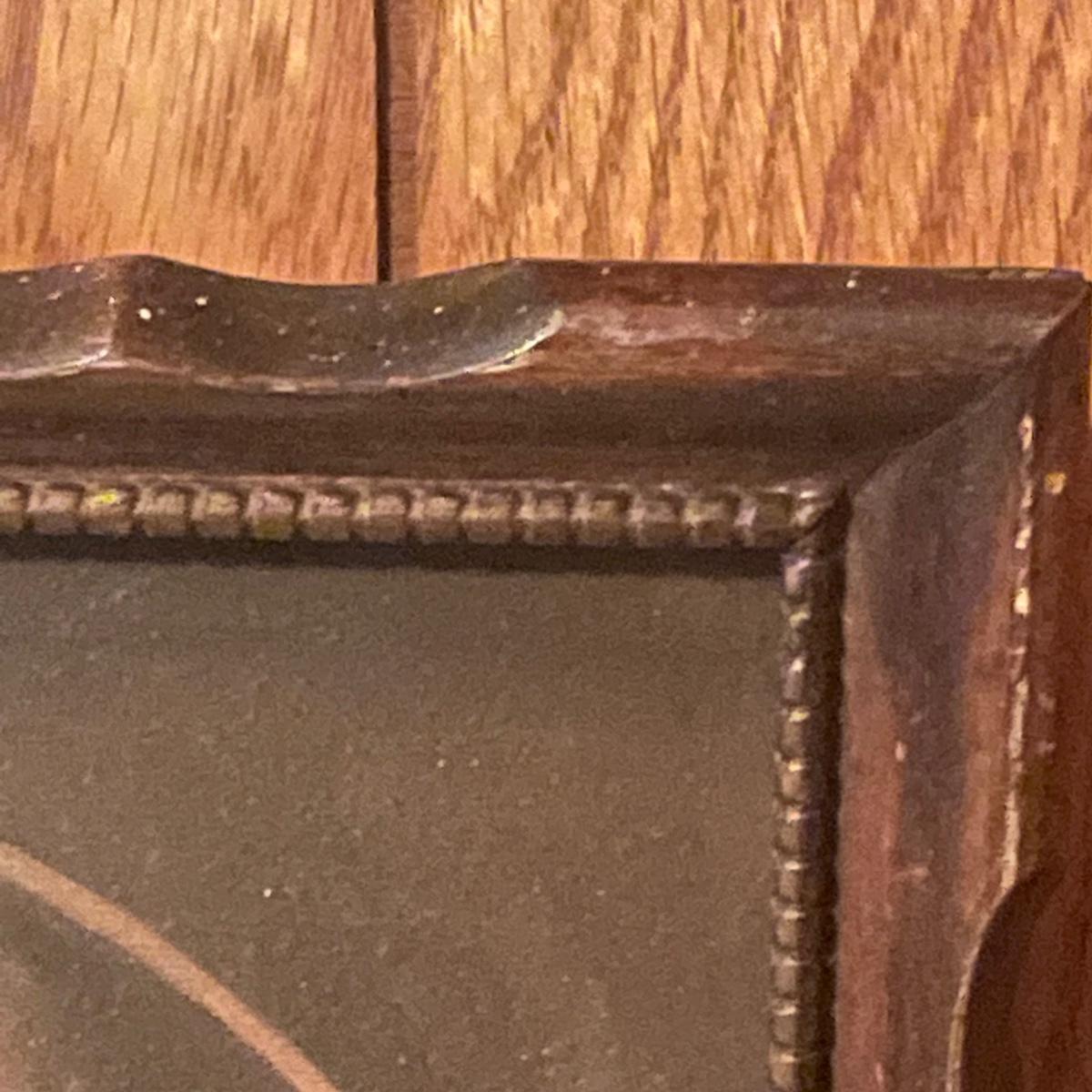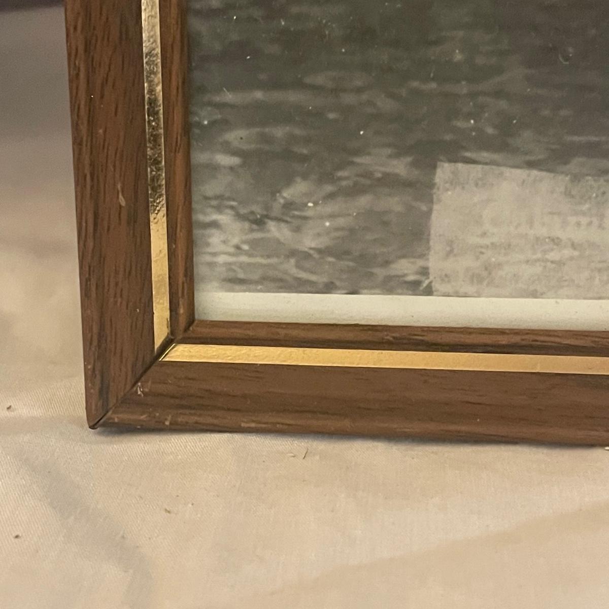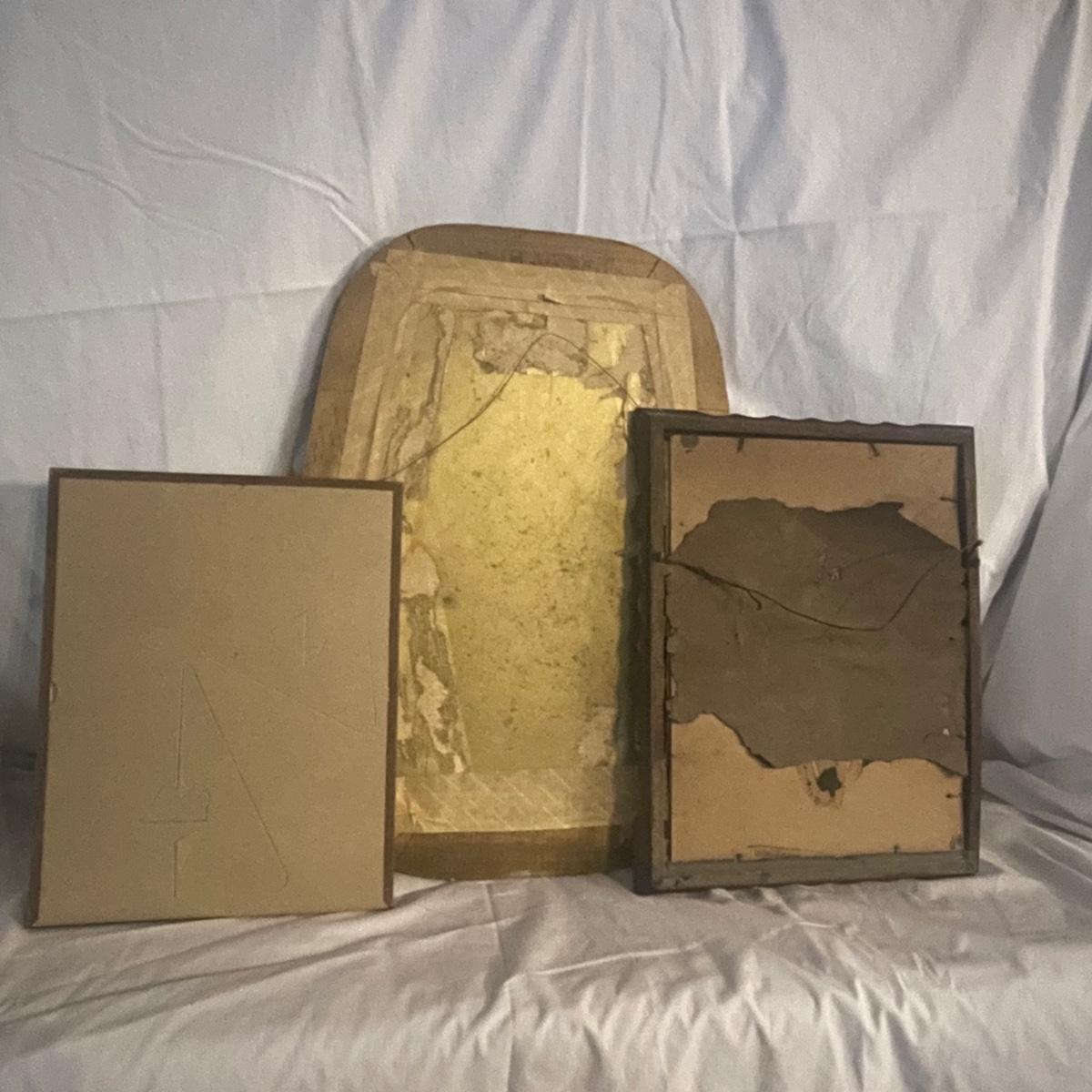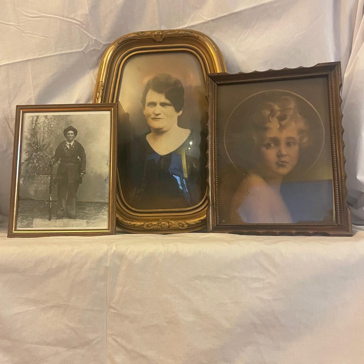 Three antique framed photos. The largest frame with the rounded corners measures 17” x 13” x 1.5”. This gold colored resin like frame has an area where the paint has chipped, see image. The other two frames are wood.