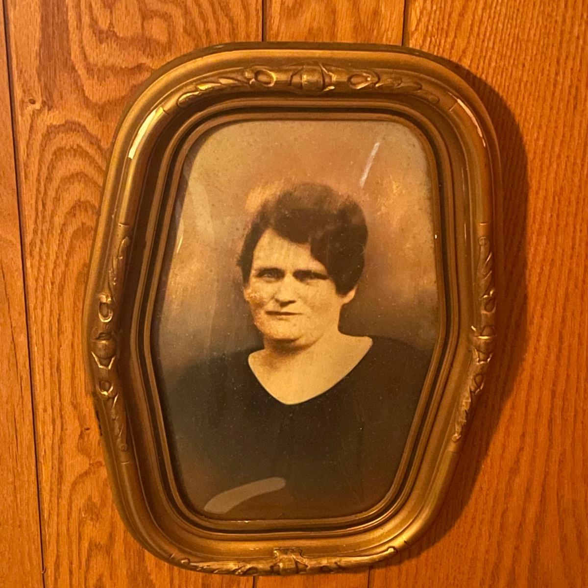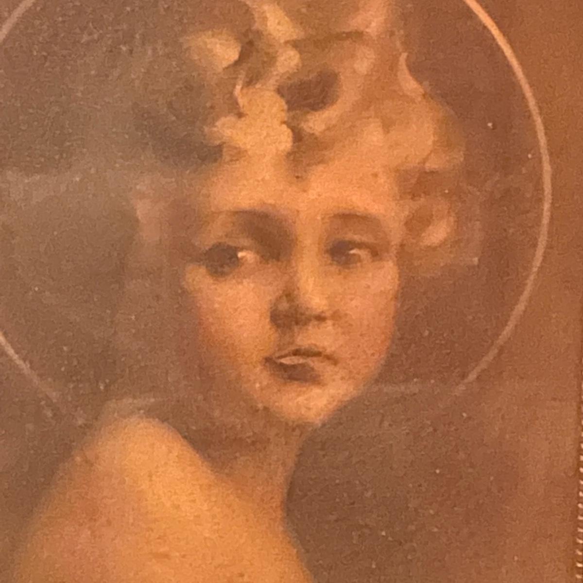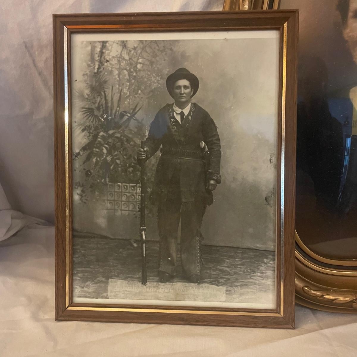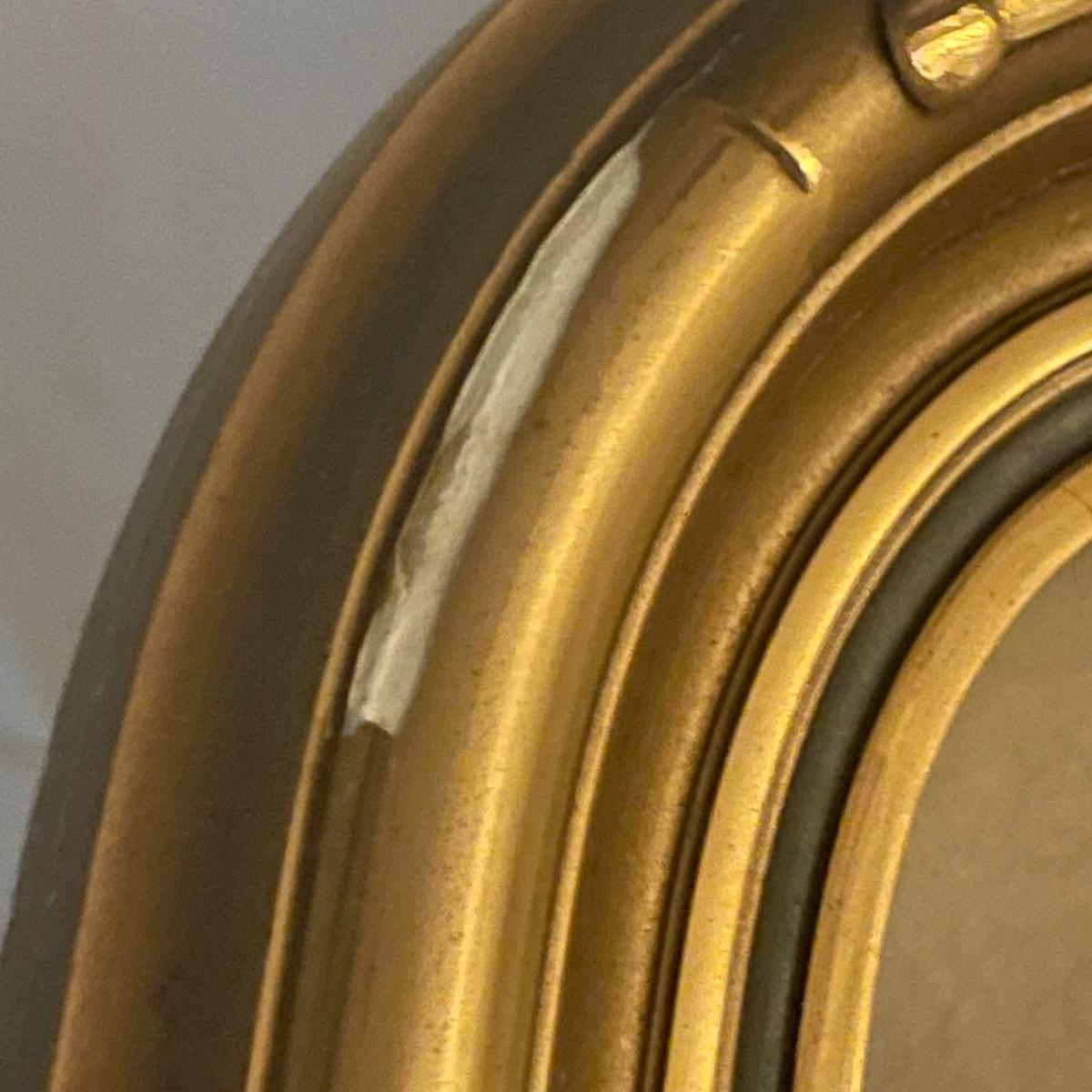 Three antique framed photos. The largest frame with the rounded corners measures 17” x 13” x 1.5”. This gold colored resin like frame has an area where the paint has chipped, see image. The other two frames are wood.