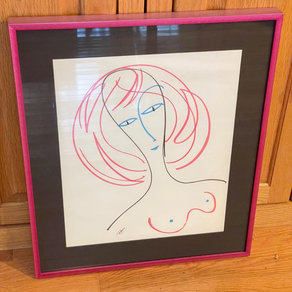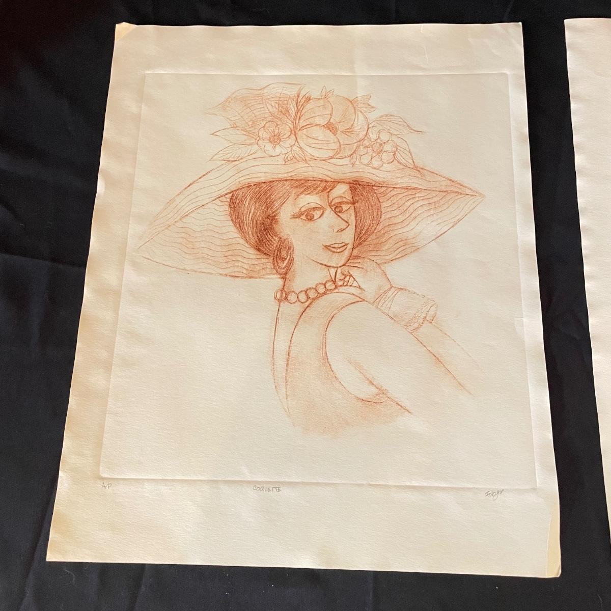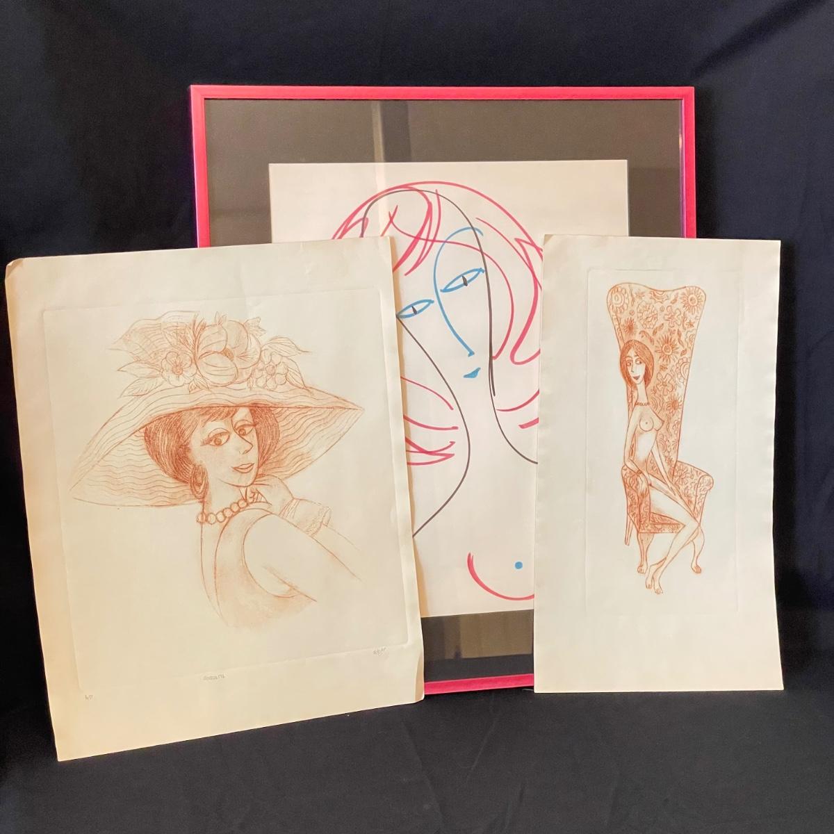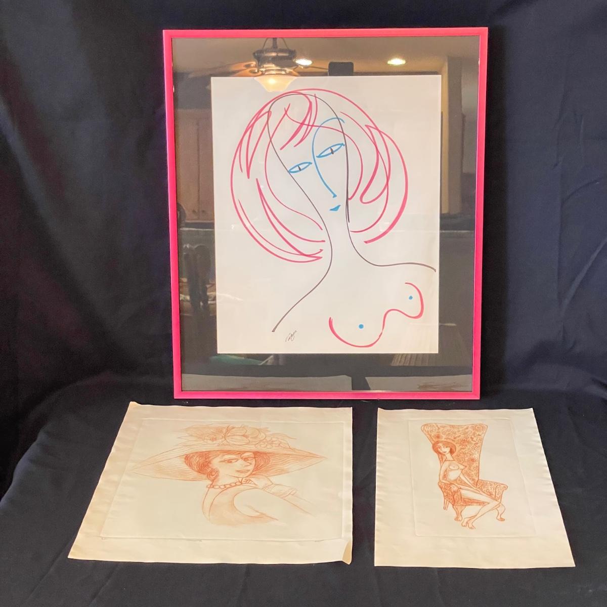 Three pieces of art likely by “Girls will be Girls” cartoonist Franklin Folger. The shiny magenta metal framed art is signed Folger, art sits on a black mat behind glass. Frame measures 18.5” x 22”H. Lot also features what appears to be two sepia colored pencil drawings. The larger art has pencil signed “A/D” or “A/P” along with a likely title of “Coquette” and “Folger”. The backside has a Franklin Folger stamp. The smaller art appears to be the same medium, this piece has no identifying markings. Both pencil art have indentations that appear to be akin to matting. The “Coquette” piece is 13.5” x 17”H, the smaller art is 9” x 17”H. Shipping available. Shipping can be costly. We suggest contacting our preferred local shipping provider, Postage Express, with dimensions and getting an estimate before bidding: (828) 255-9250 or email shipping@postageexpressnc.com