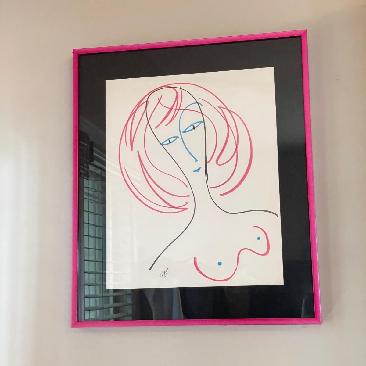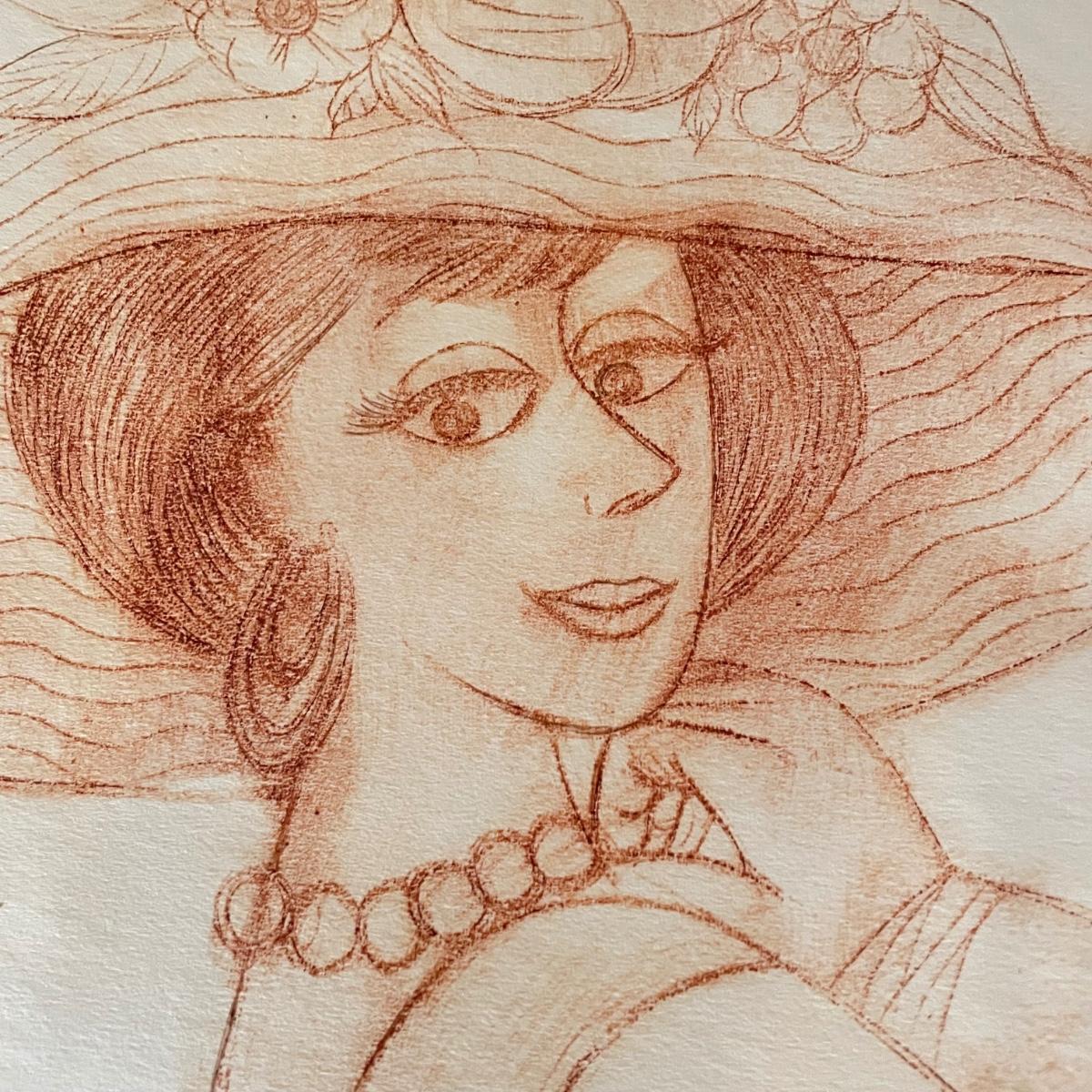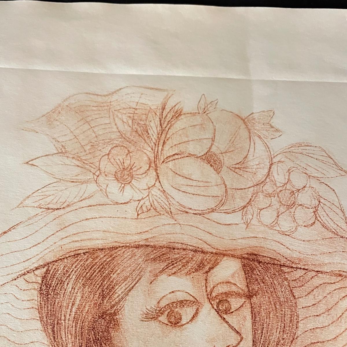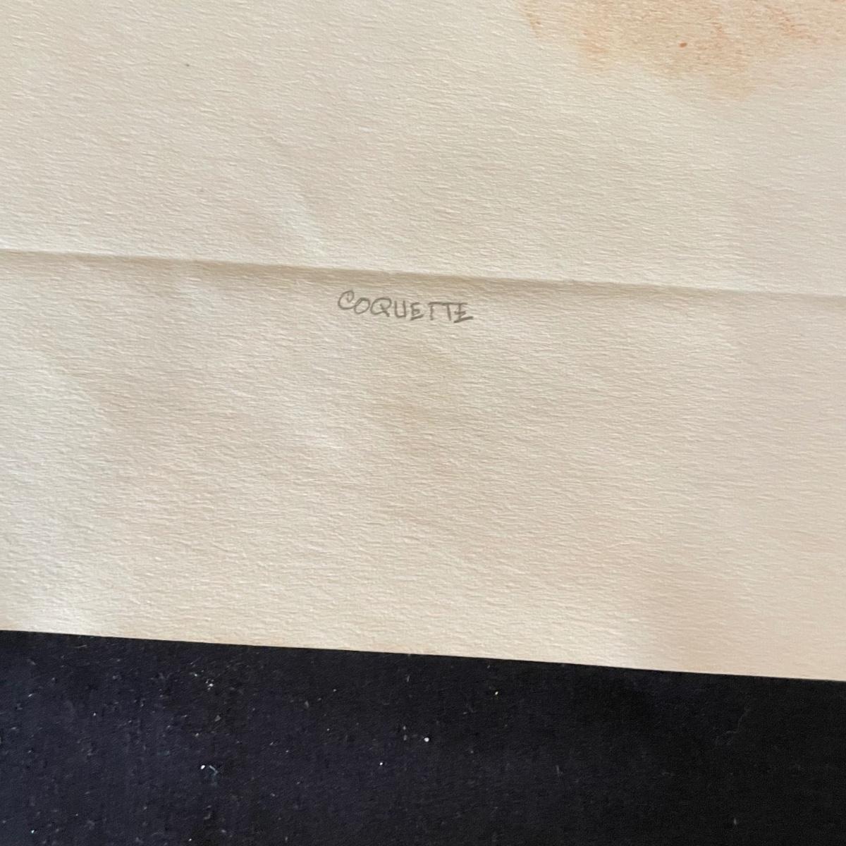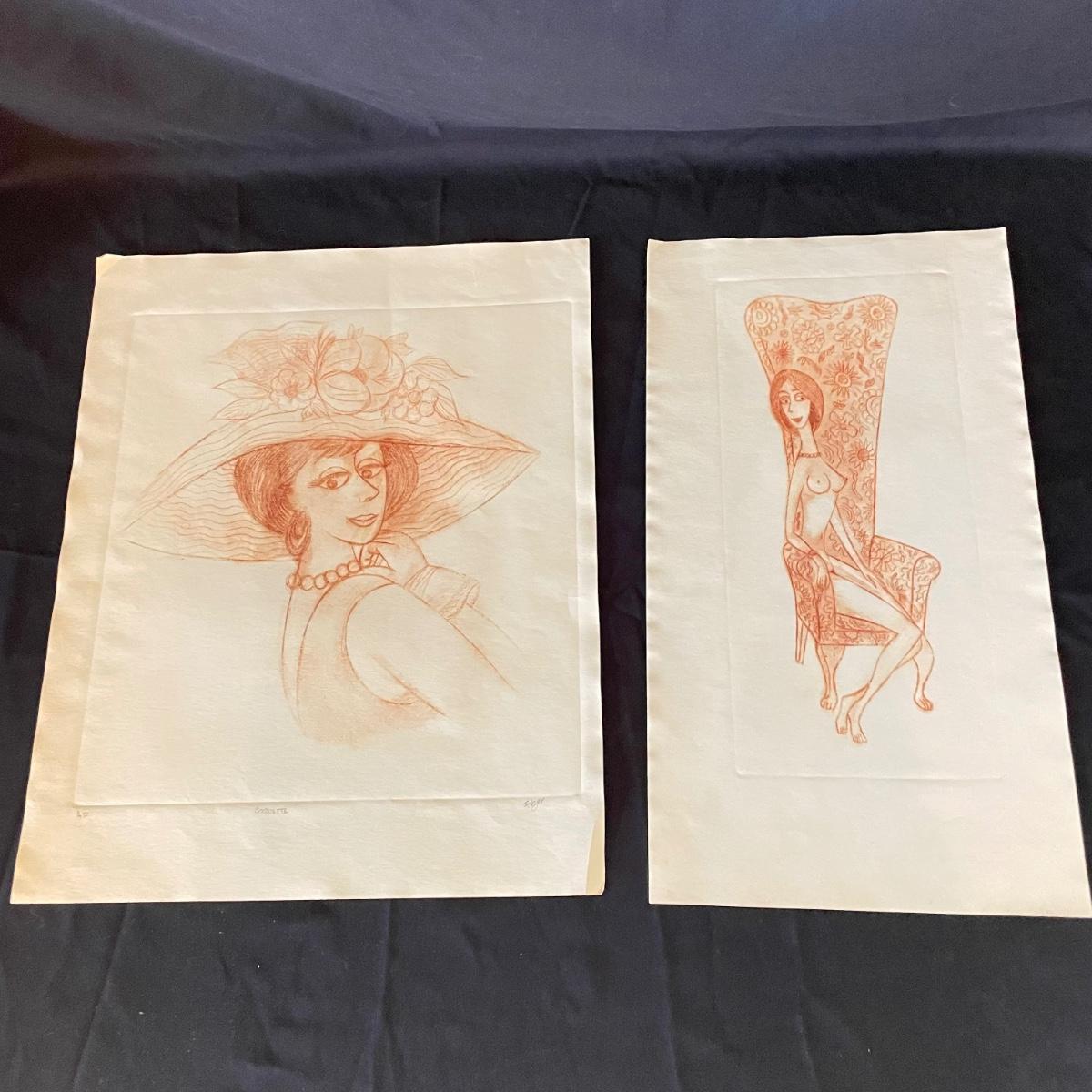 Three pieces of art likely by “Girls will be Girls” cartoonist Franklin Folger. The shiny magenta metal framed art is signed Folger, art sits on a black mat behind glass. Frame measures 18.5” x 22”H. Lot also features what appears to be two sepia colored pencil drawings. The larger art has pencil signed “A/D” or “A/P” along with a likely title of “Coquette” and “Folger”. The backside has a Franklin Folger stamp. The smaller art appears to be the same medium, this piece has no identifying markings. Both pencil art have indentations that appear to be akin to matting. The “Coquette” piece is 13.5” x 17”H, the smaller art is 9” x 17”H. Shipping available. Shipping can be costly. We suggest contacting our preferred local shipping provider, Postage Express, with dimensions and getting an estimate before bidding: (828) 255-9250 or email shipping@postageexpressnc.com