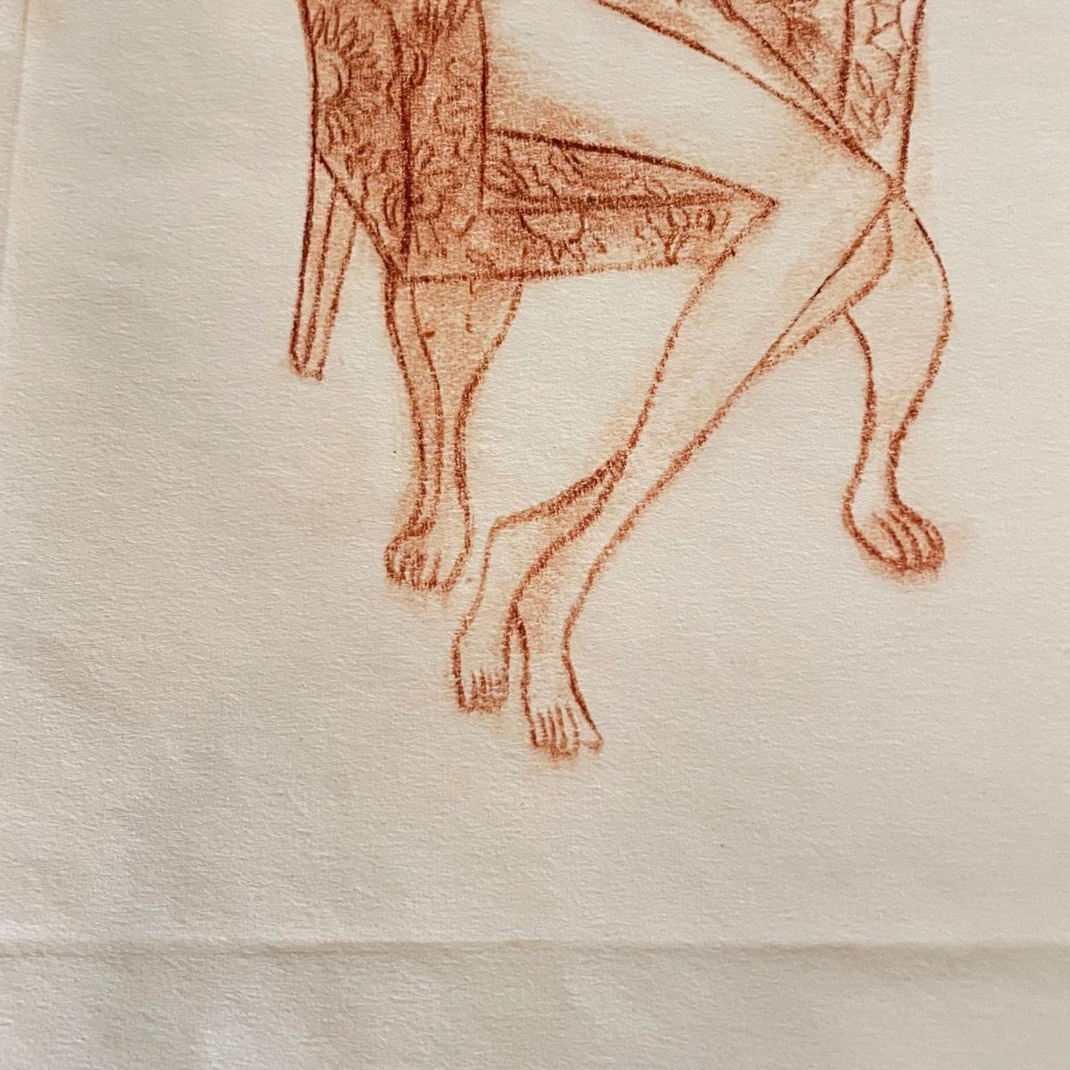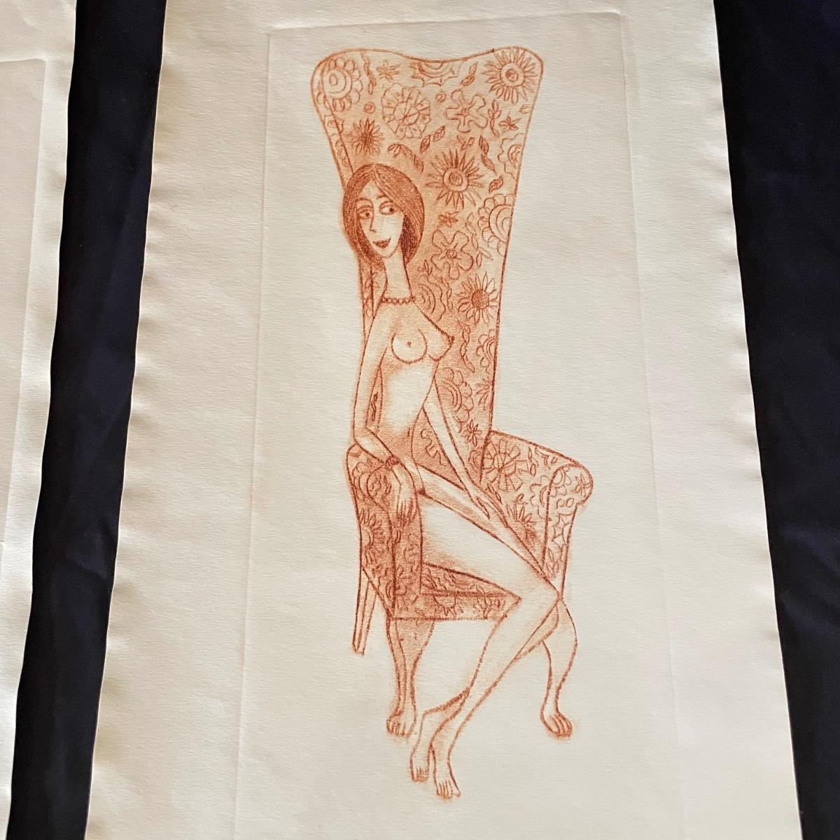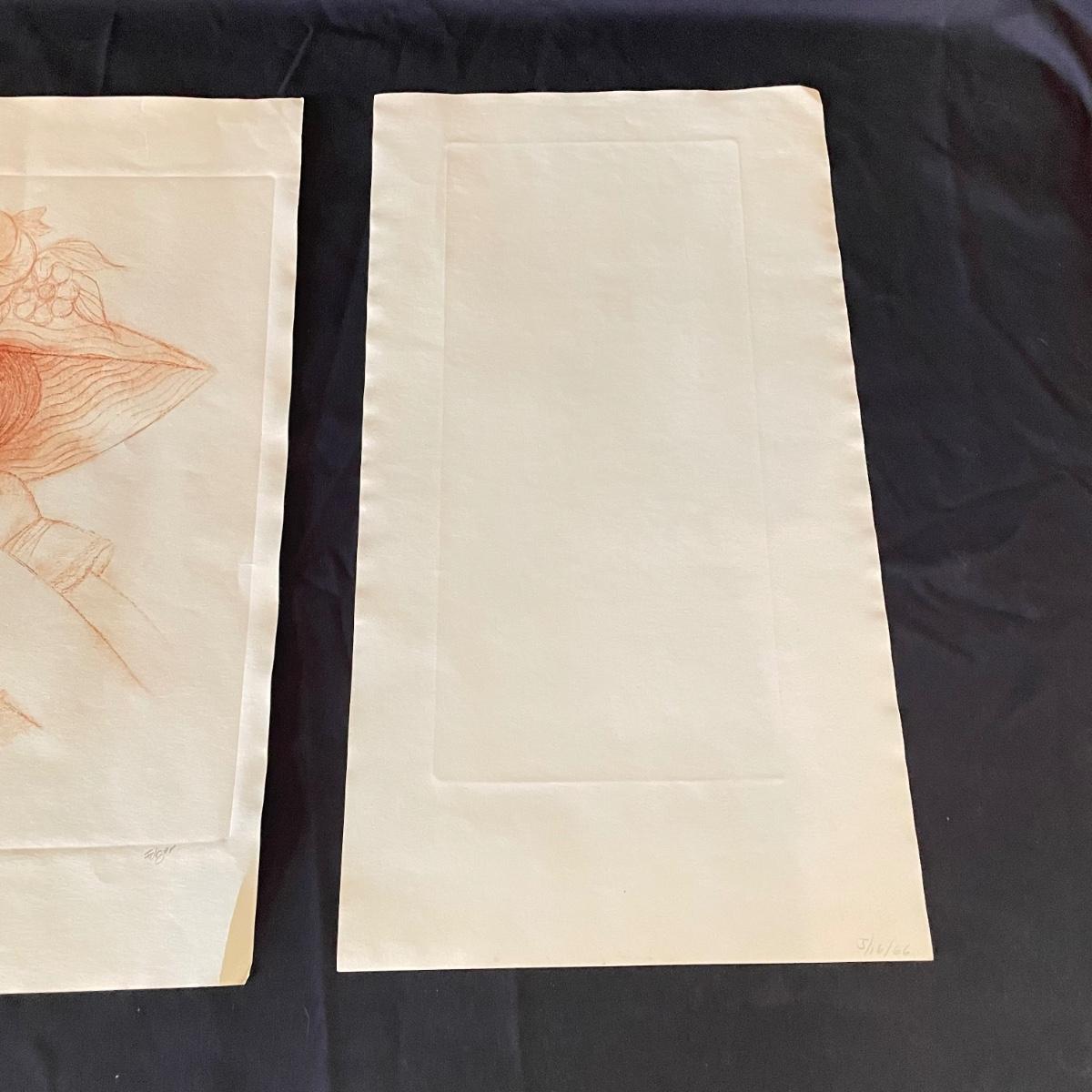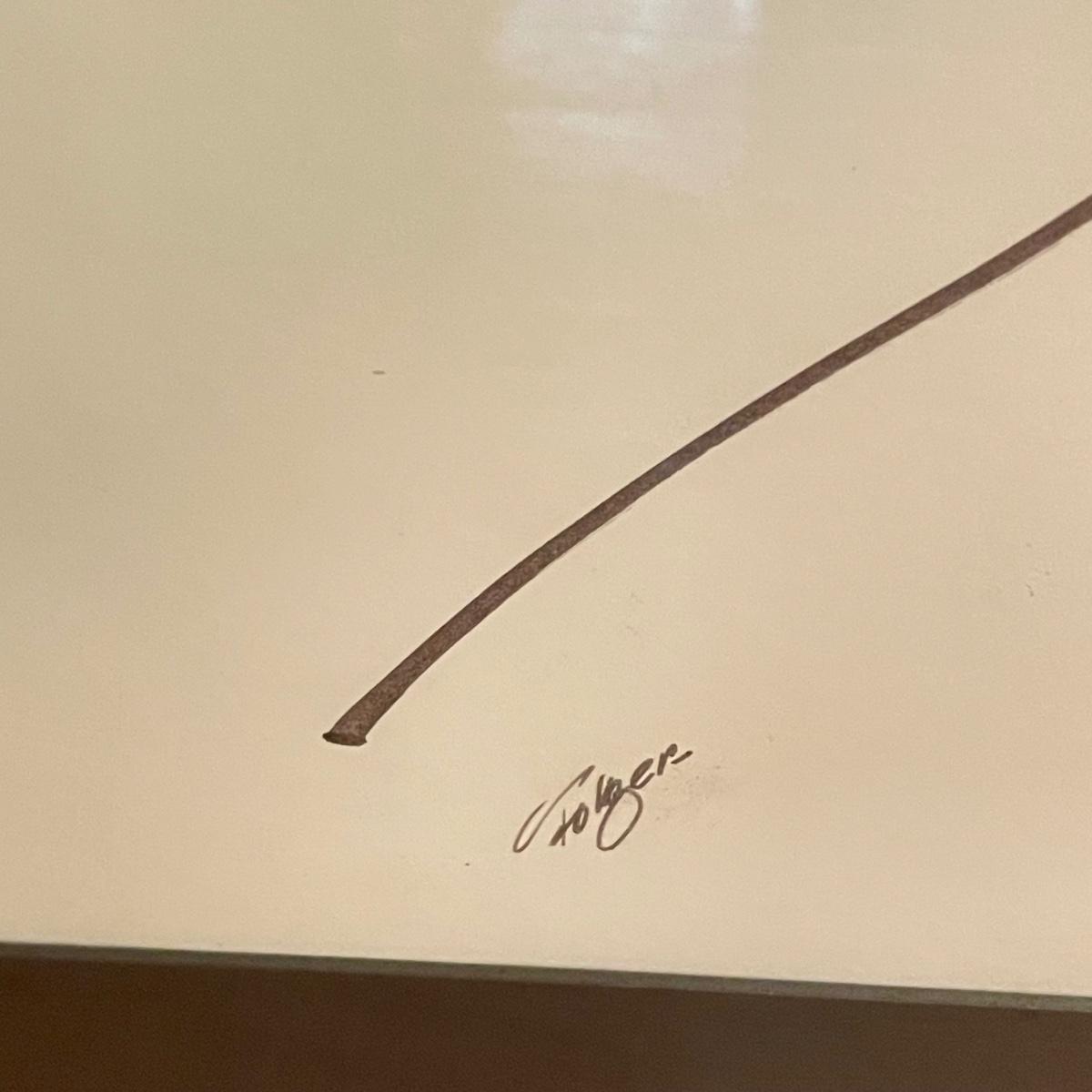 Three pieces of art likely by “Girls will be Girls” cartoonist Franklin Folger. The shiny magenta metal framed art is signed Folger, art sits on a black mat behind glass. Frame measures 18.5” x 22”H. Lot also features what appears to be two sepia colored pencil drawings. The larger art has pencil signed “A/D” or “A/P” along with a likely title of “Coquette” and “Folger”. The backside has a Franklin Folger stamp. The smaller art appears to be the same medium, this piece has no identifying markings. Both pencil art have indentations that appear to be akin to matting. The “Coquette” piece is 13.5” x 17”H, the smaller art is 9” x 17”H. Shipping available. Shipping can be costly. We suggest contacting our preferred local shipping provider, Postage Express, with dimensions and getting an estimate before bidding: (828) 255-9250 or email shipping@postageexpressnc.com