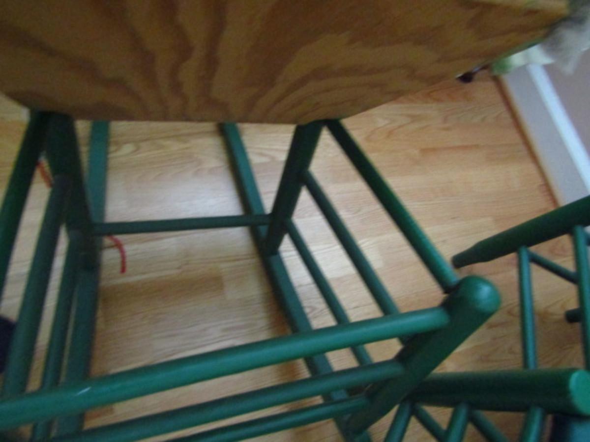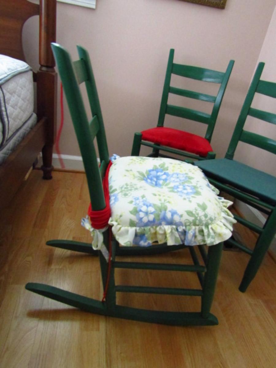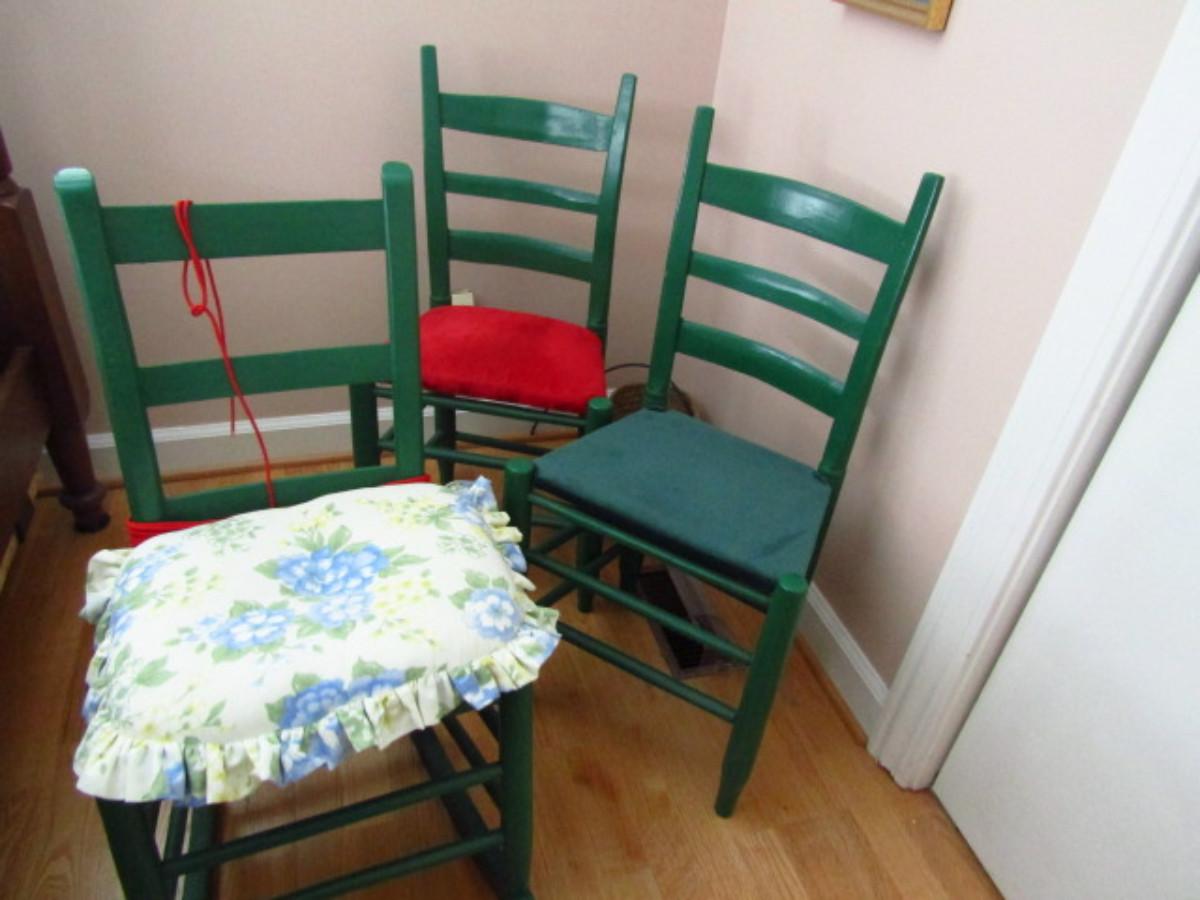 Three Assorted Painted Ladder Back Chairs. One is a rocking chair. Please see all pictures- the seats need some work.