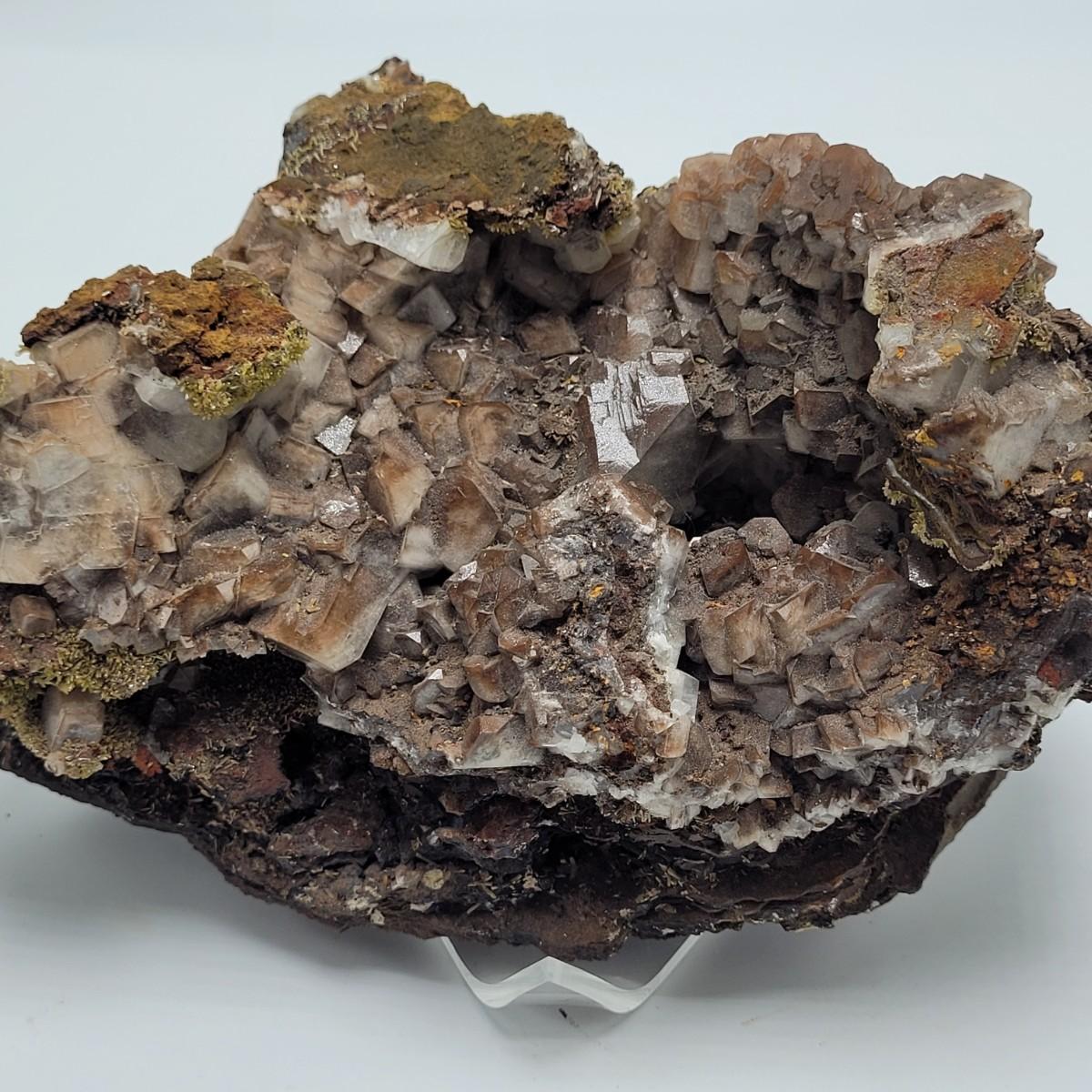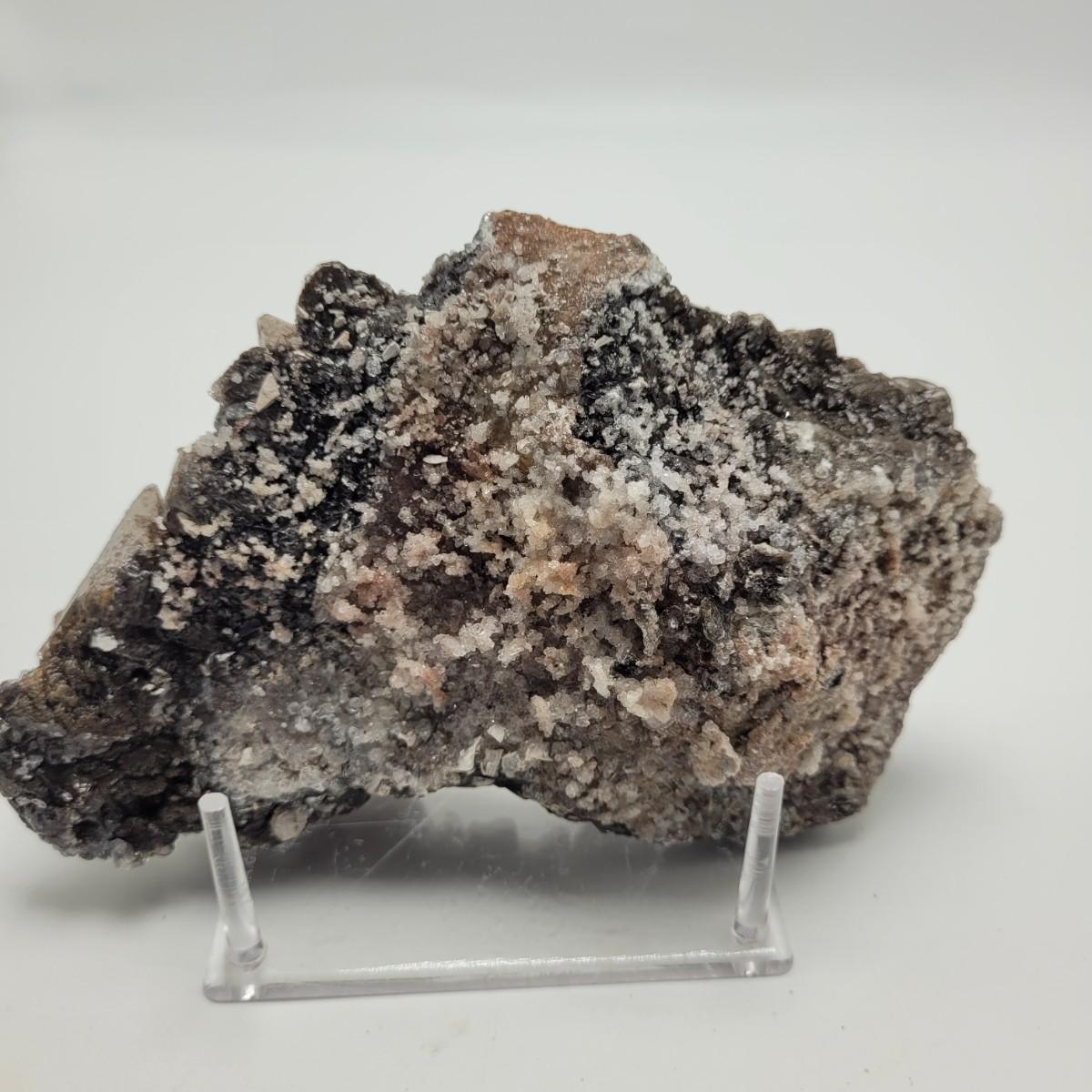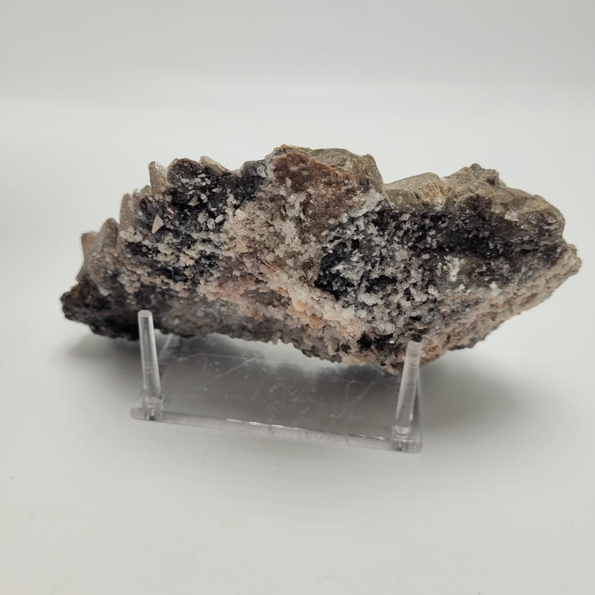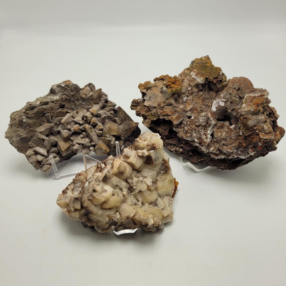 This lot includes what appears to be three unique pieces of calcite. The largest rock measures 7" x 4" x 4.5"H and has patches of green micro crystals. All three rocks appear to be a different variety of calcite, but likely contain other minerals such as tourmaline and mica. All rocks have a clear plastic display stand. See photos for more detail on individual items.