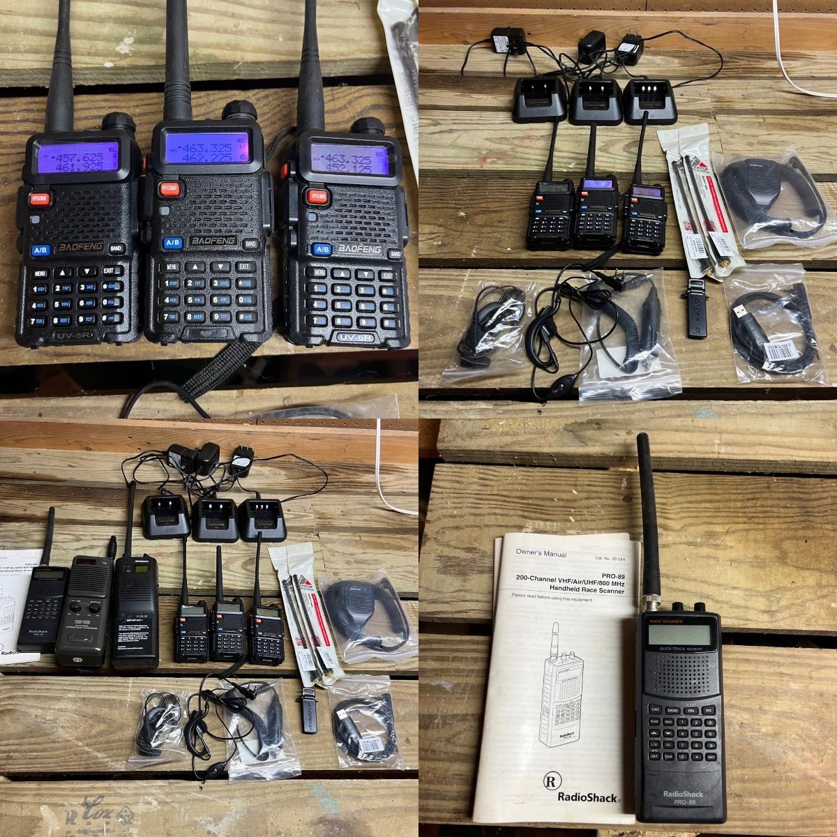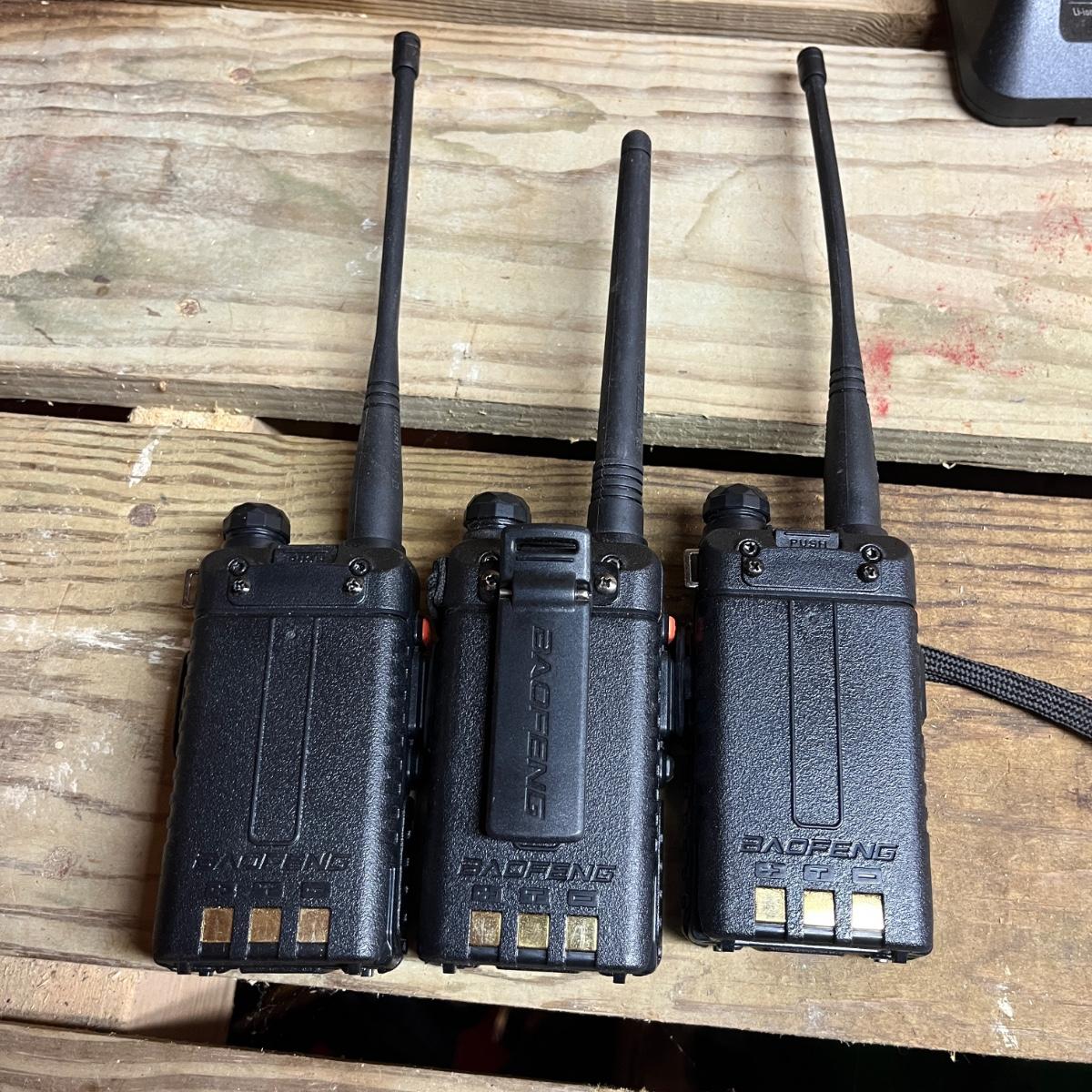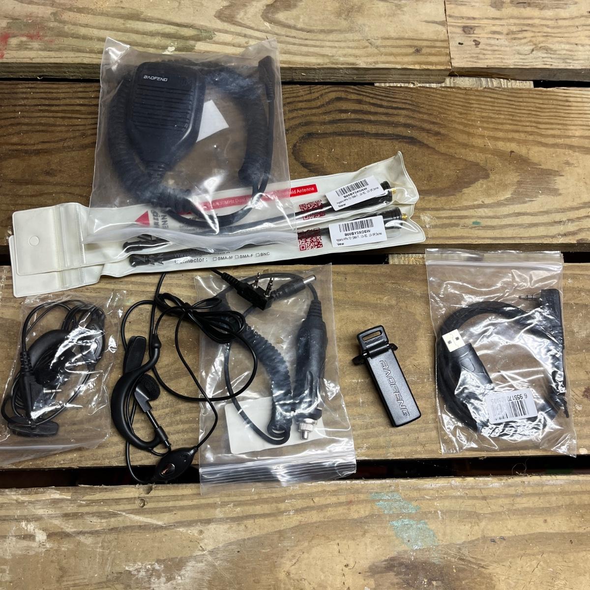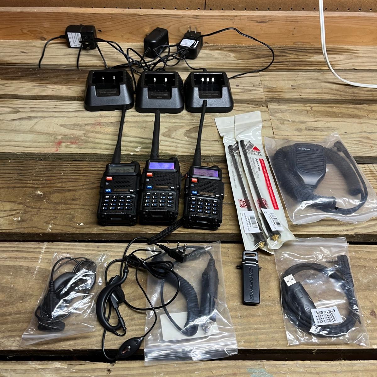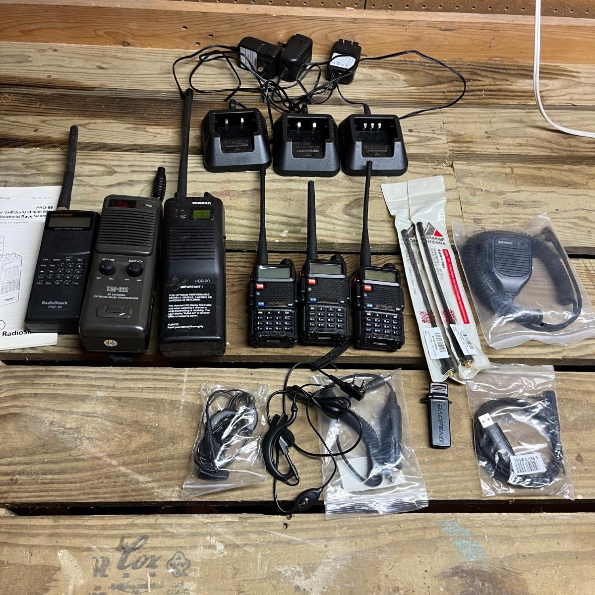 Lot includes three Baofeng portable radios with chargers and an assortment of extras. Also includes a Macon and Realistic handheld CB radios and a Radio Shack handheld scanner. All three Baofeng radios powered on when switched on, the other three radios do not have batteries so were not tested.