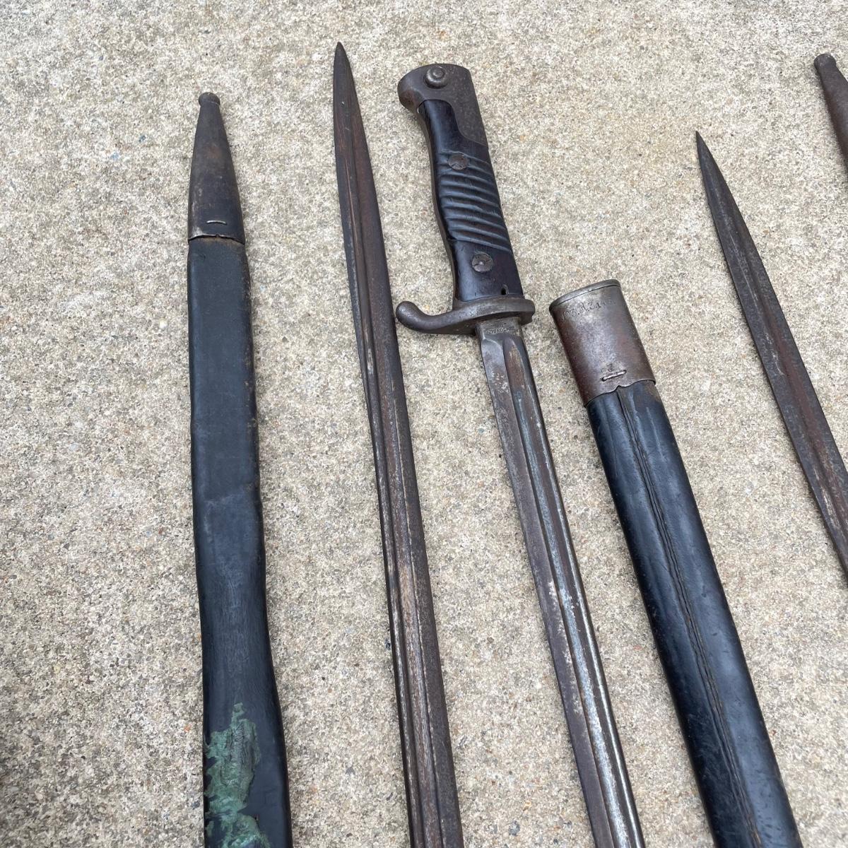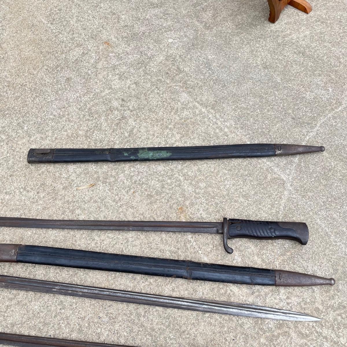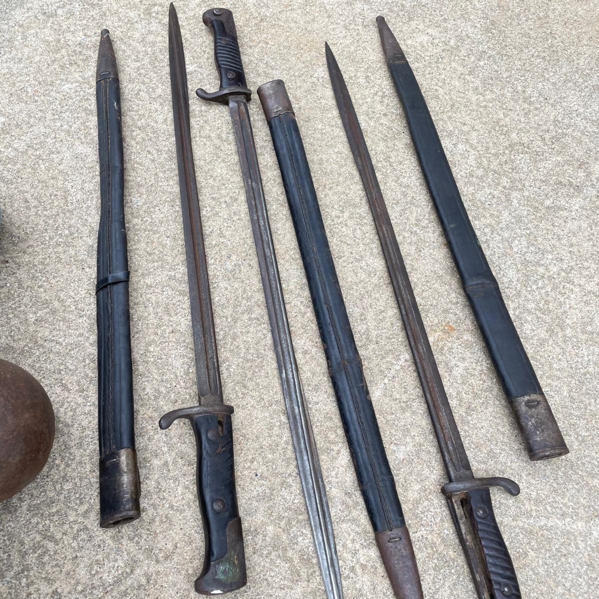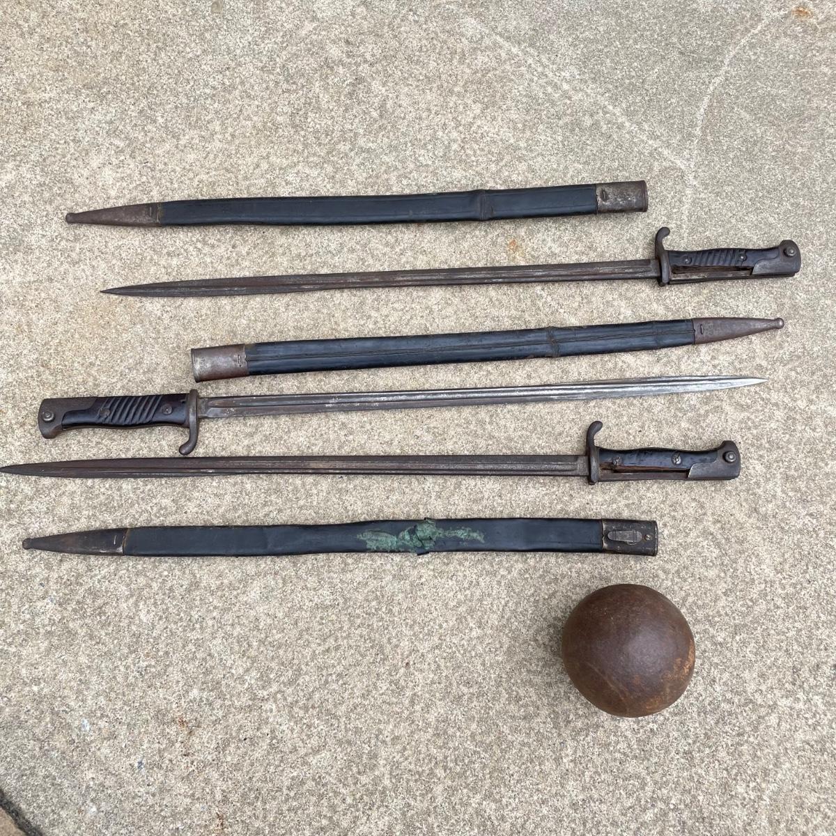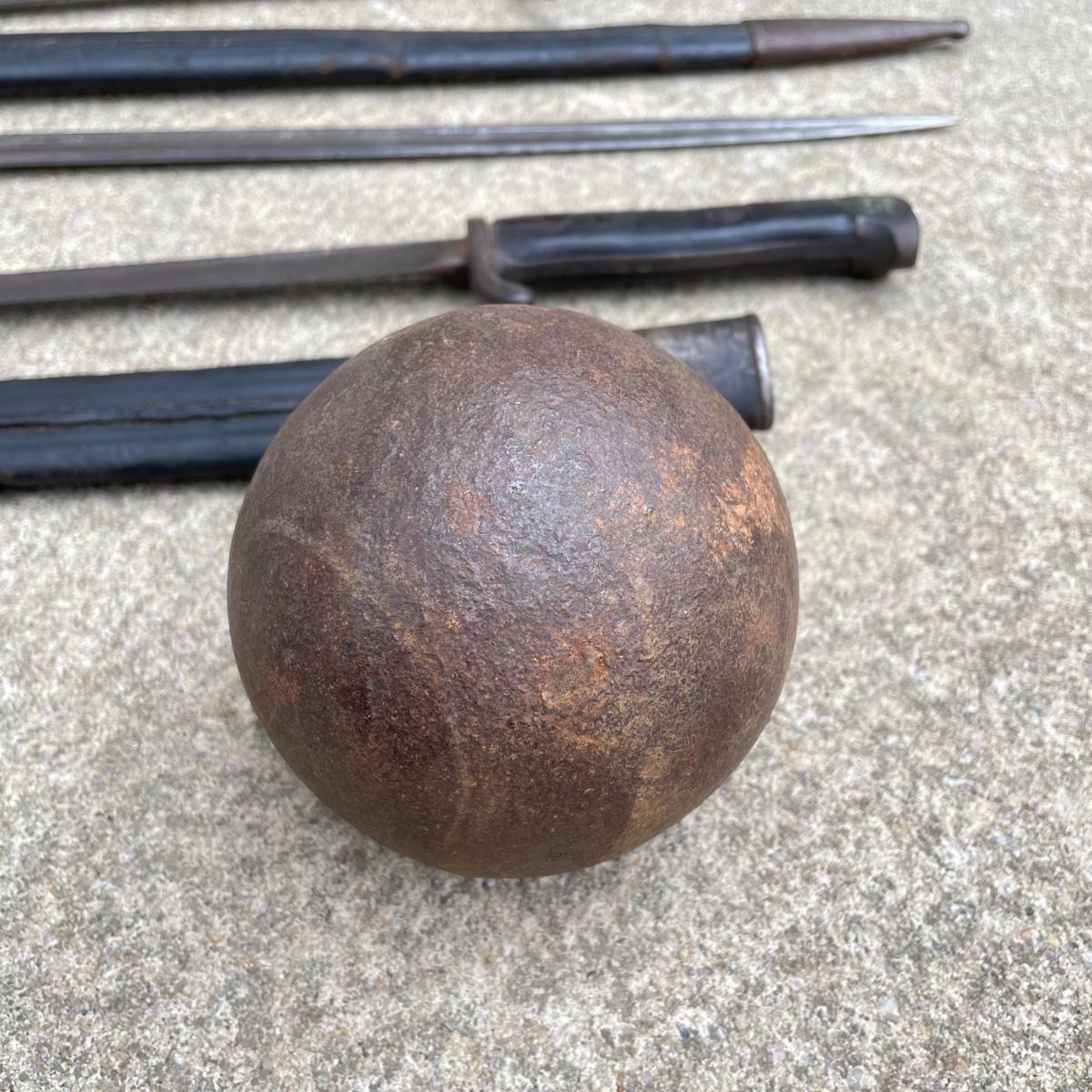 Antique Cannonball measuring 4”d with three bayonets and leather scabbards. Two bayonets are Simpson & Co SUHL and the bayonet pictures at the top of the images is marked WK & C. These appear to be WW I era. See images. Bayonets each have roughly 20” blade and 4”-5” grips. Shipping available.