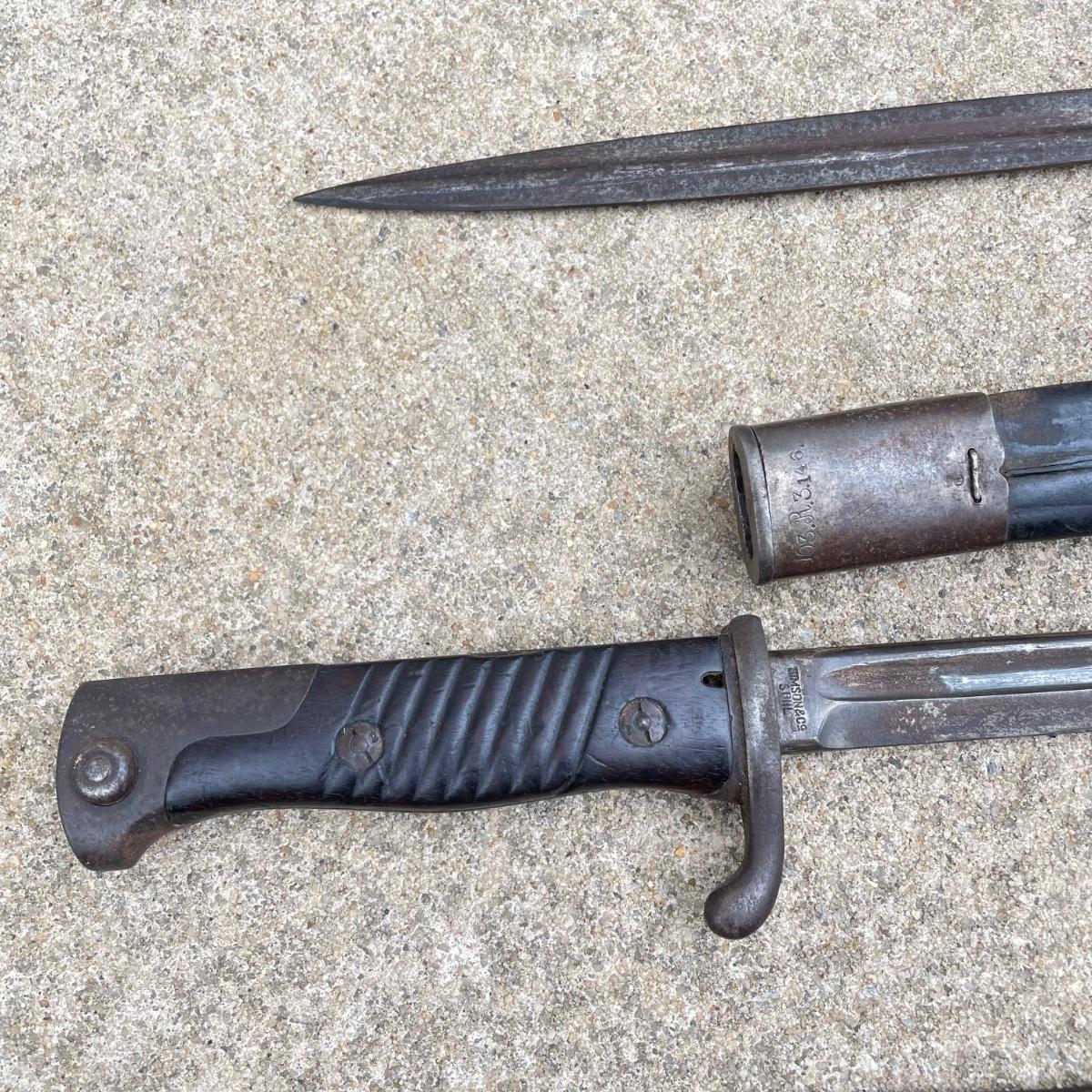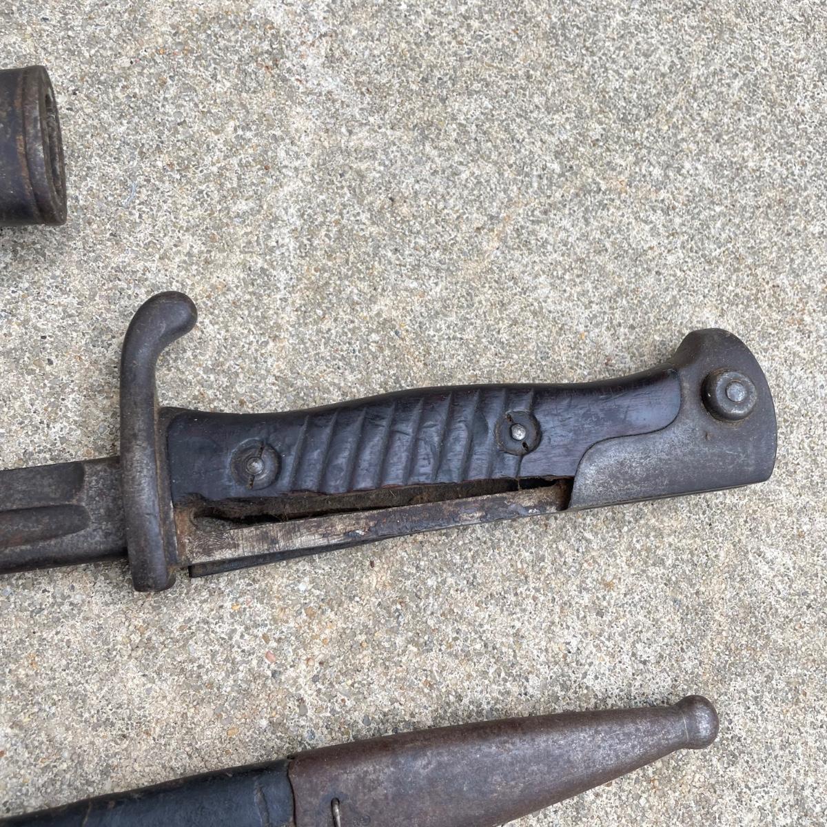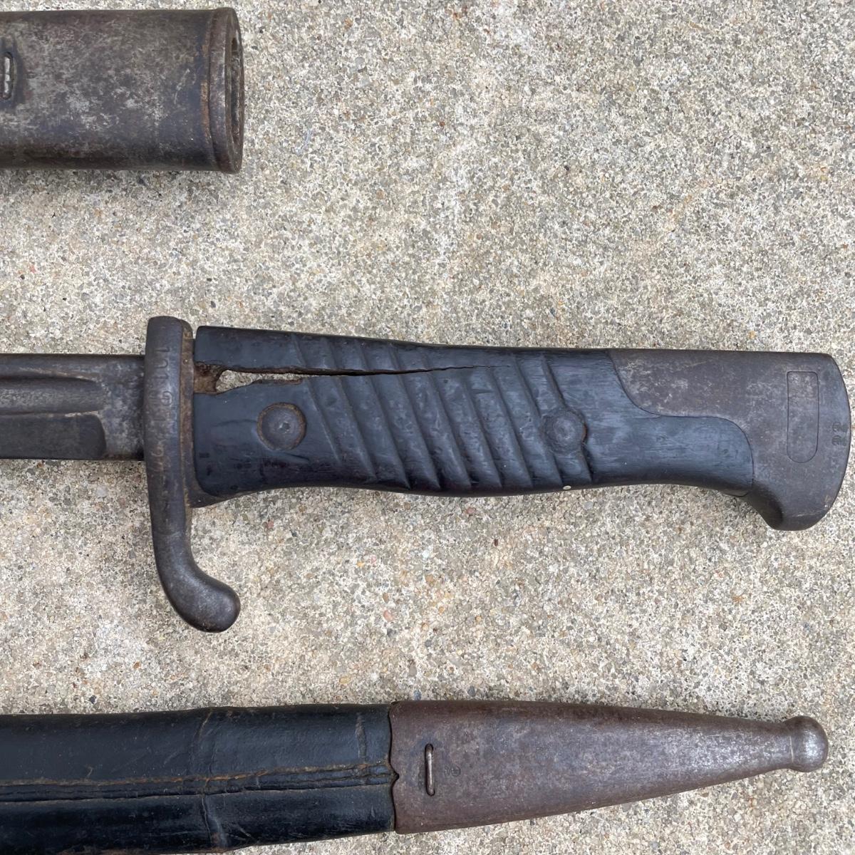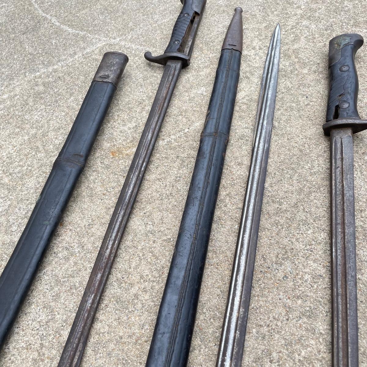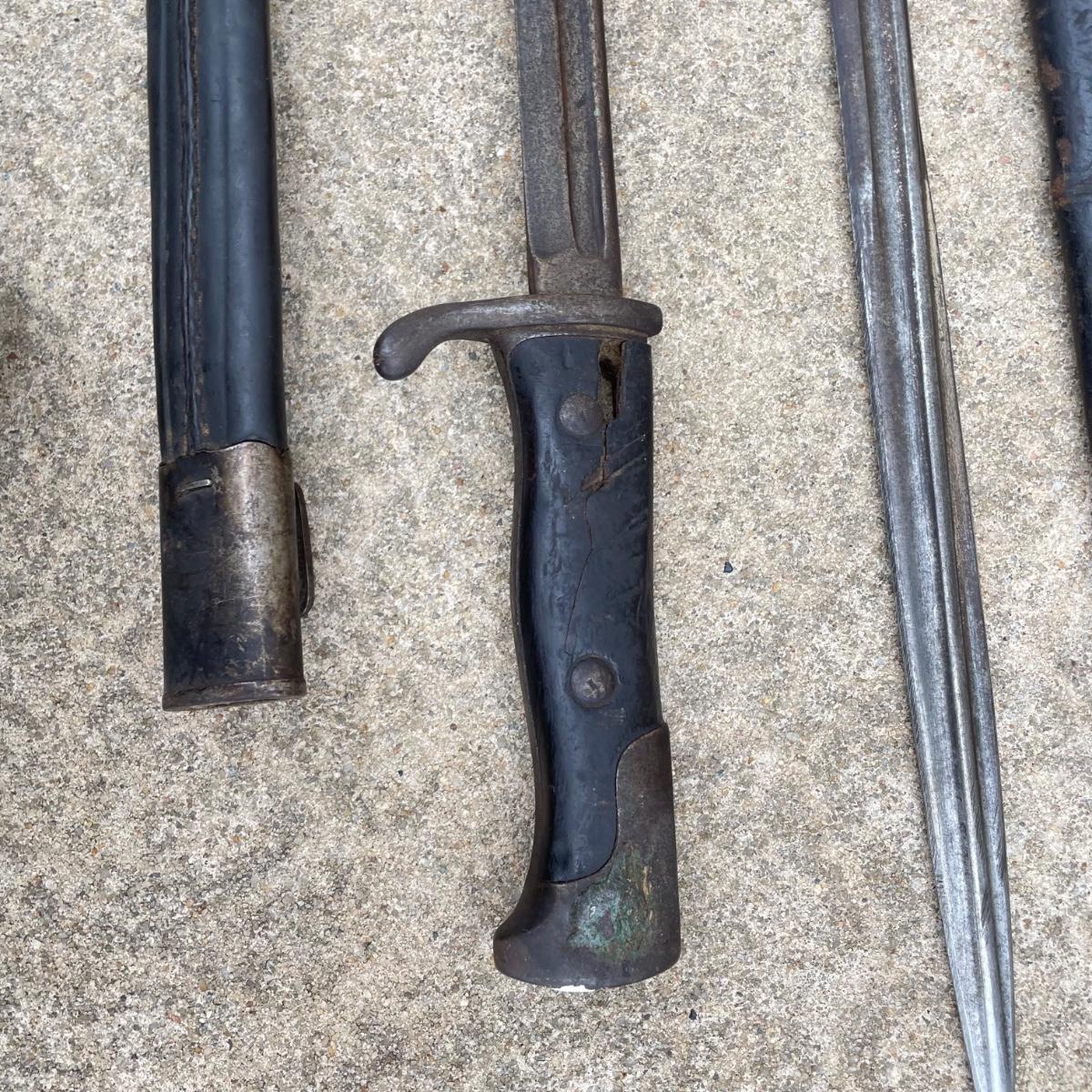 Antique Cannonball measuring 4”d with three bayonets and leather scabbards. Two bayonets are Simpson & Co SUHL and the bayonet pictures at the top of the images is marked WK & C. These appear to be WW I era. See images. Bayonets each have roughly 20” blade and 4”-5” grips. Shipping available.