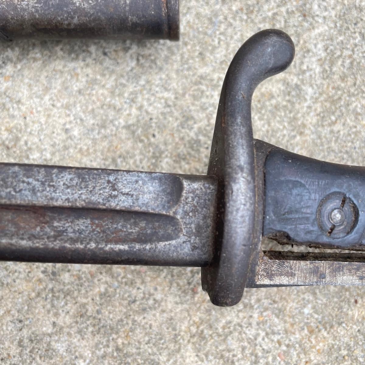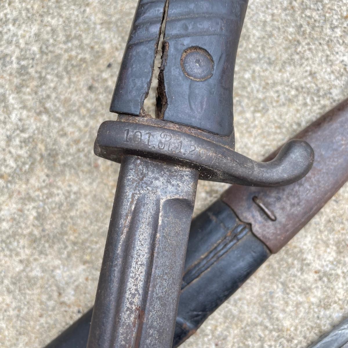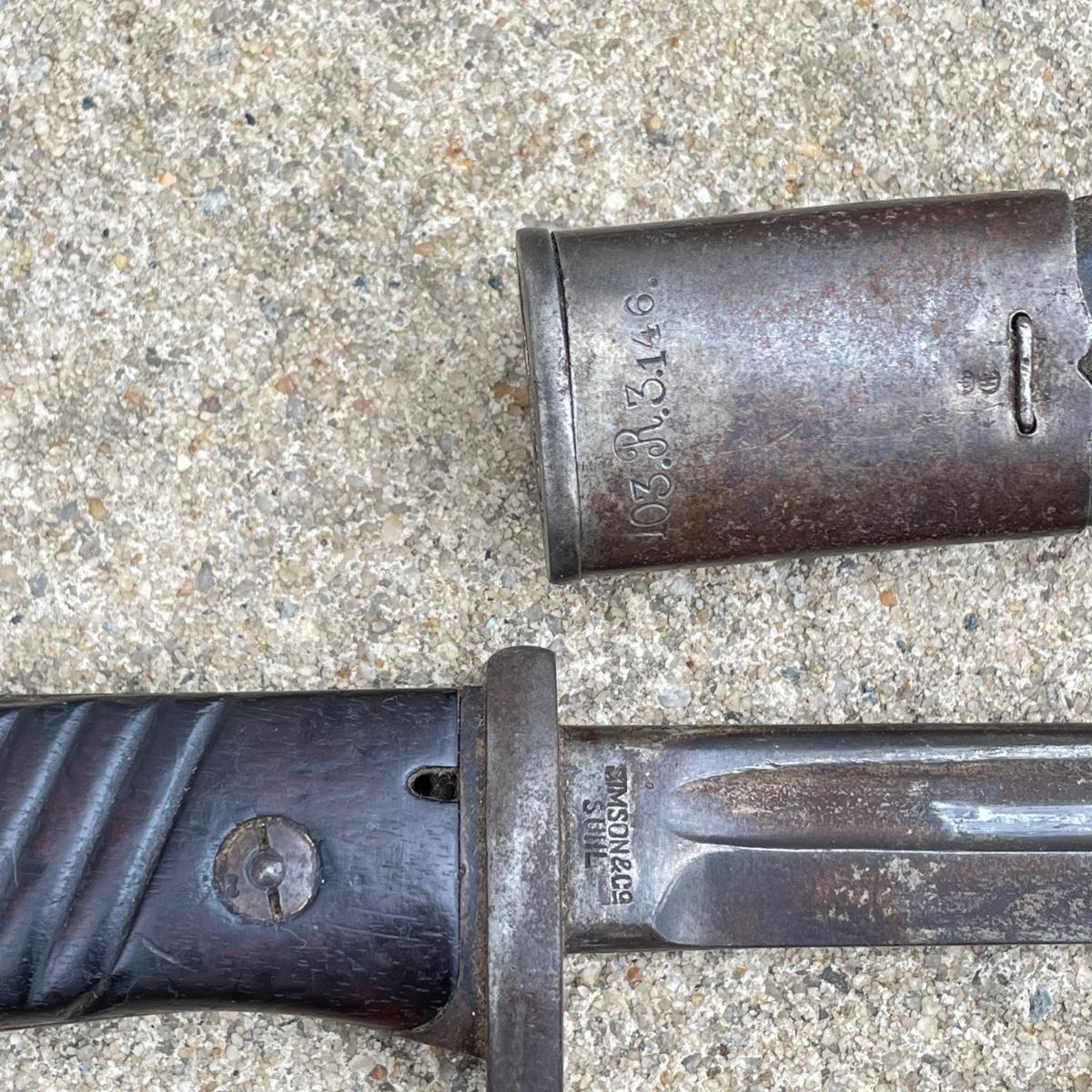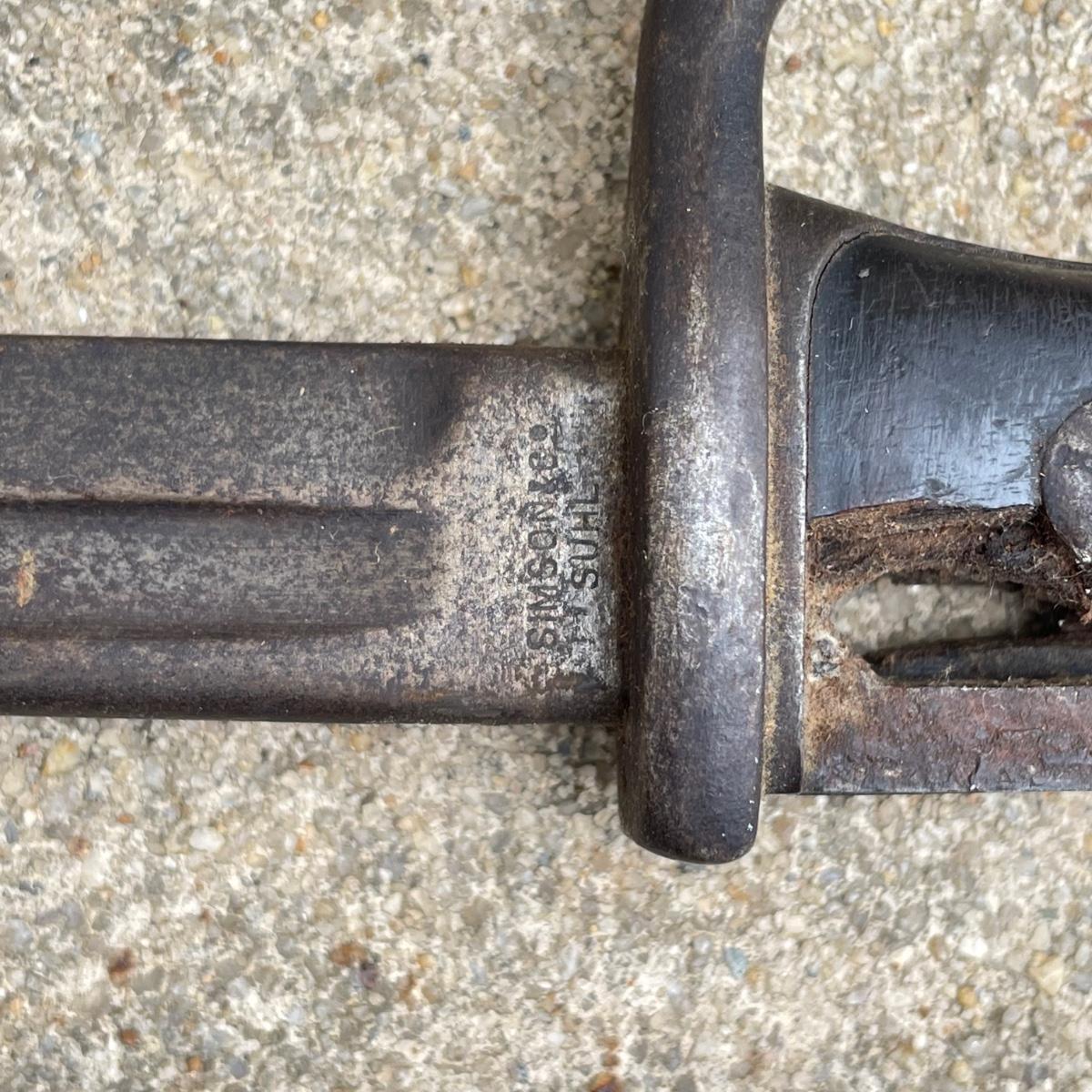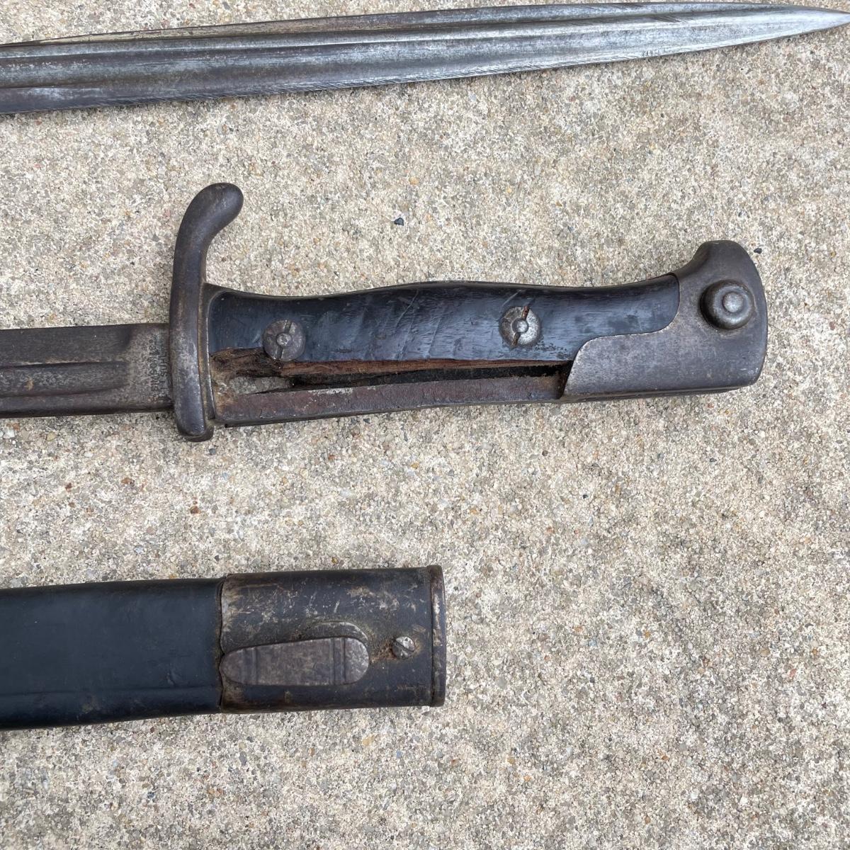 Antique Cannonball measuring 4”d with three bayonets and leather scabbards. Two bayonets are Simpson & Co SUHL and the bayonet pictures at the top of the images is marked WK & C. These appear to be WW I era. See images. Bayonets each have roughly 20” blade and 4”-5” grips. Shipping available.