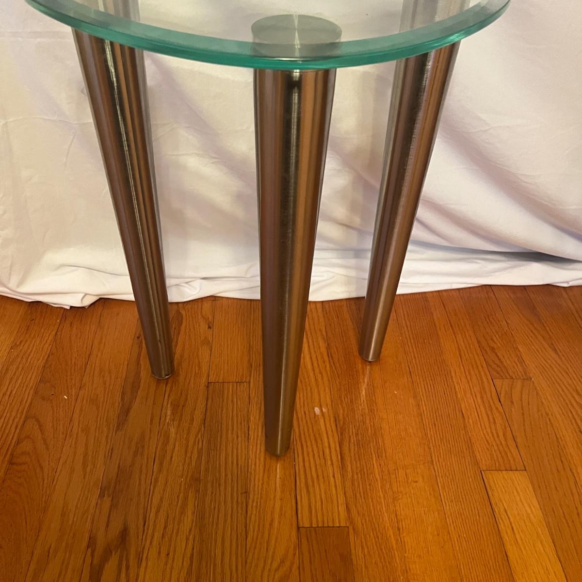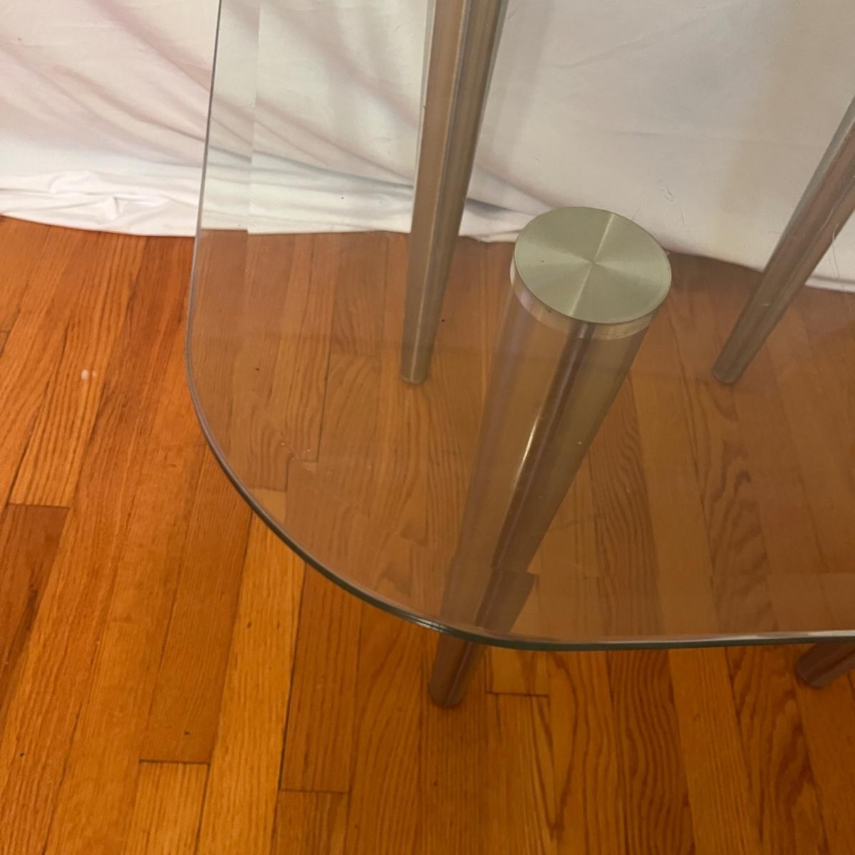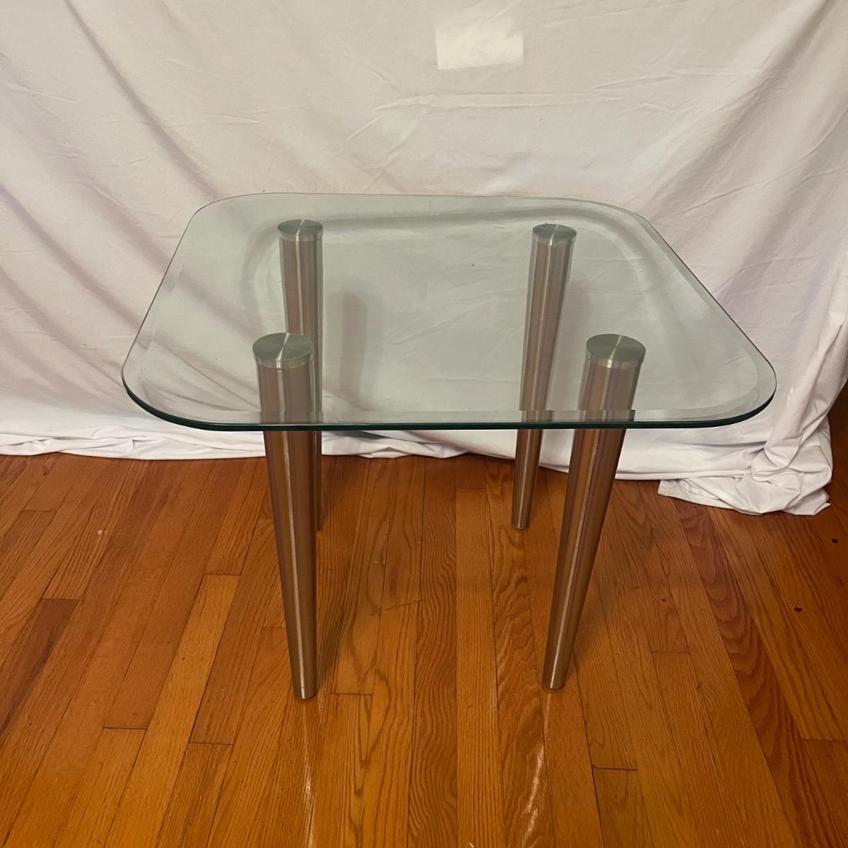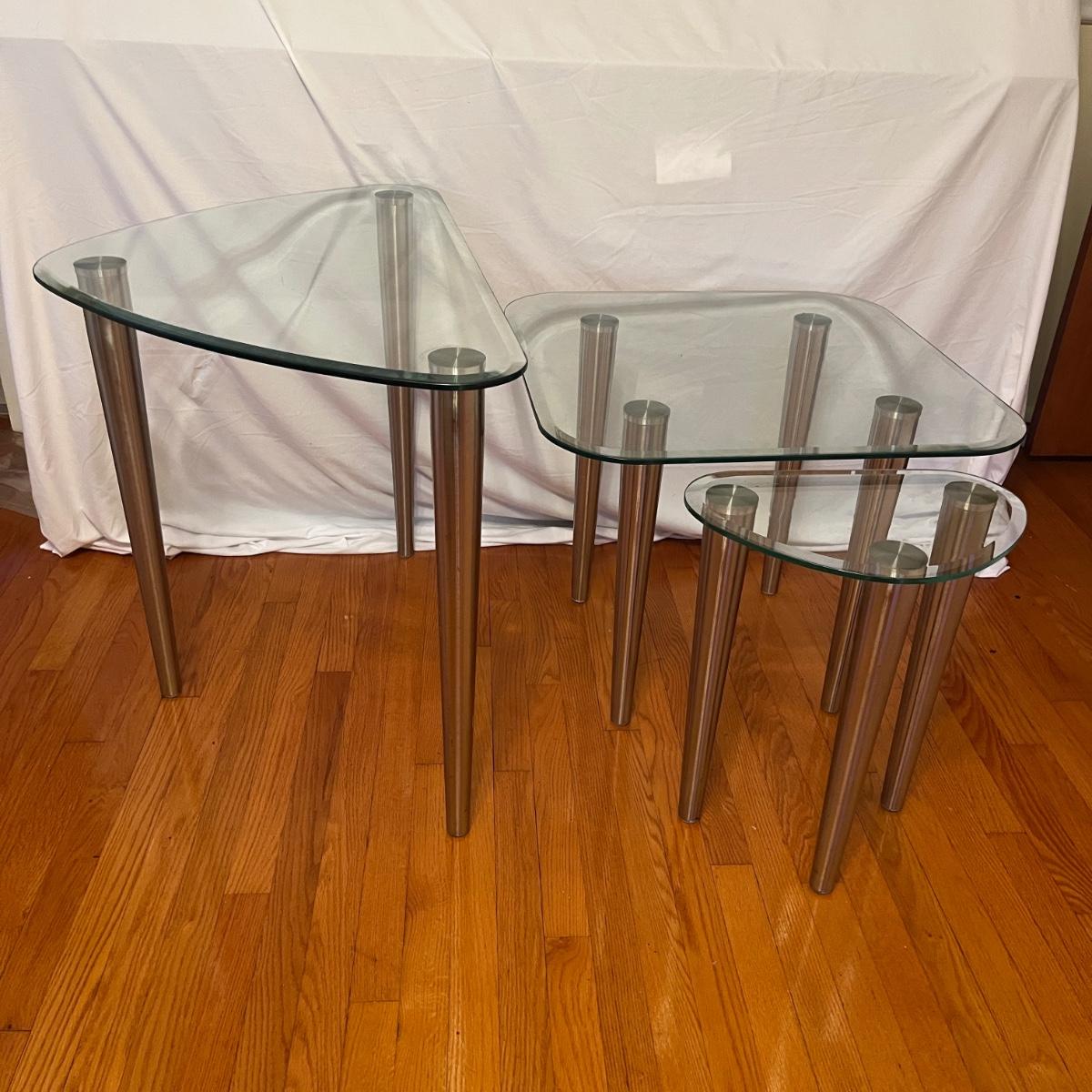 Lot includes three glass top tables with beveled edges and stainless steel legs. All glass is marked tempered. Largest table measures 35” x 22” x 27”H.