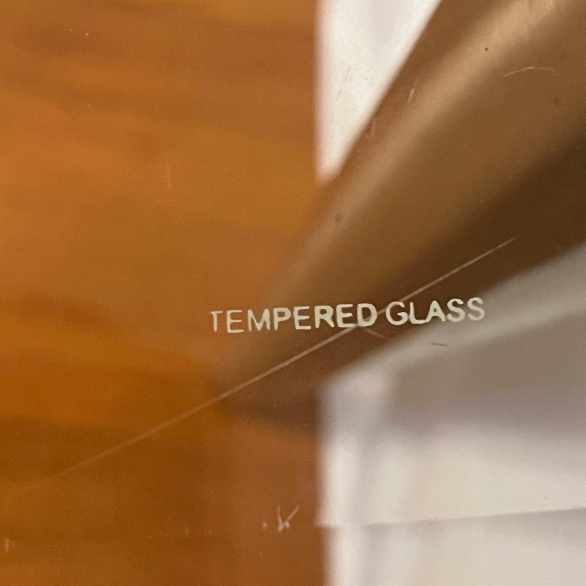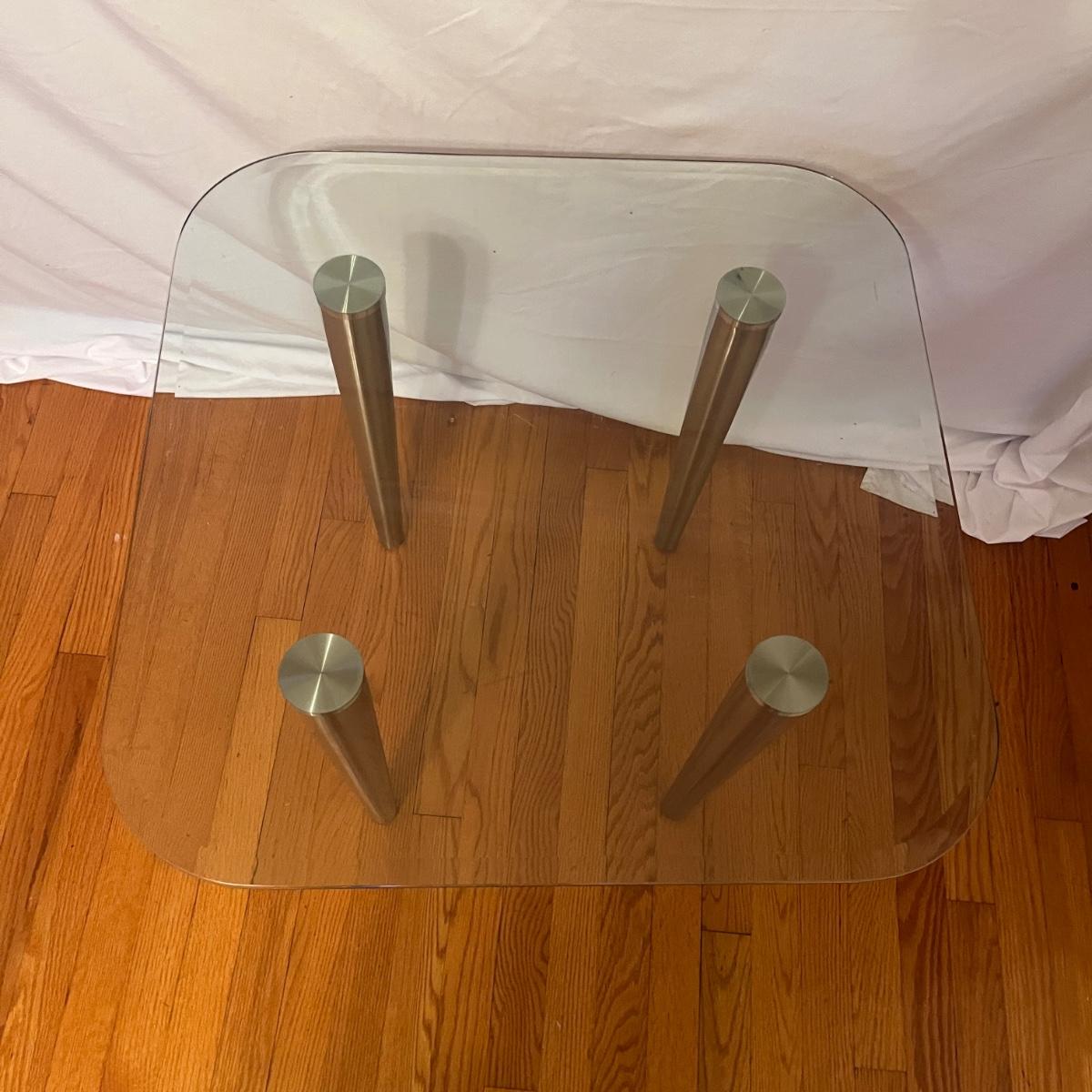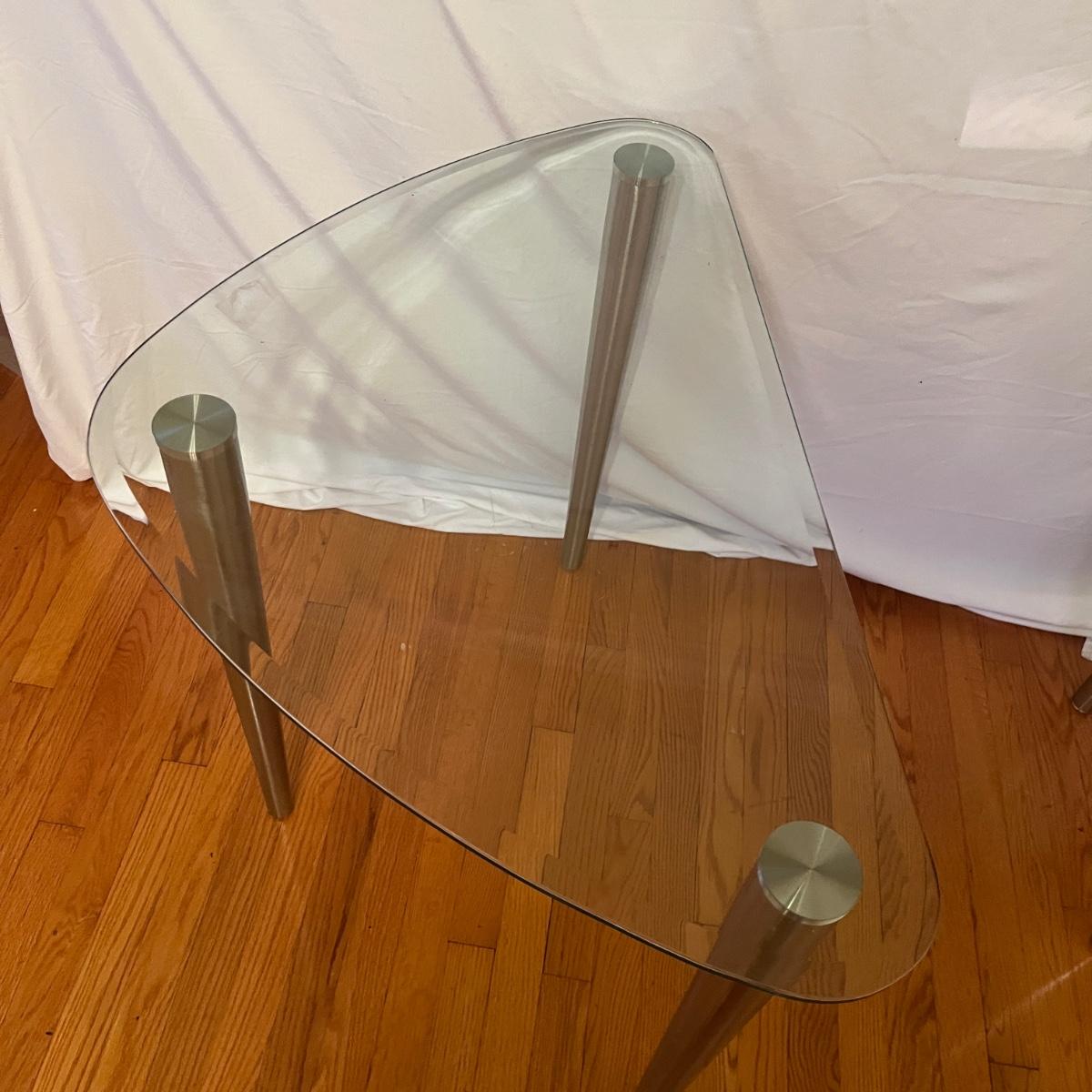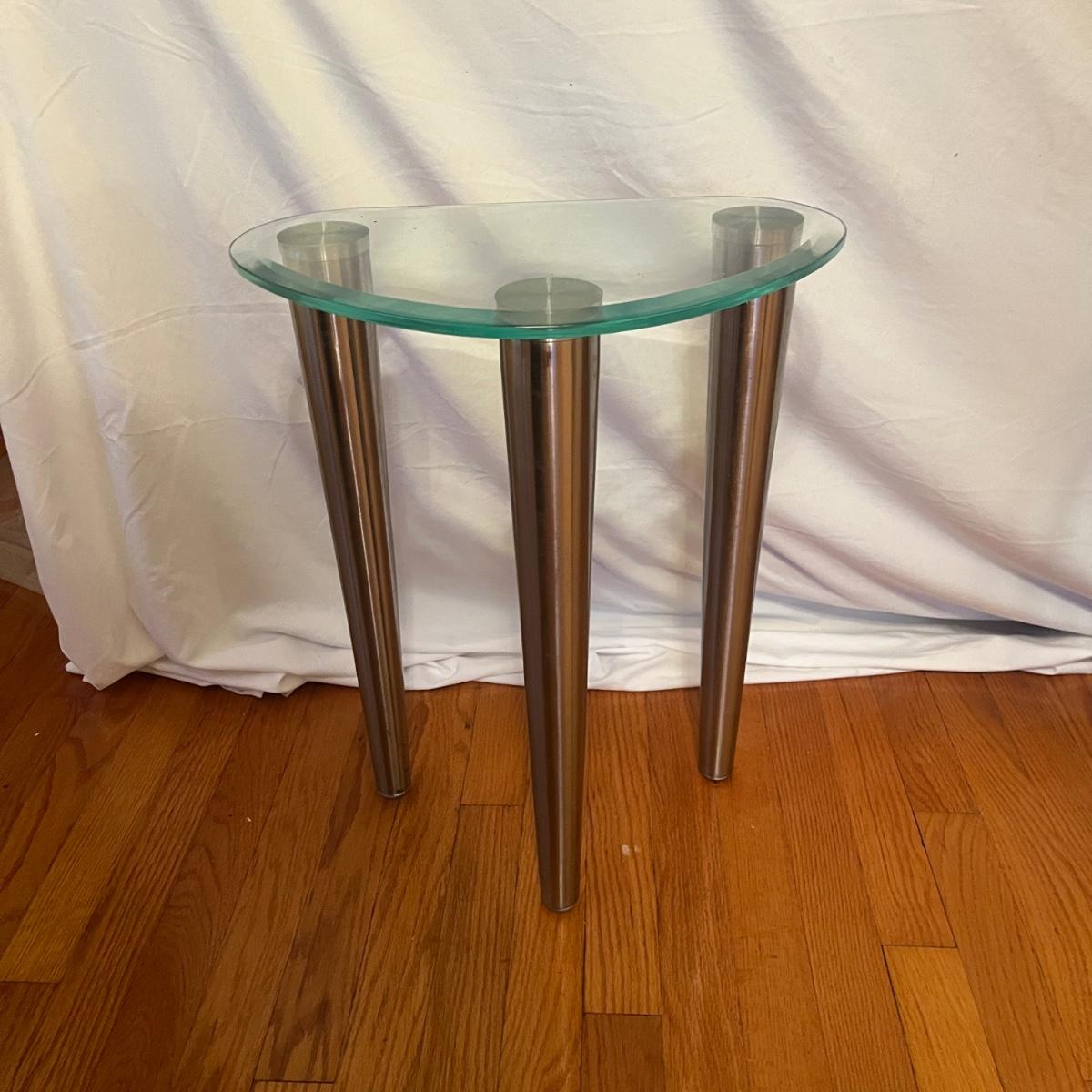 Lot includes three glass top tables with beveled edges and stainless steel legs. All glass is marked tempered. Largest table measures 35” x 22” x 27”H.