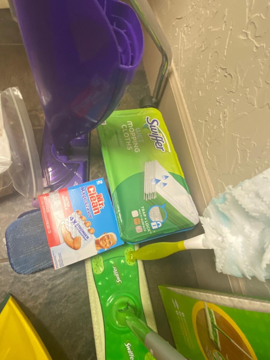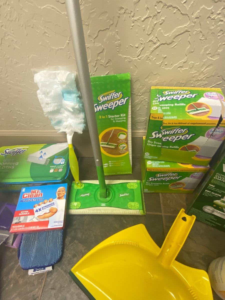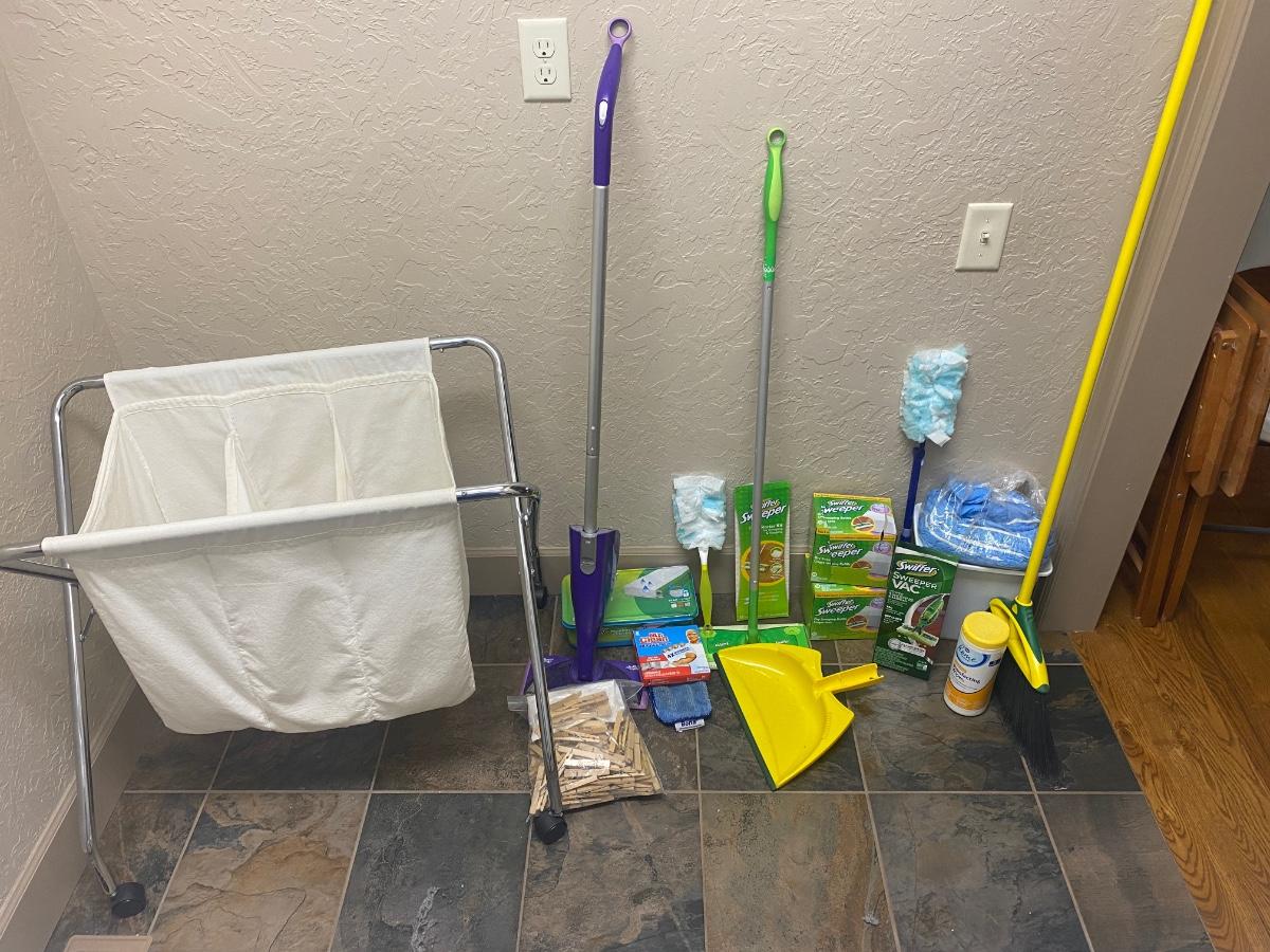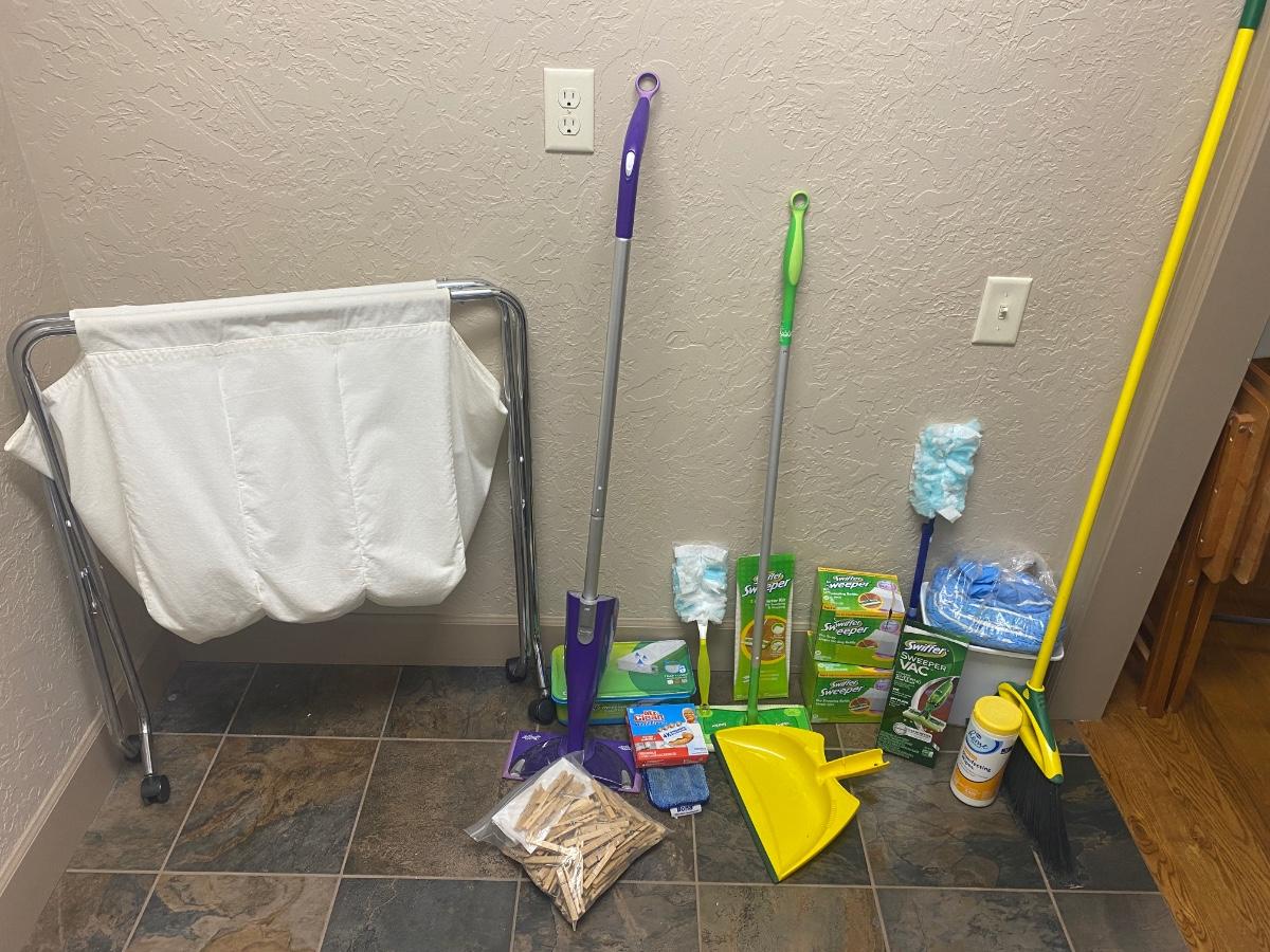 THREE BIN LAUNDRY HAMPER ON WHEELS ALL THE SWIFFERS YOU COULD NEED AND MORE