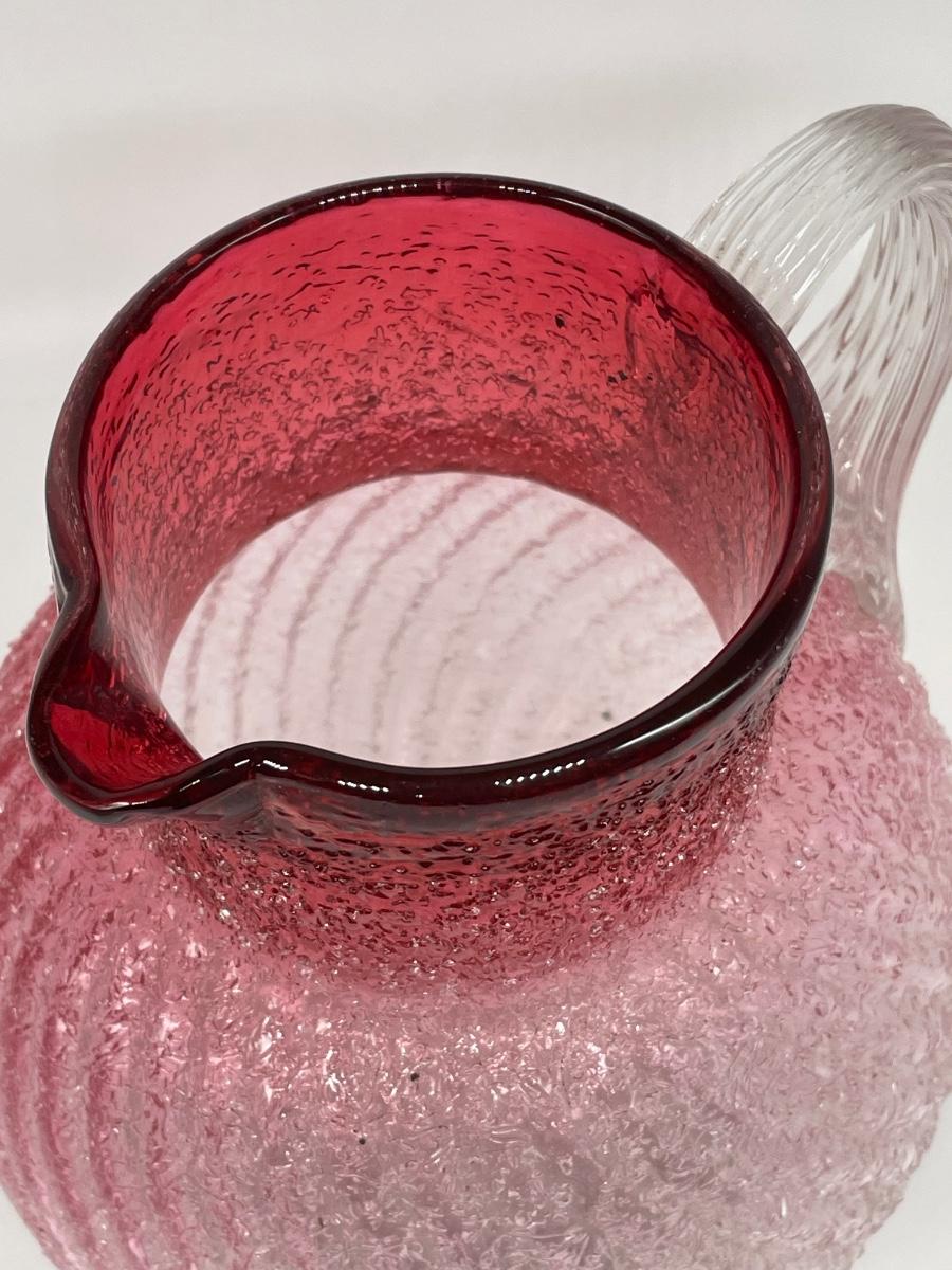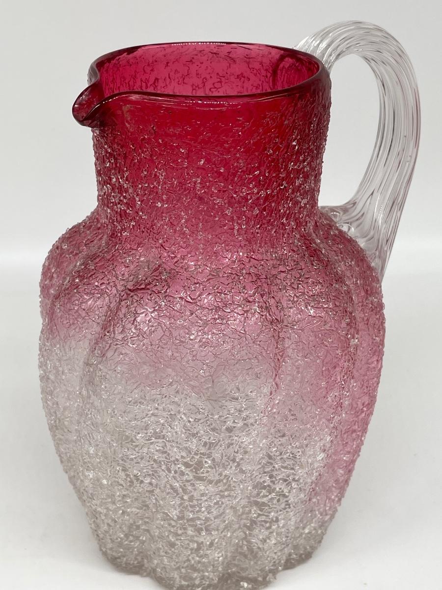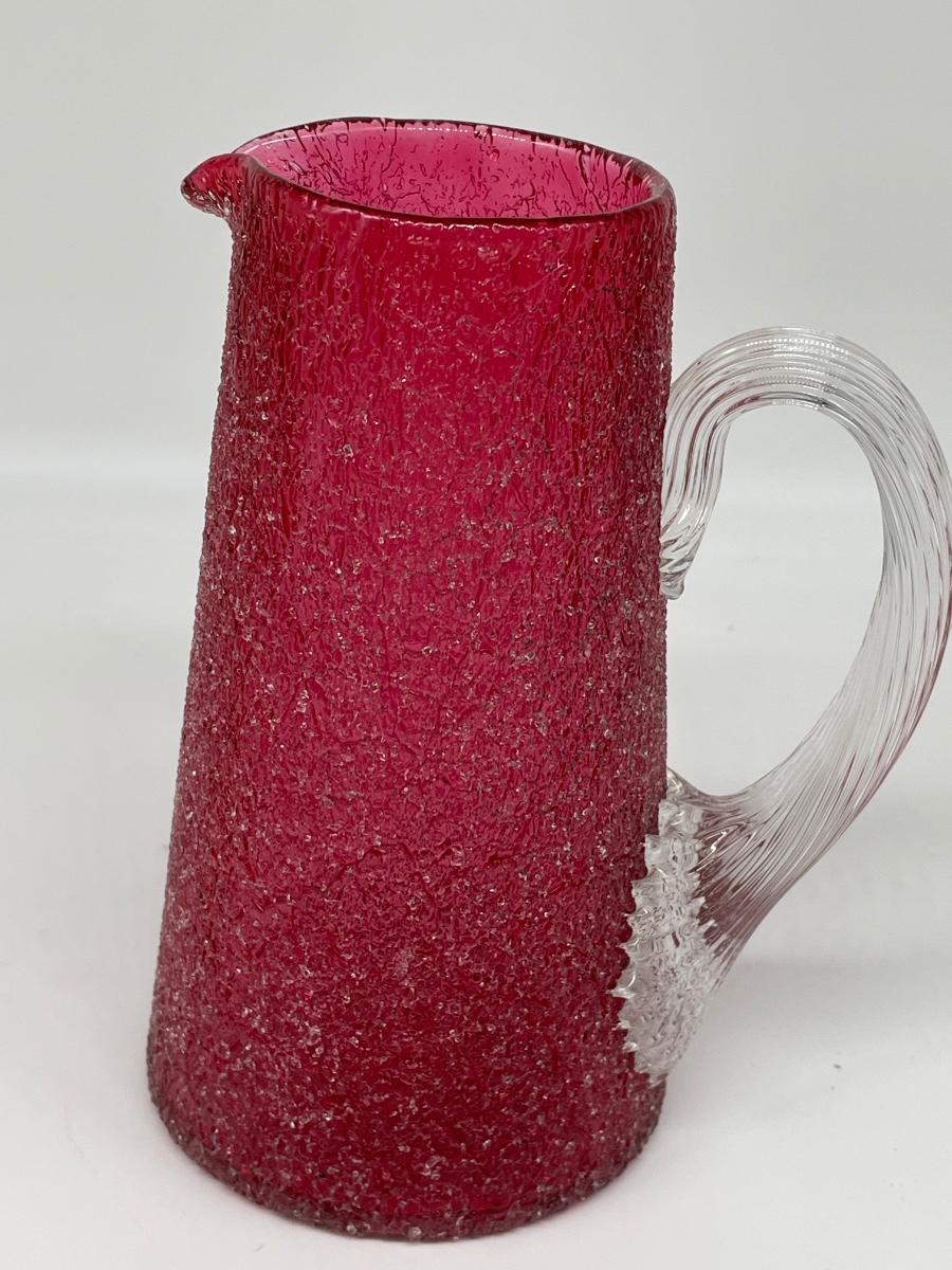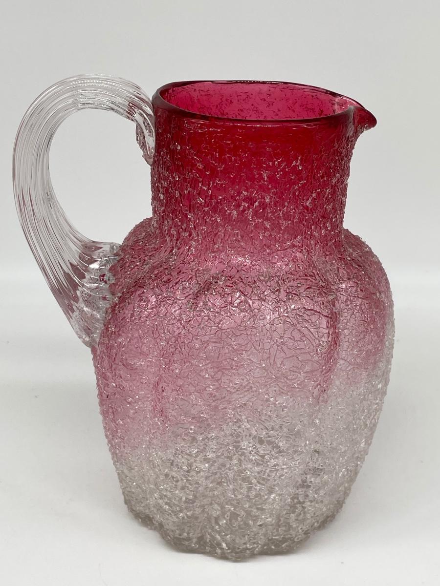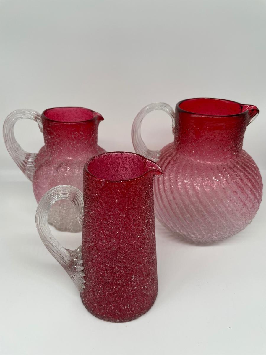 Three Bohemian cranberry crackle glass with clear handle pitchers (8", 7.5" & 6.75" tall)