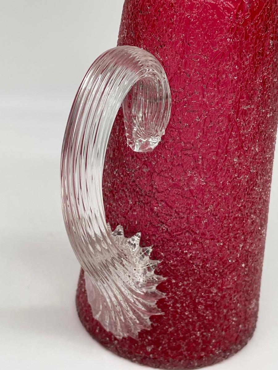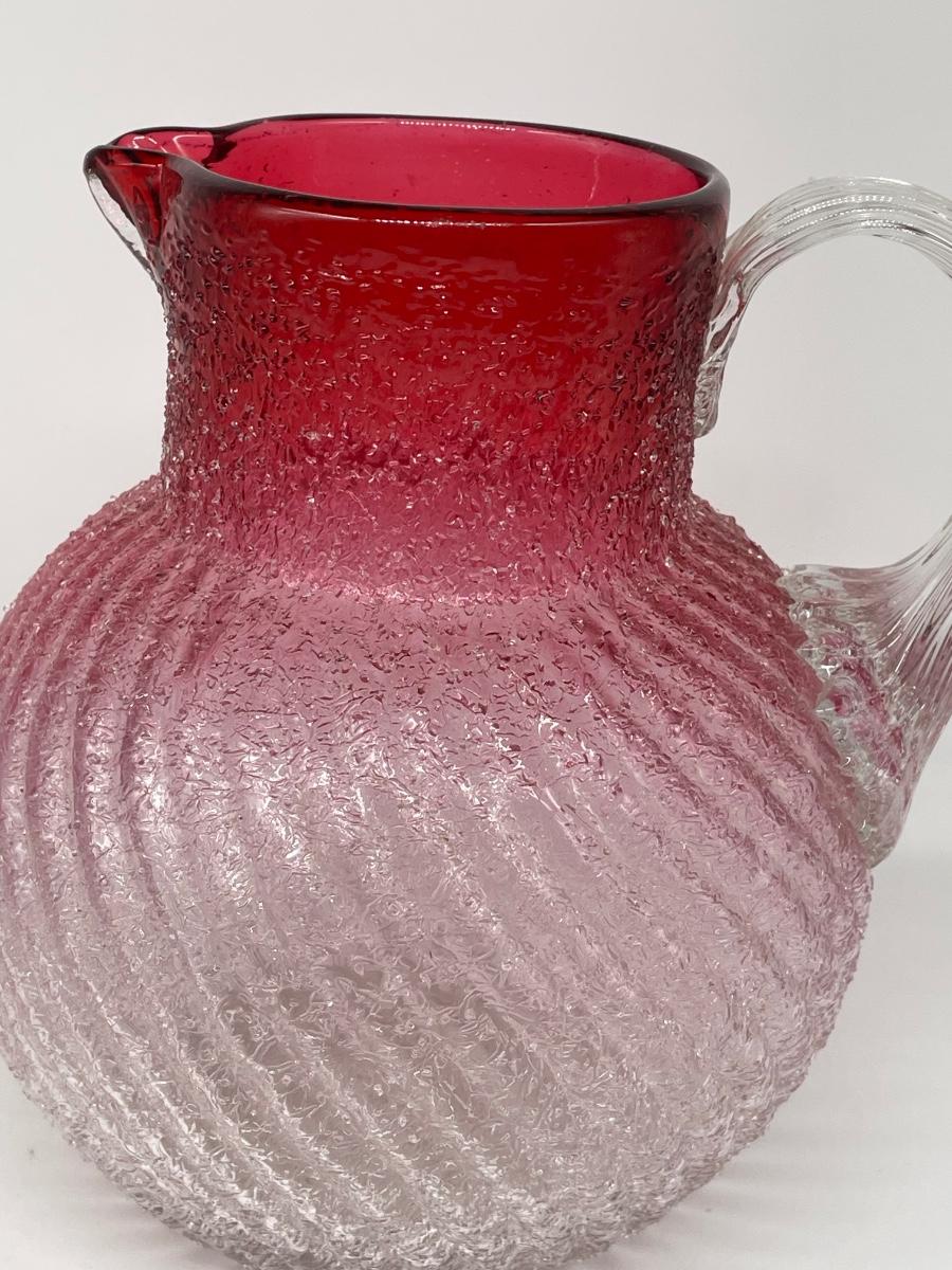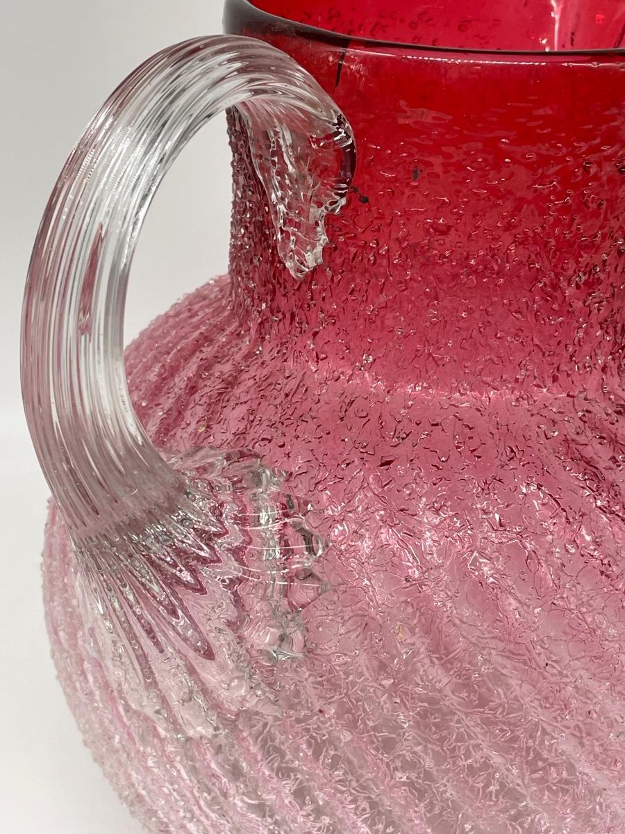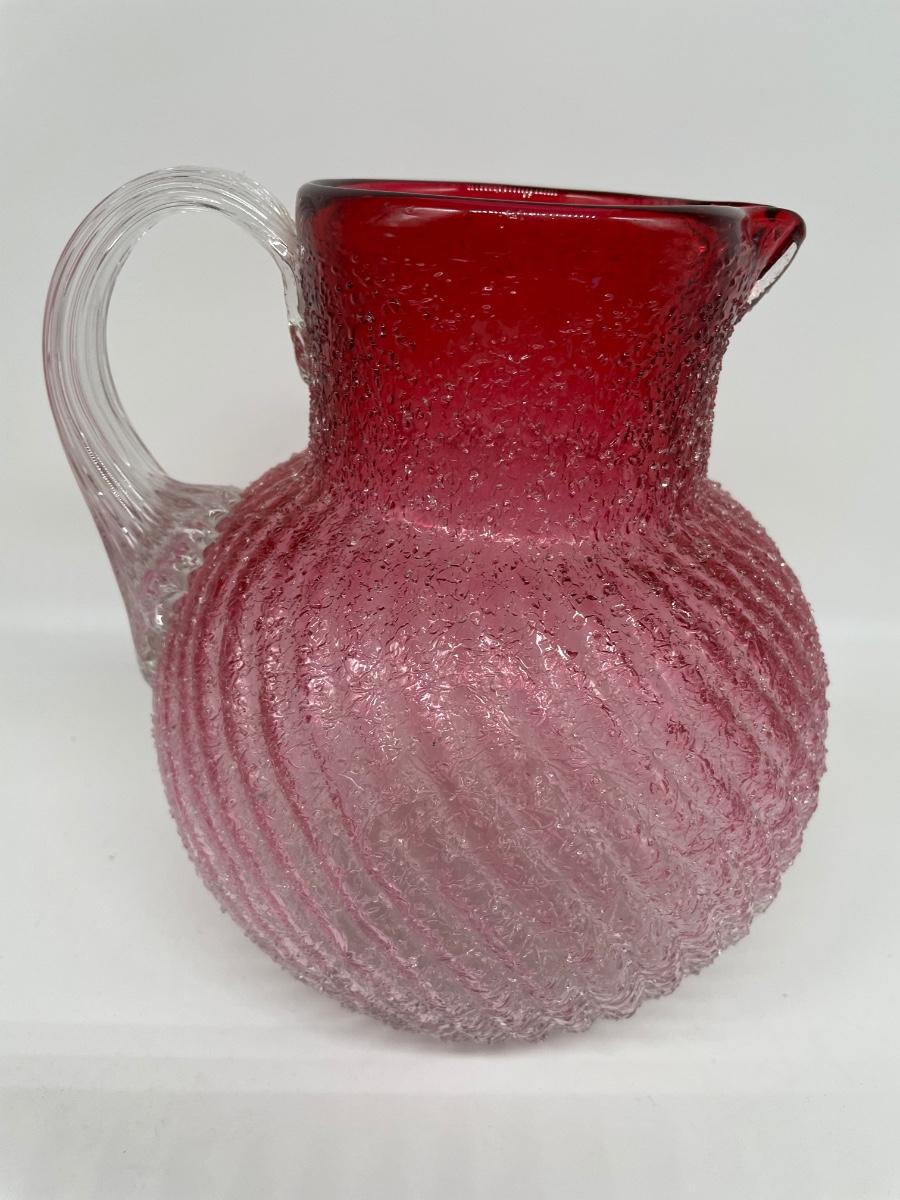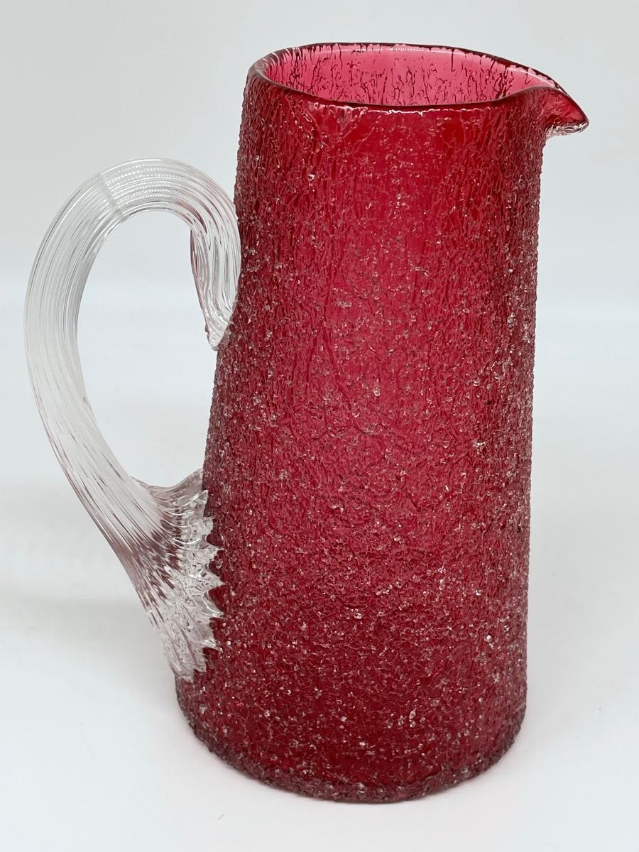 Three Bohemian cranberry crackle glass with clear handle pitchers (8", 7.5" & 6.75" tall)