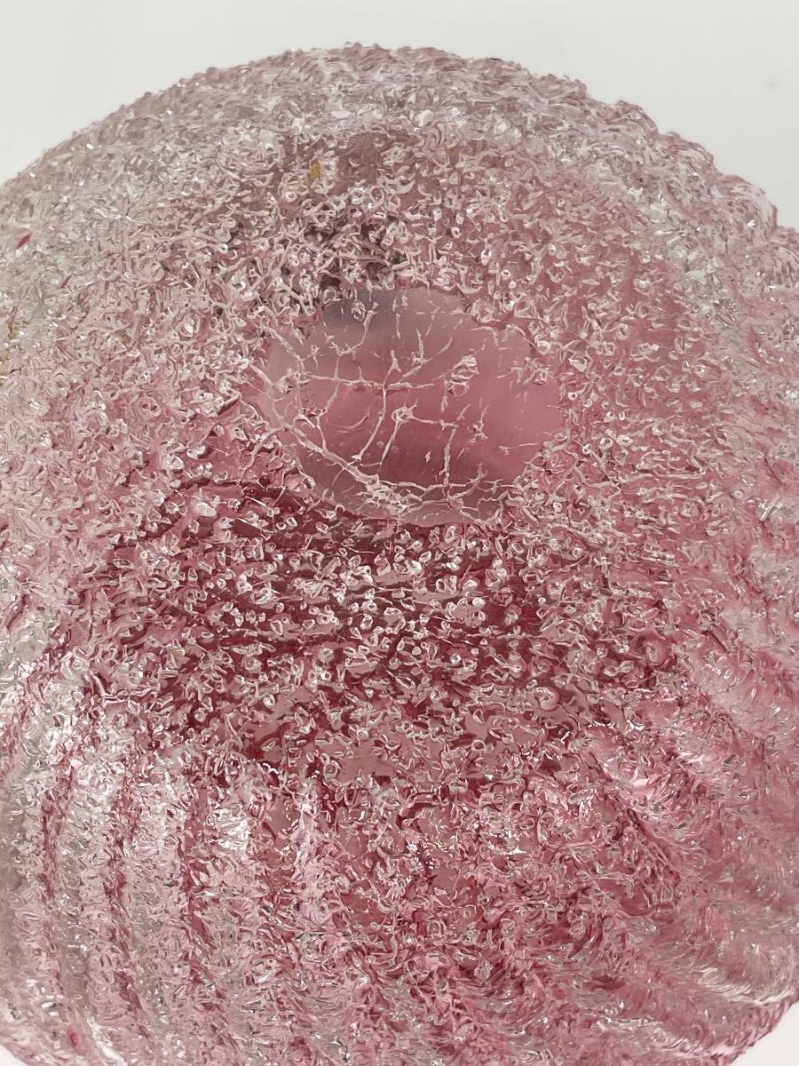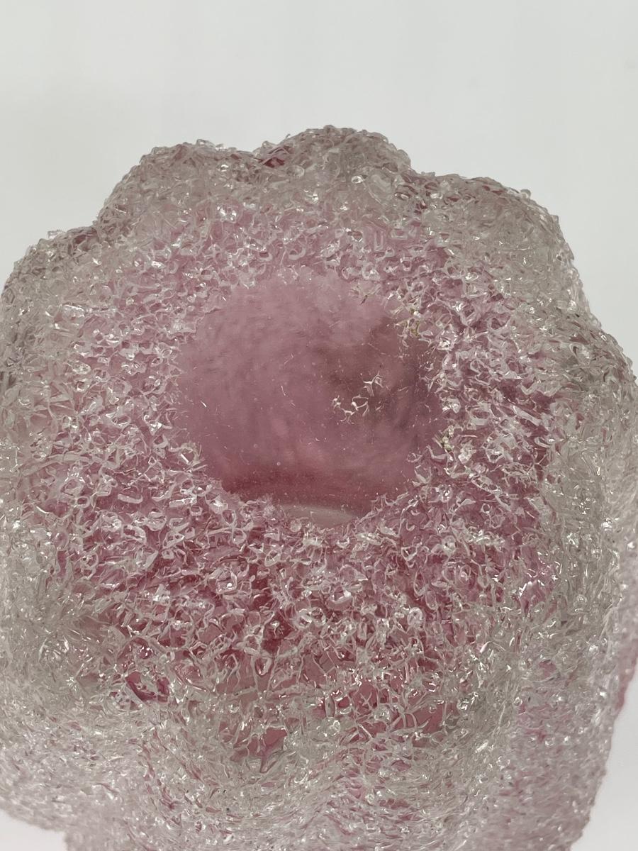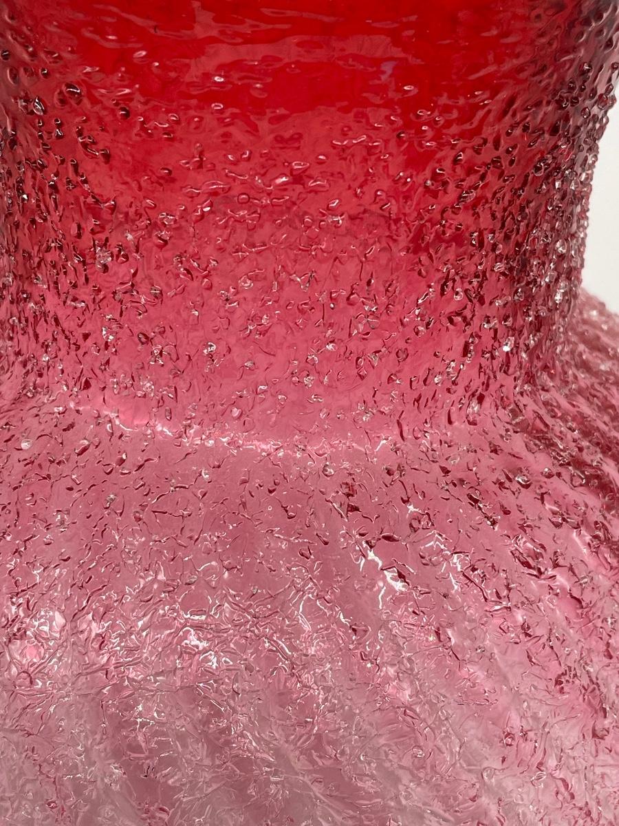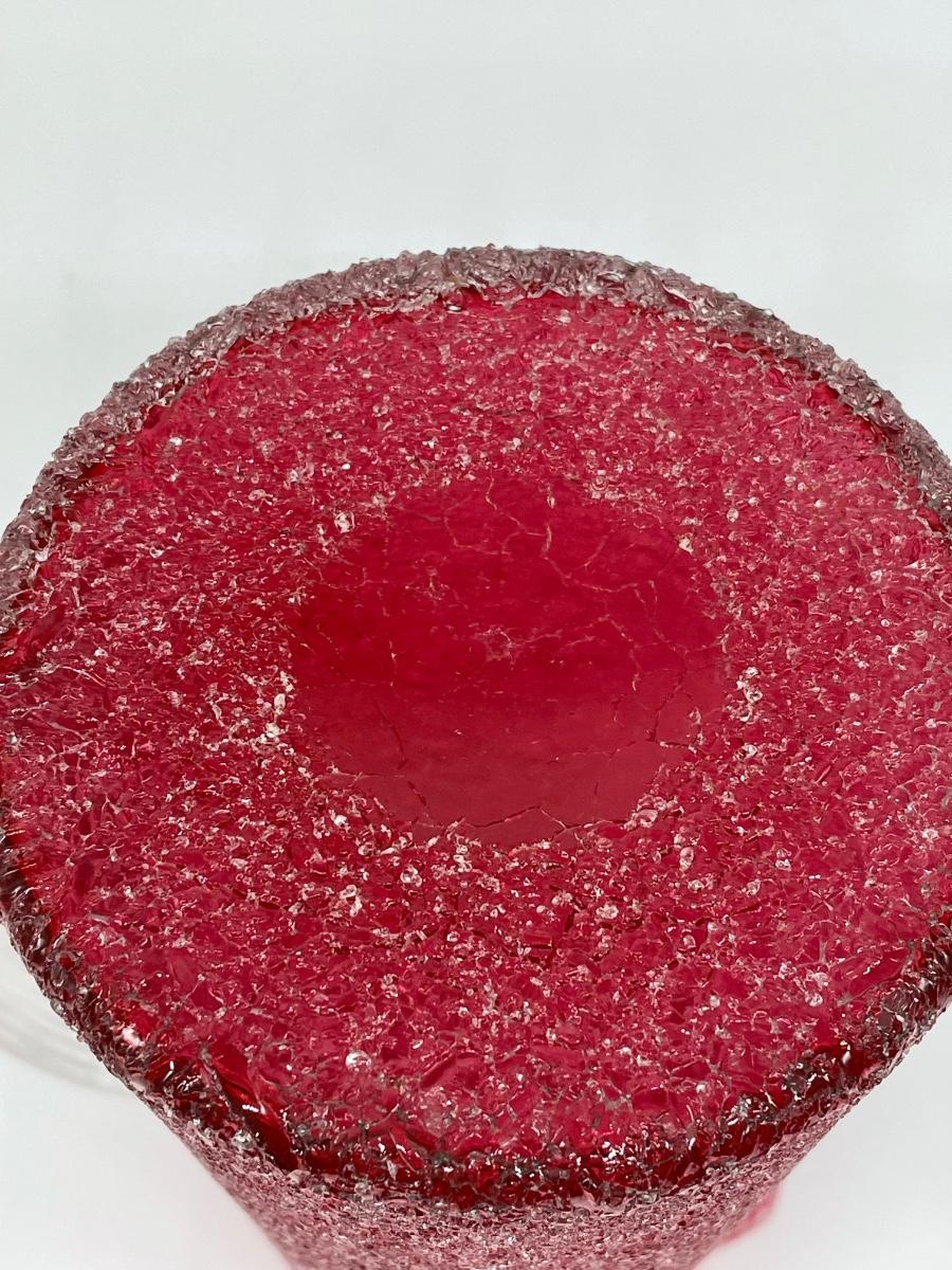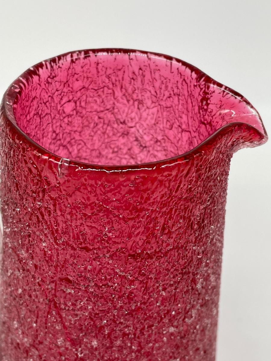 Three Bohemian cranberry crackle glass with clear handle pitchers (8", 7.5" & 6.75" tall)