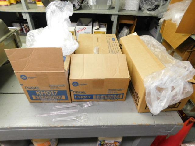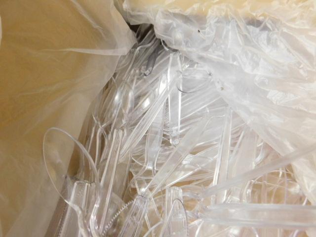 Three Boxes of Plastic To-Go Utensils Forks, Spoons, Cutlery mostly full one box mixed