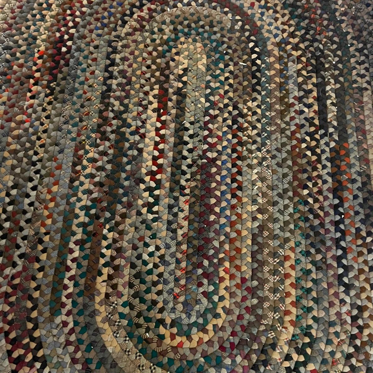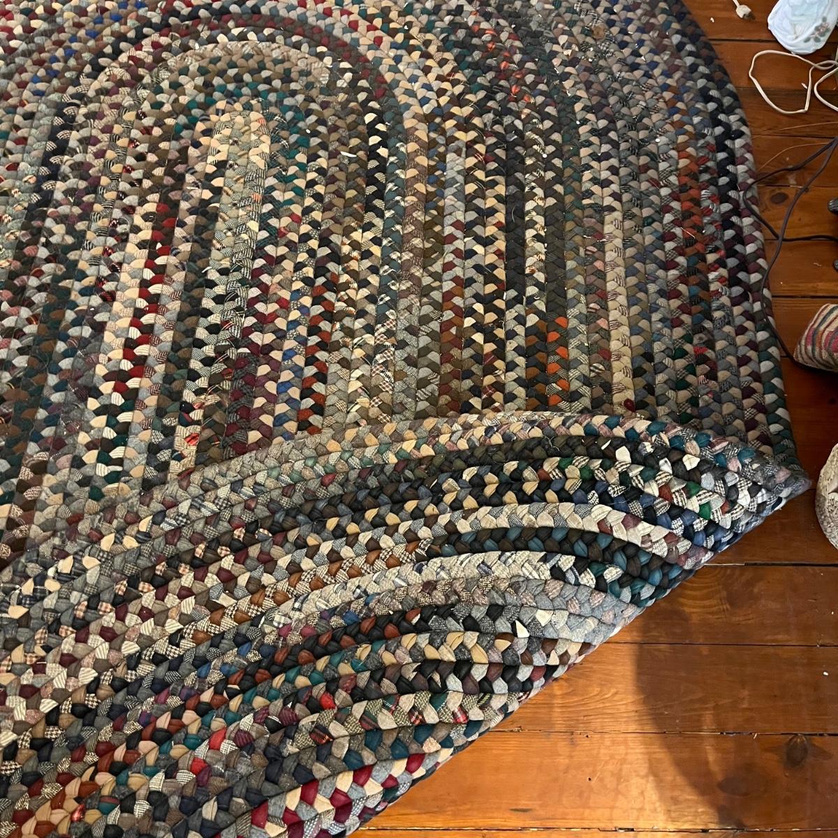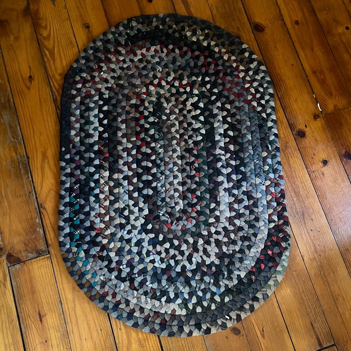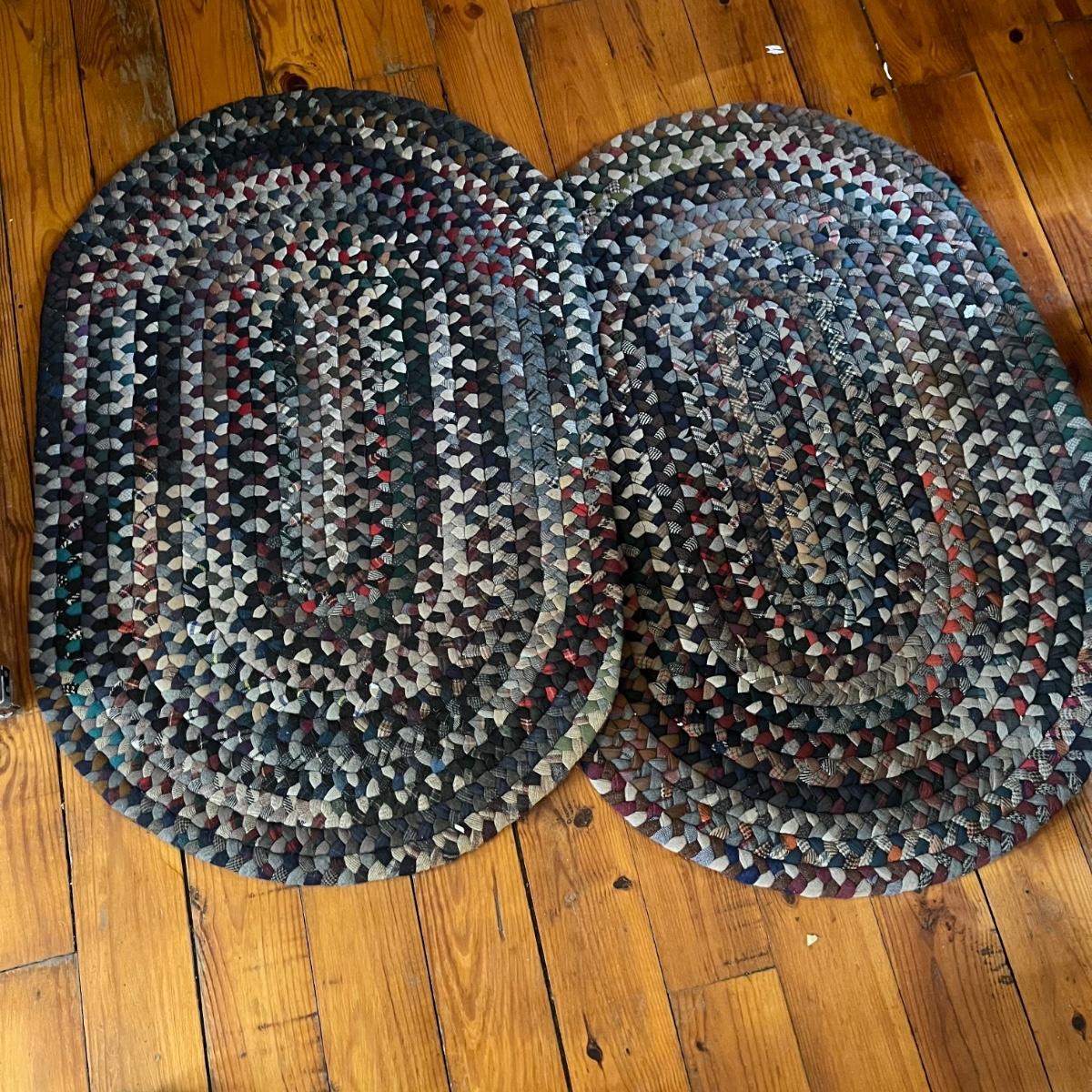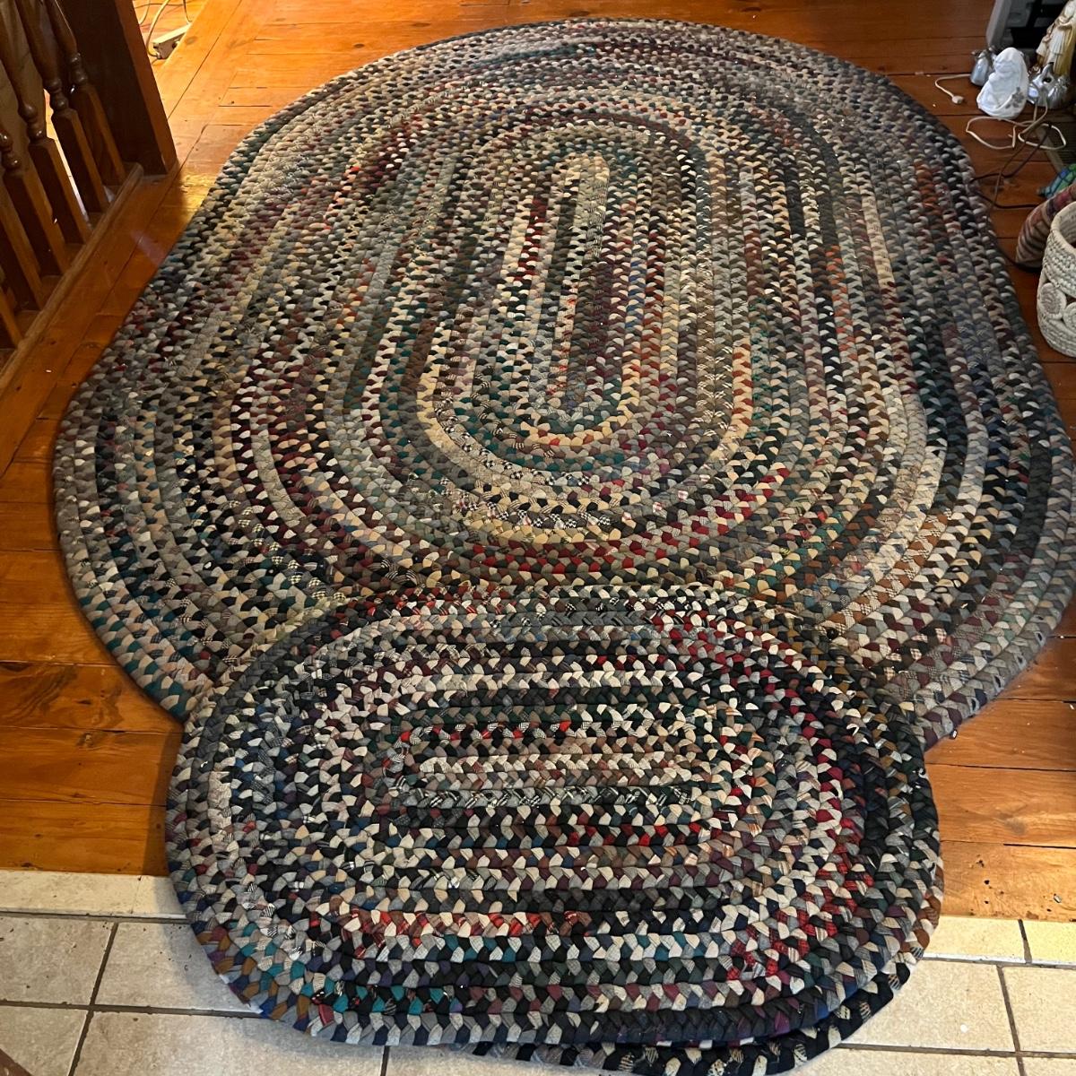 These three rugs are all braided and are matching. Largest rug measures 68” x 102” and two smaller rugs measure 25” x 37”. You'll find a matching rectangular rug earlier in the auction.