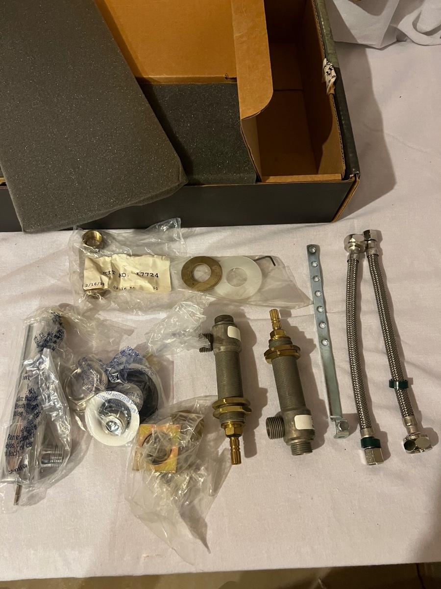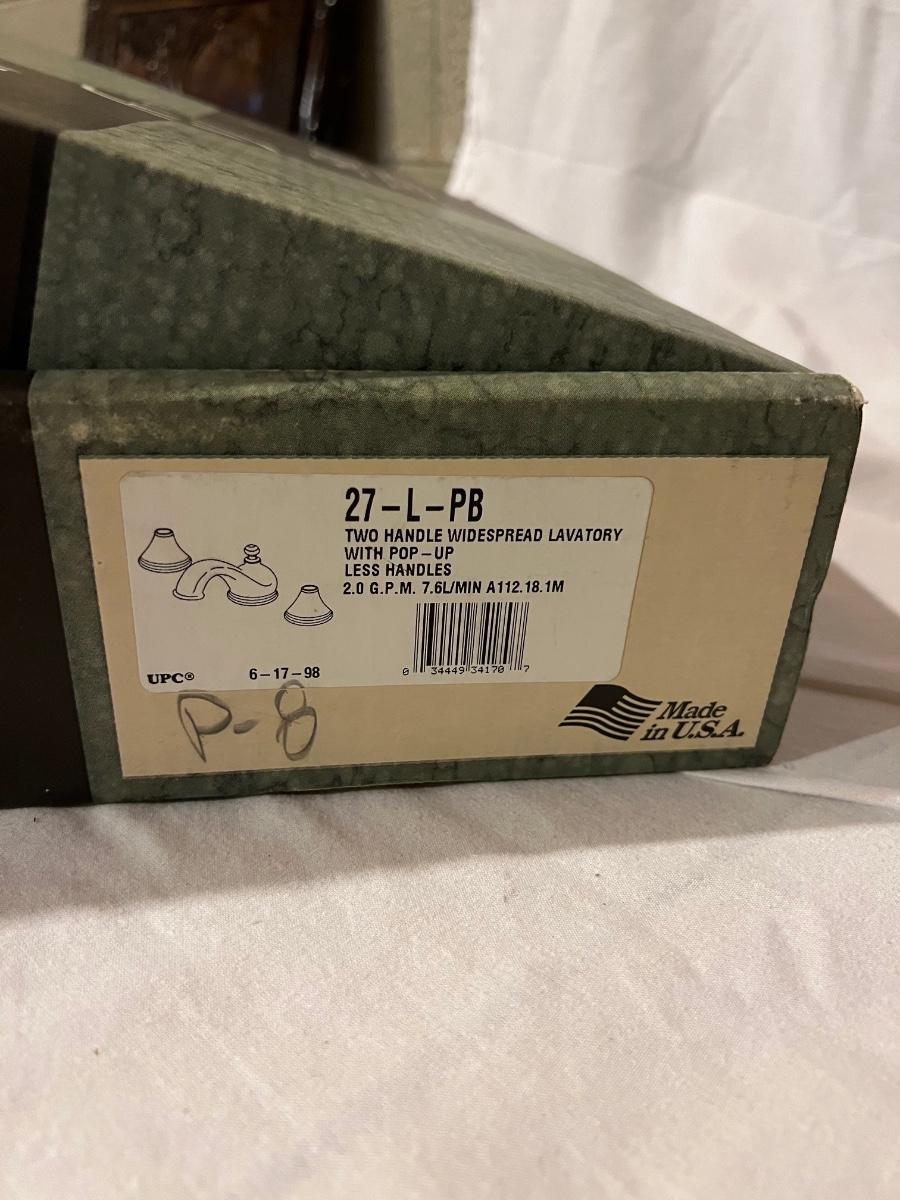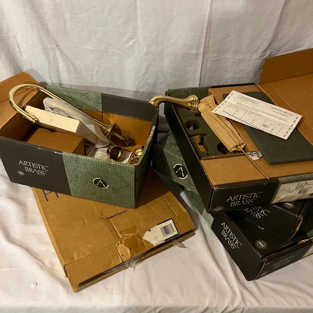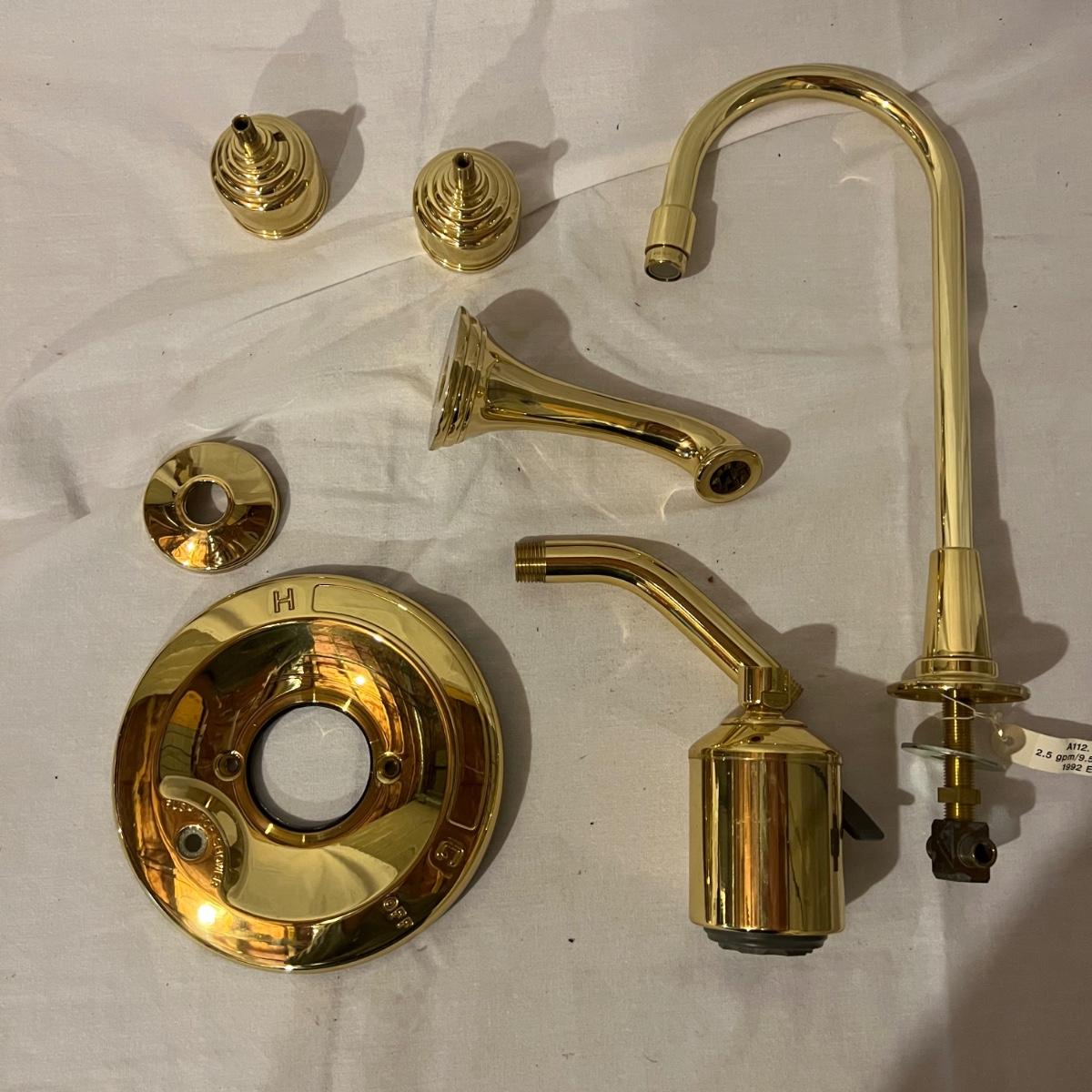 Three new in box Artistic Brass 27-L-PN two handle widespread lavatory with pop-up less handles. Additionally, an assortment of artistic brass pieces in parts for a tall faucet, shower, and towel ring. A Kohler