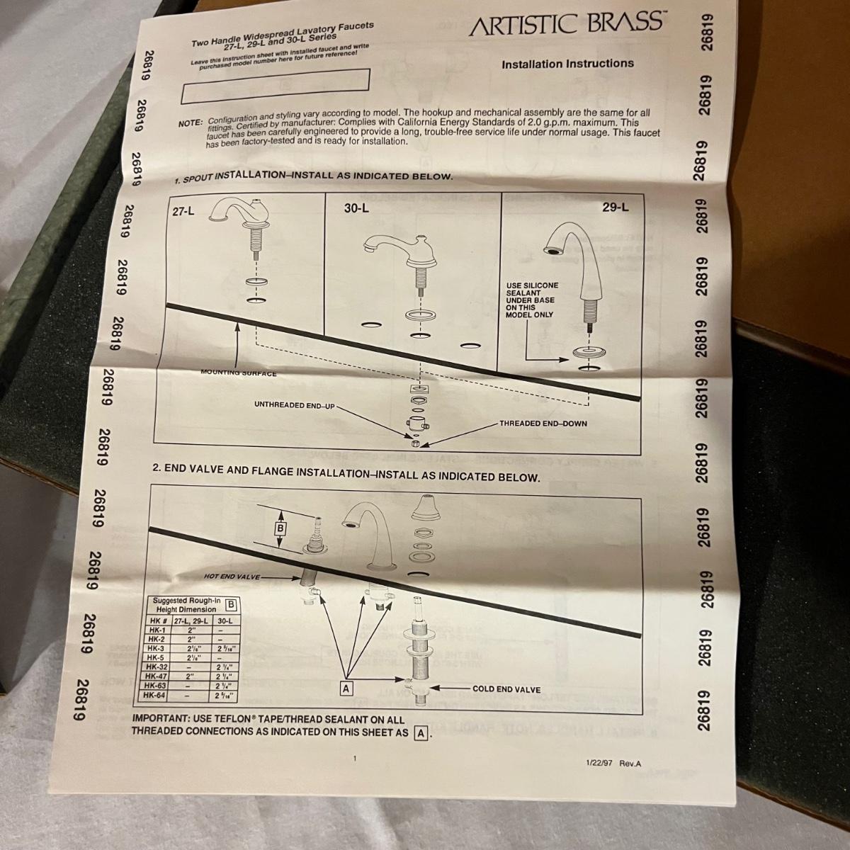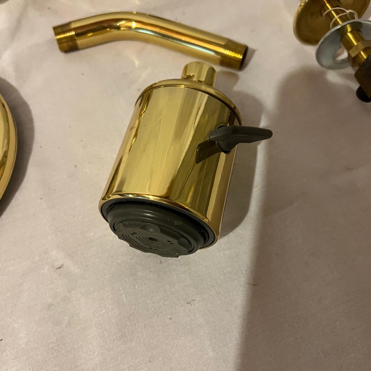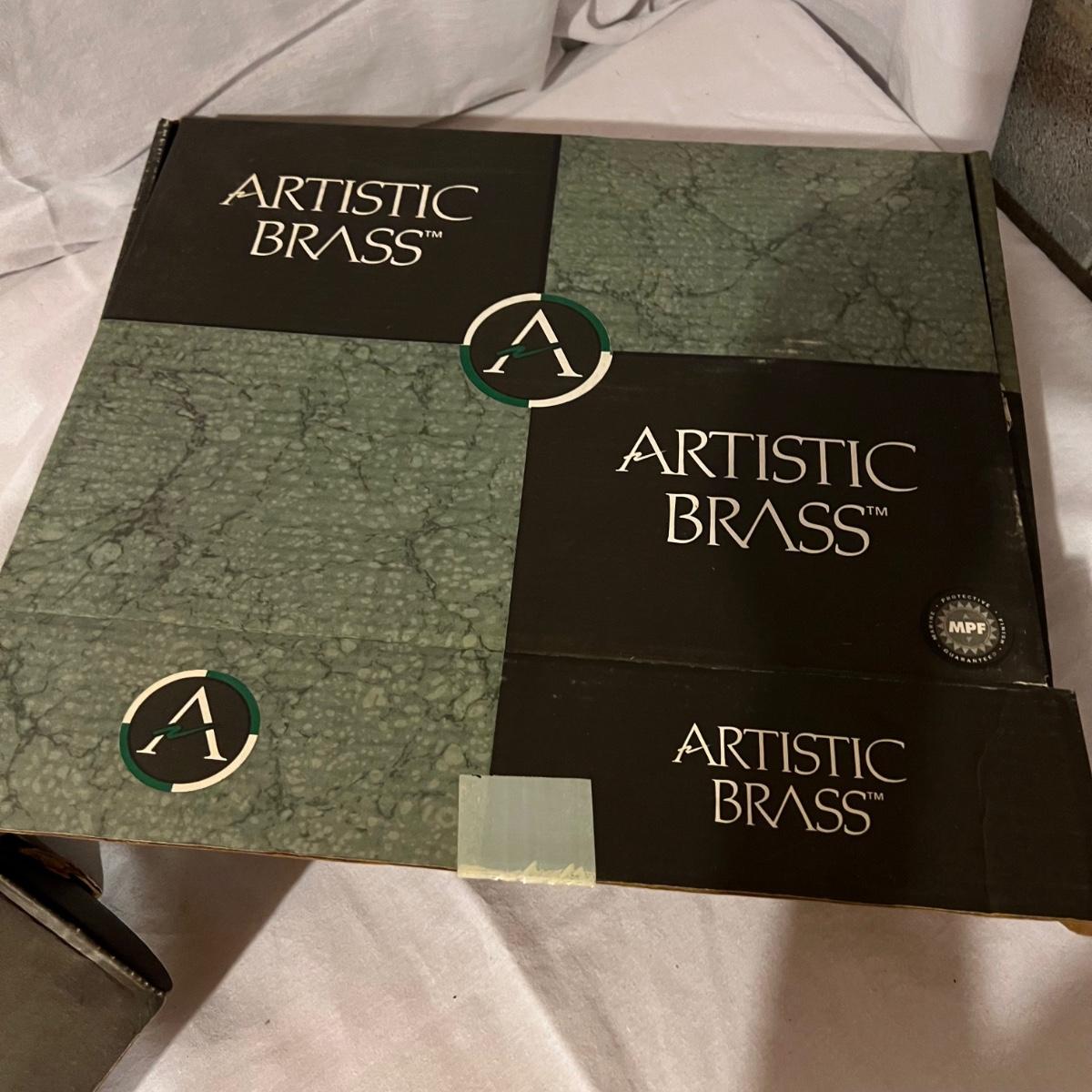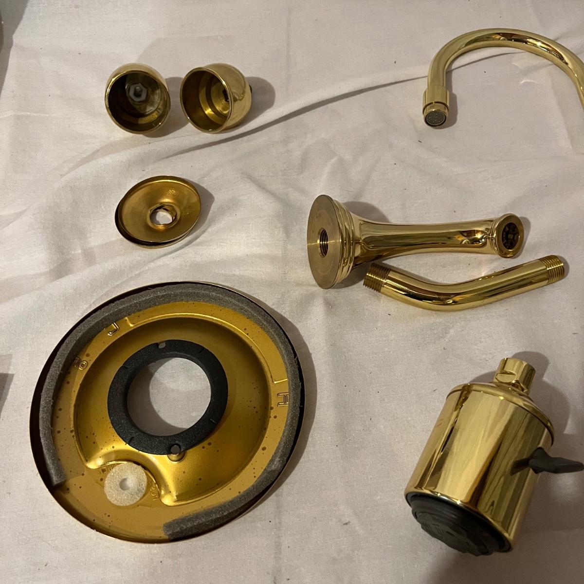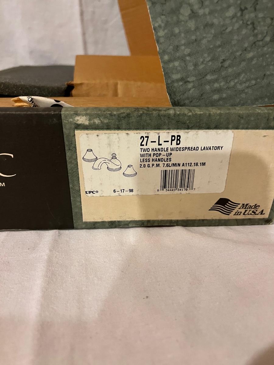 Three new in box Artistic Brass 27-L-PN two handle widespread lavatory with pop-up less handles. Additionally, an assortment of artistic brass pieces in parts for a tall faucet, shower, and towel ring. A Kohler