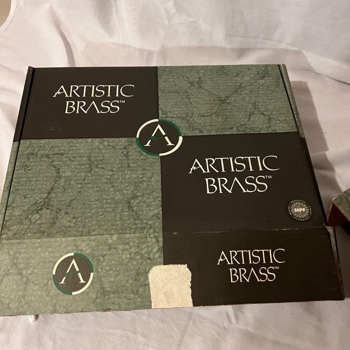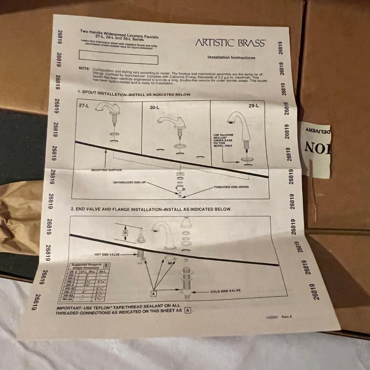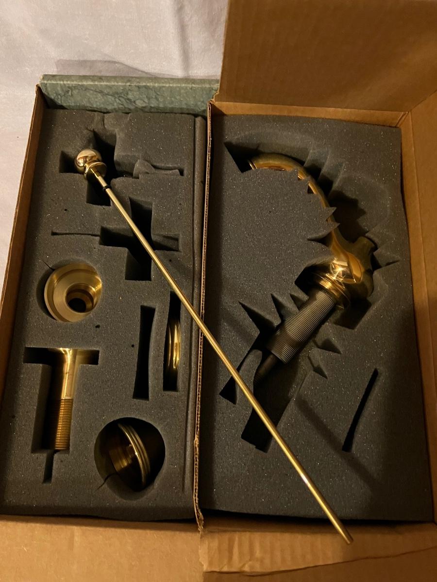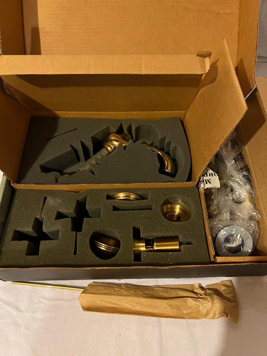 Three new in box Artistic Brass 27-L-PN two handle widespread lavatory with pop-up less handles. Additionally, an assortment of artistic brass pieces in parts for a tall faucet, shower, and towel ring. A Kohler