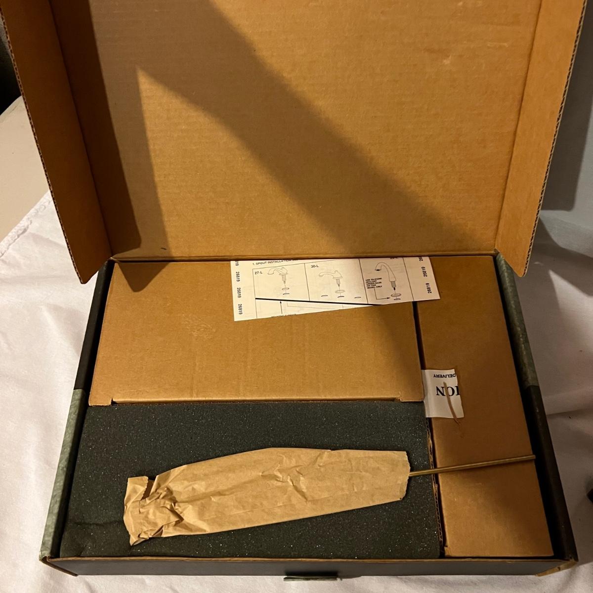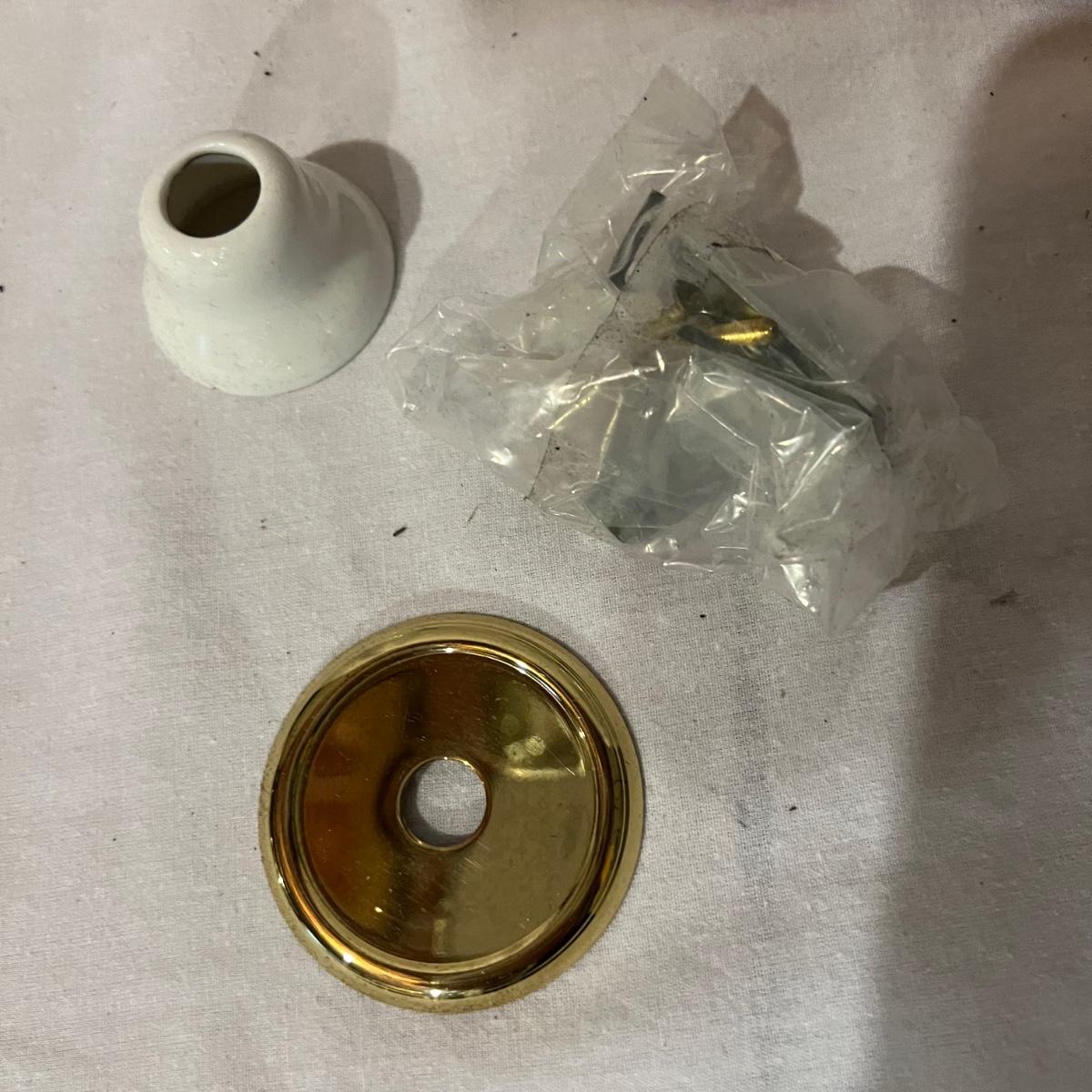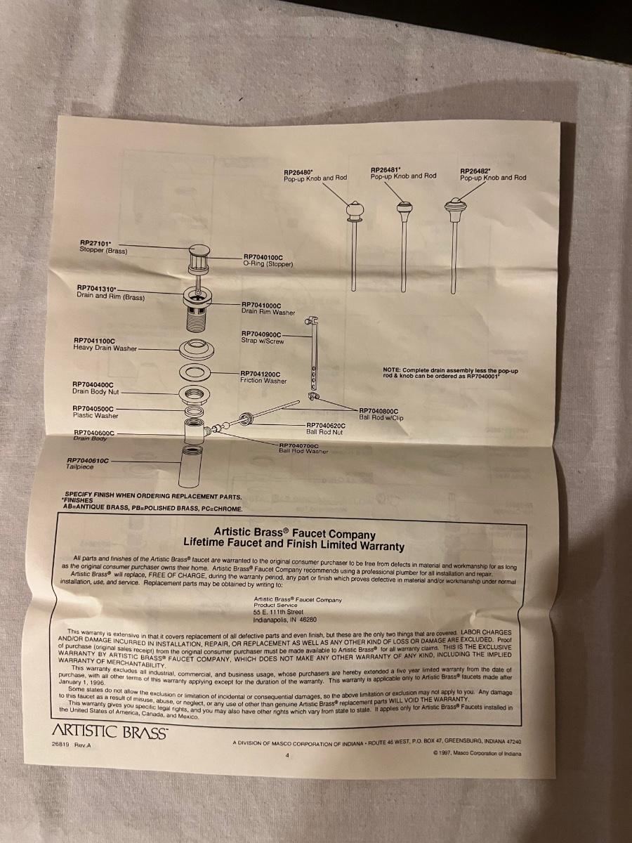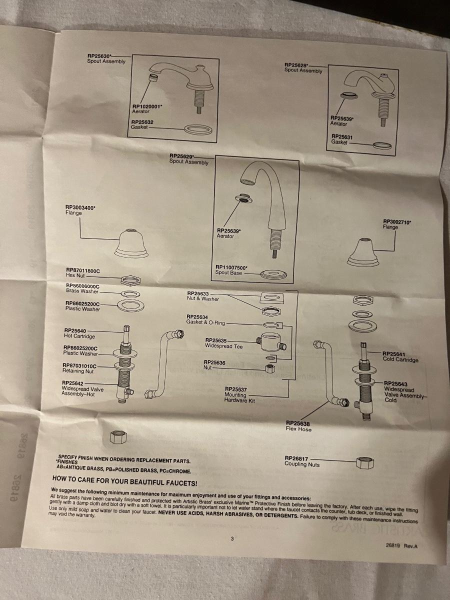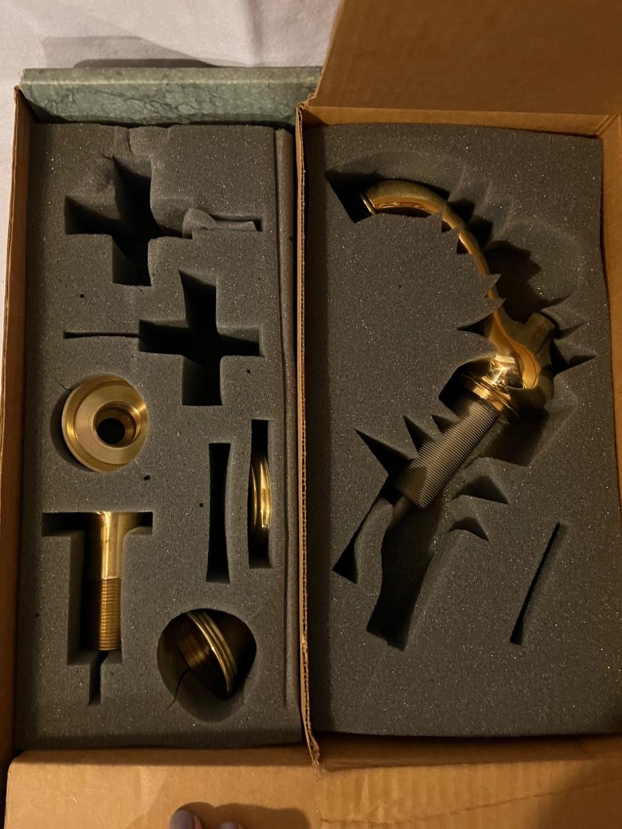Three new in box Artistic Brass 27-L-PN two handle widespread lavatory with pop-up less handles. Additionally, an assortment of artistic brass pieces in parts for a tall faucet, shower, and towel ring. A Kohler