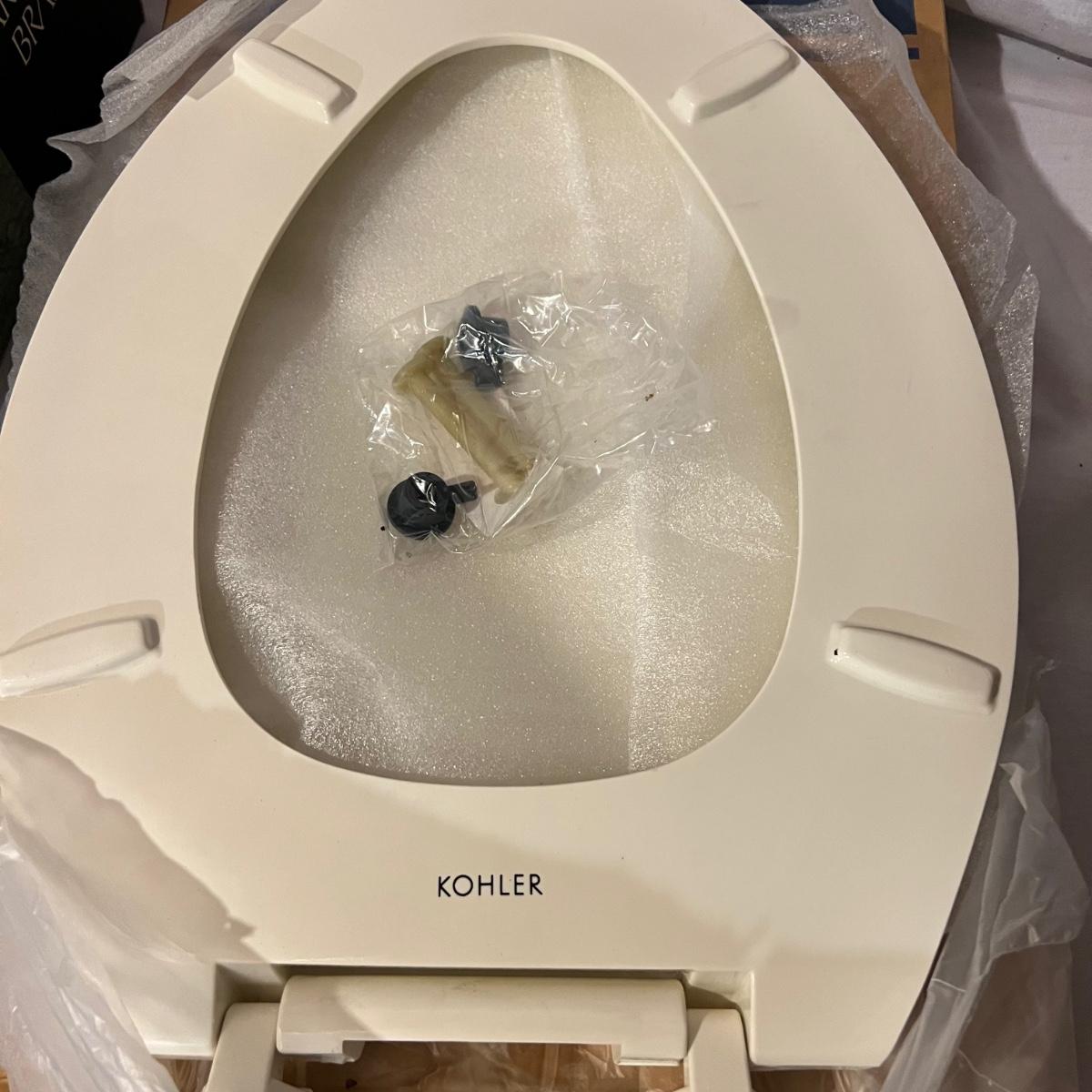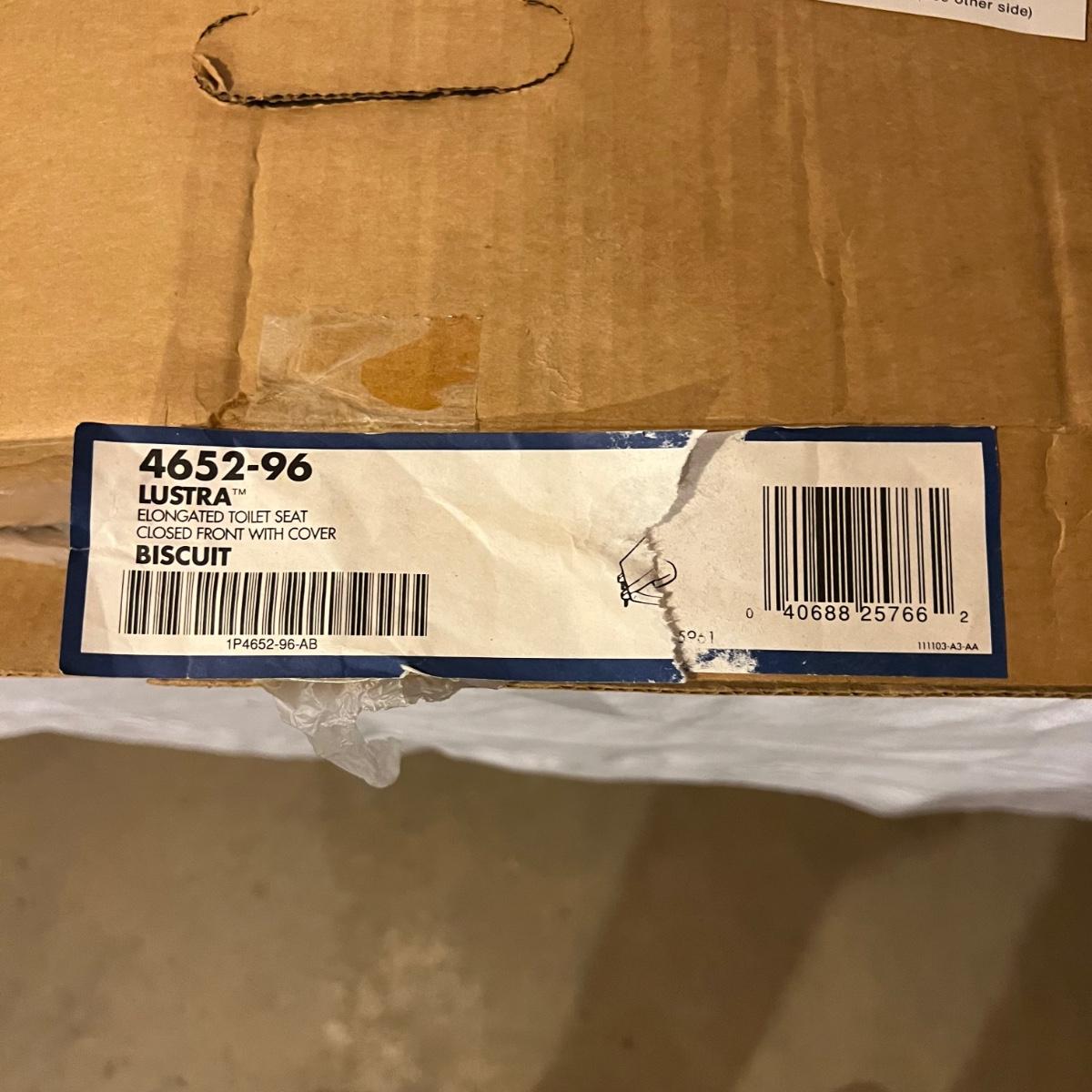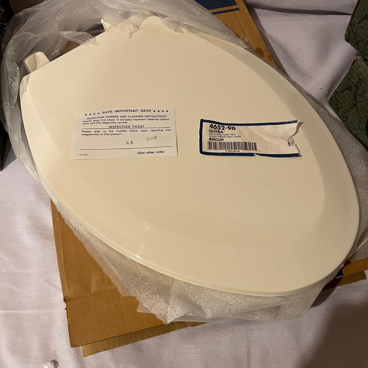 Biscuit colored toilet seat new in the box that measures approximately 14" x 18.5" x 2"H. Local pick up only.