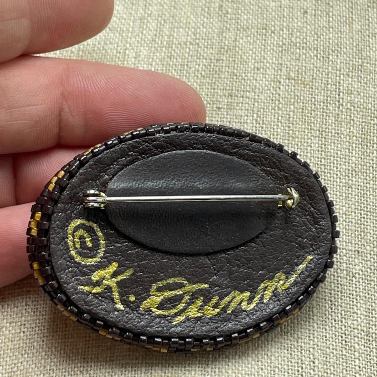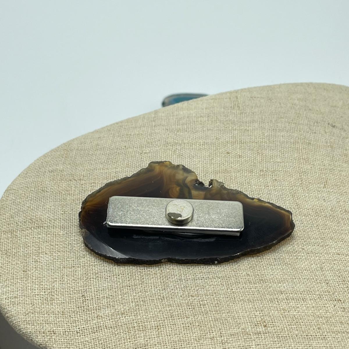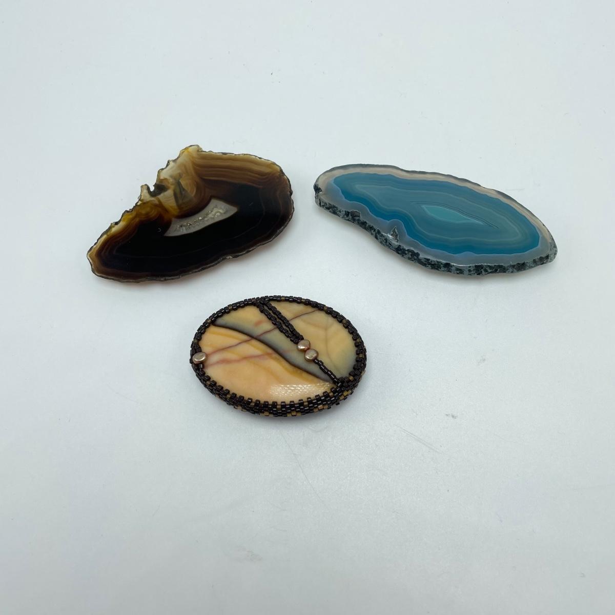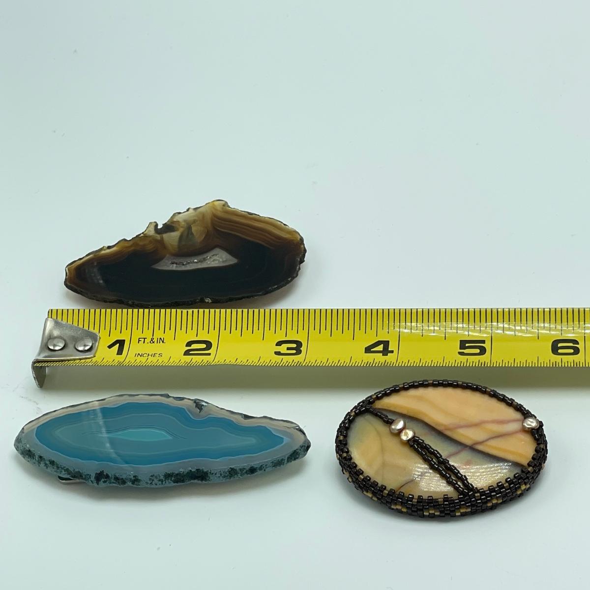 Three stunning brooches, one with a beaded border and K Dunn signature. This brooch is missing it’s clasp to securely close. The other two geode like are magnetic, leaving no pin holes in shirts. See images. Shipping available.