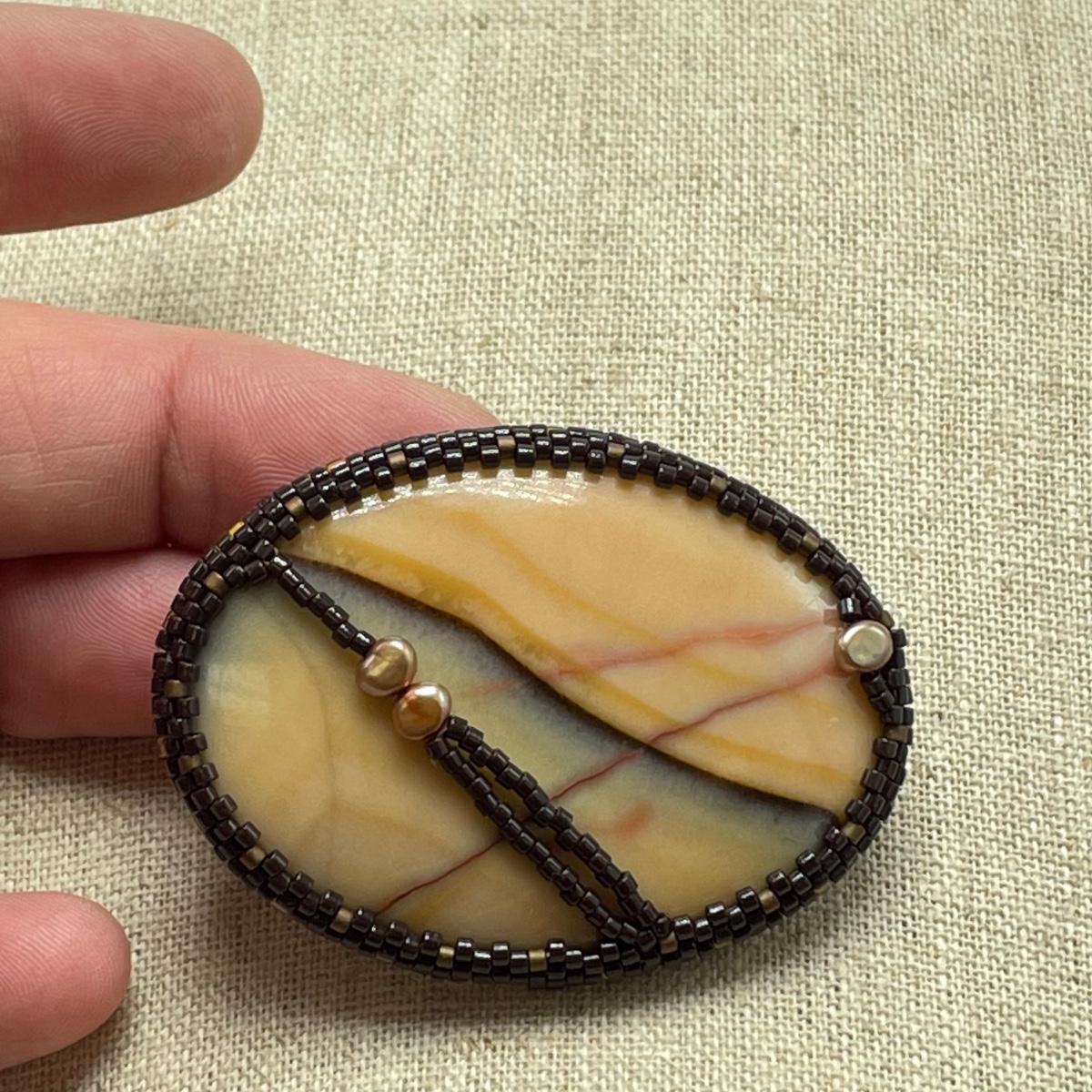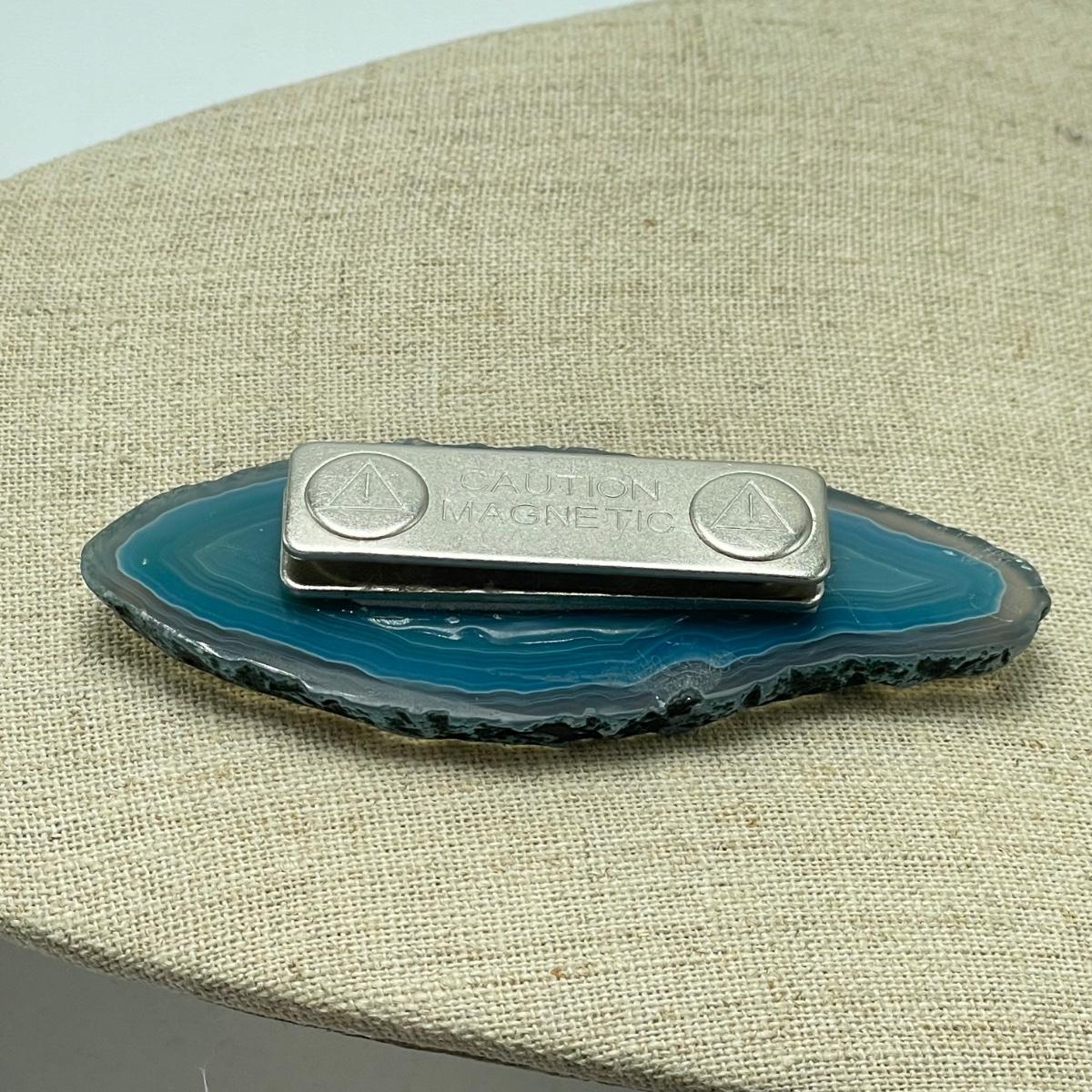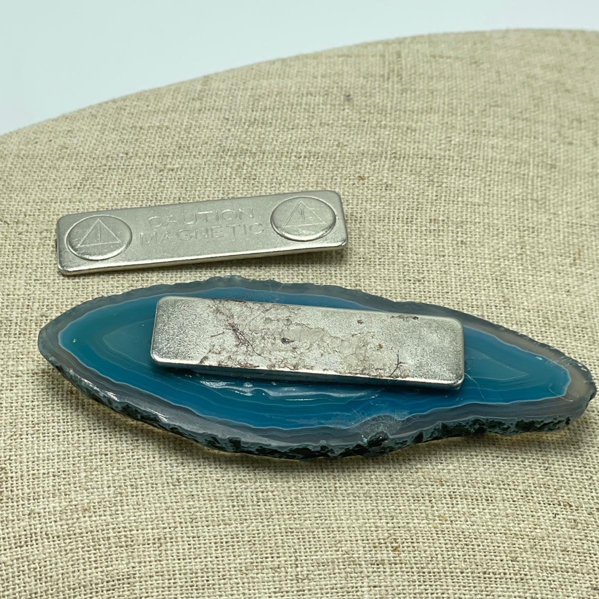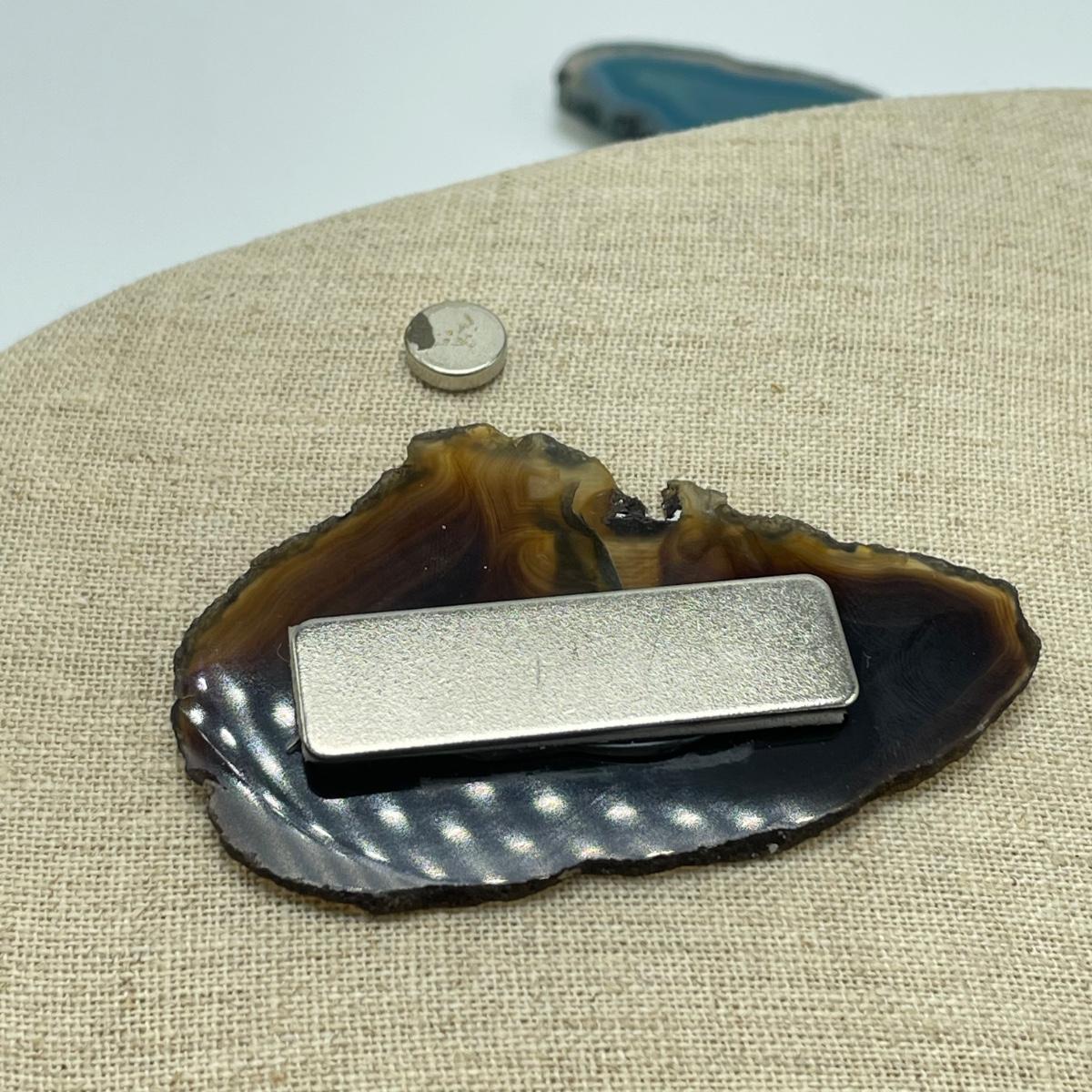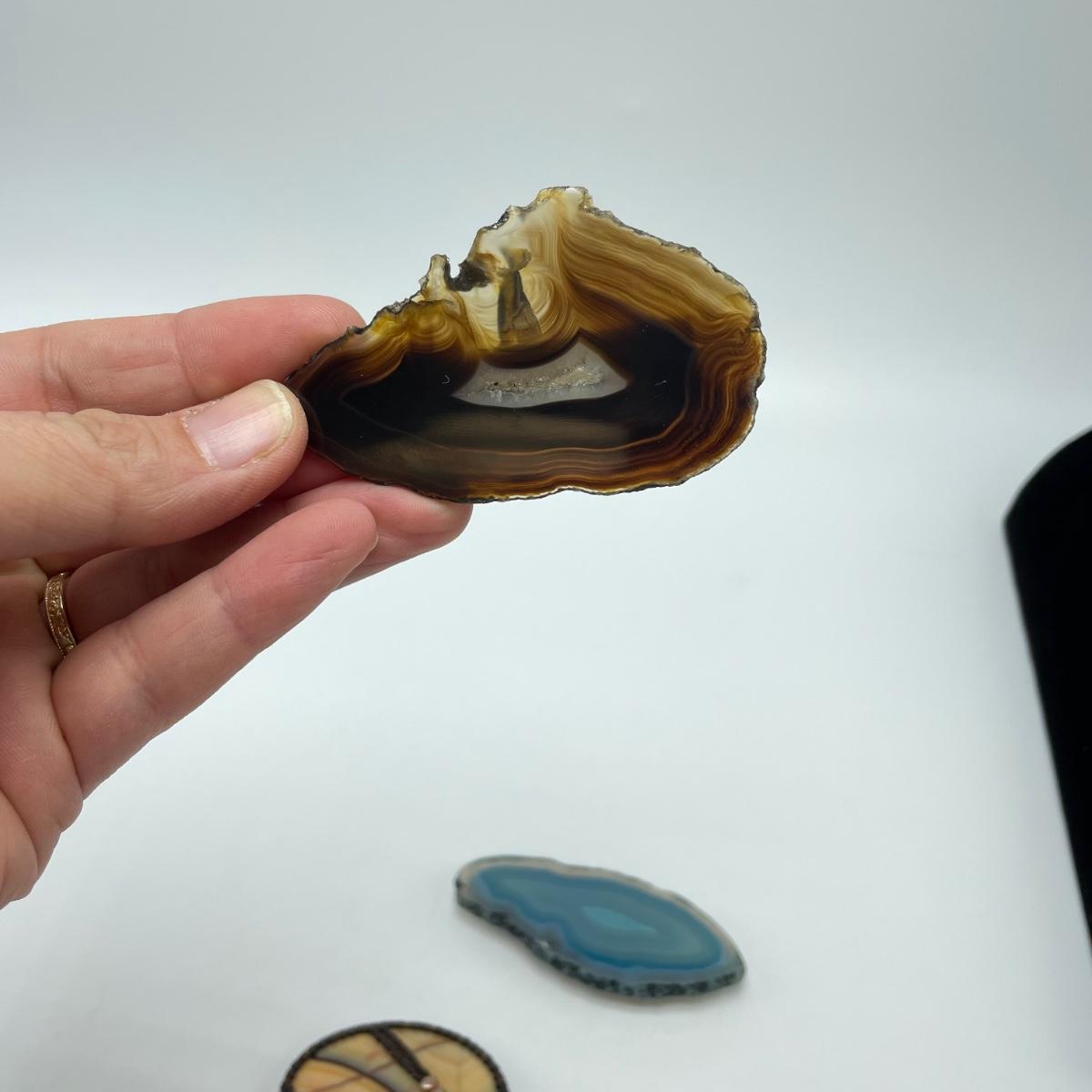 Three stunning brooches, one with a beaded border and K Dunn signature. This brooch is missing it’s clasp to securely close. The other two geode like are magnetic, leaving no pin holes in shirts. See images. Shipping available.
